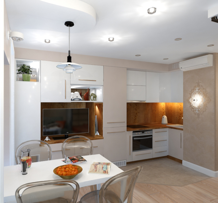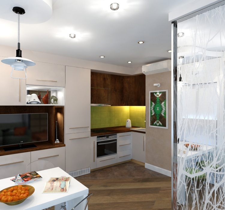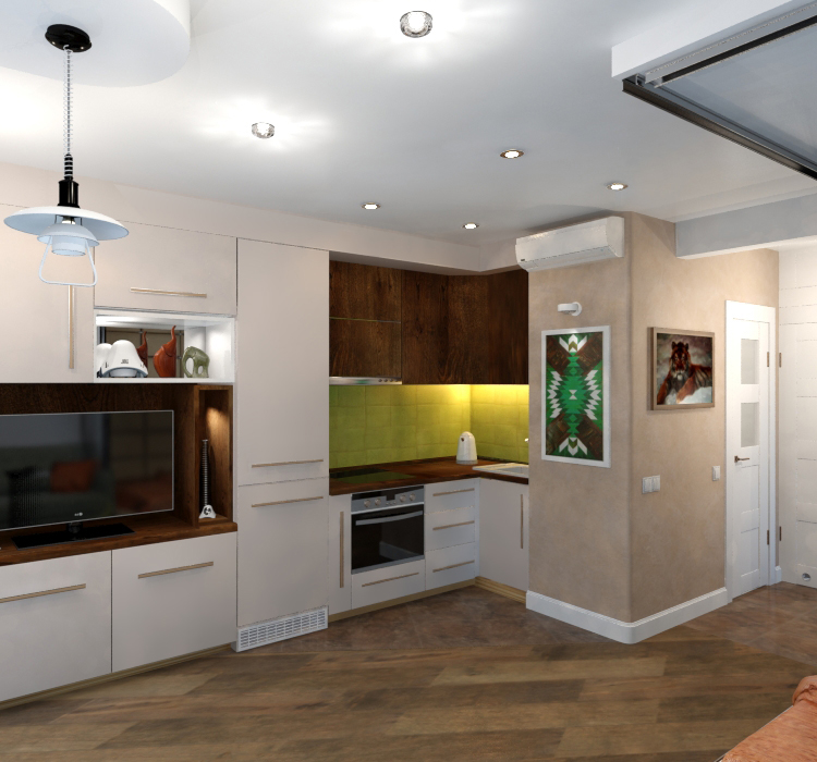 Природные оттенки прихожей хотелось продолжить в жилой комнате, где места для хранения и кухня образовали единую систему шкафов вдоль стены.