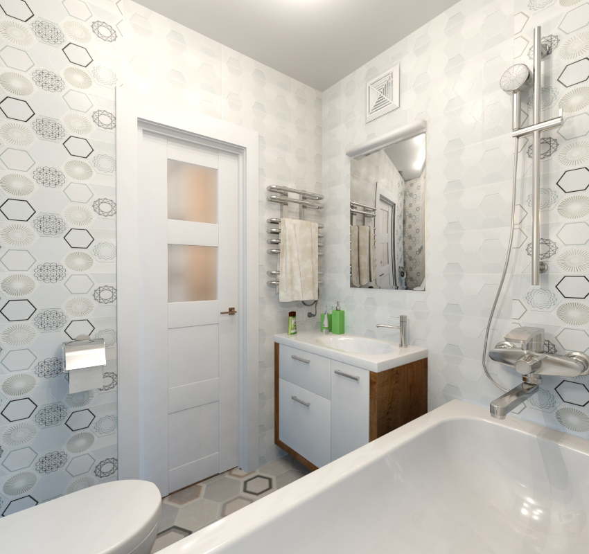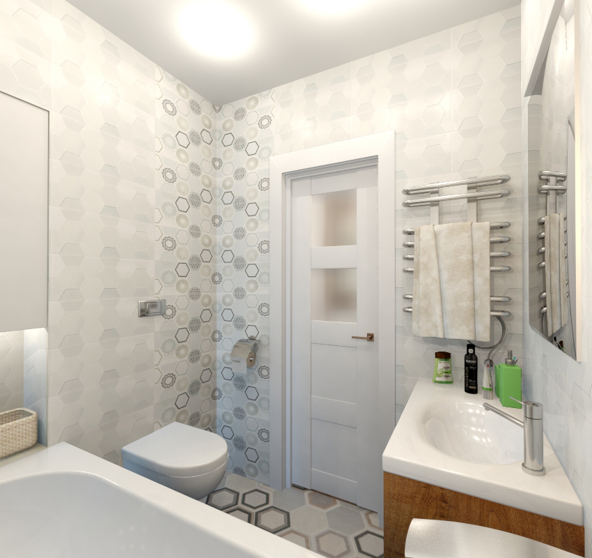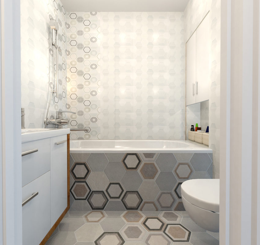 Компактный санузел решено было не перегружать темными цветами. Для него подобрали белую плитку с рисунком в виде шестигранников. Пол и фартук фанны выложили подходящей испанской плиткой шестиугольной формы.