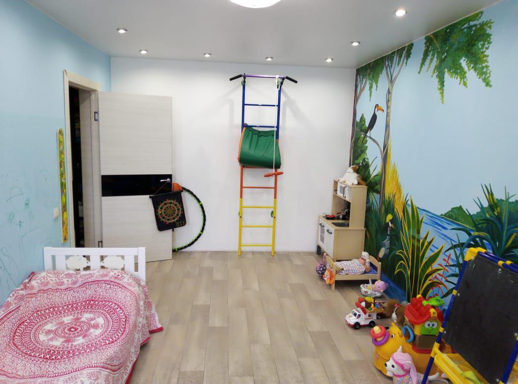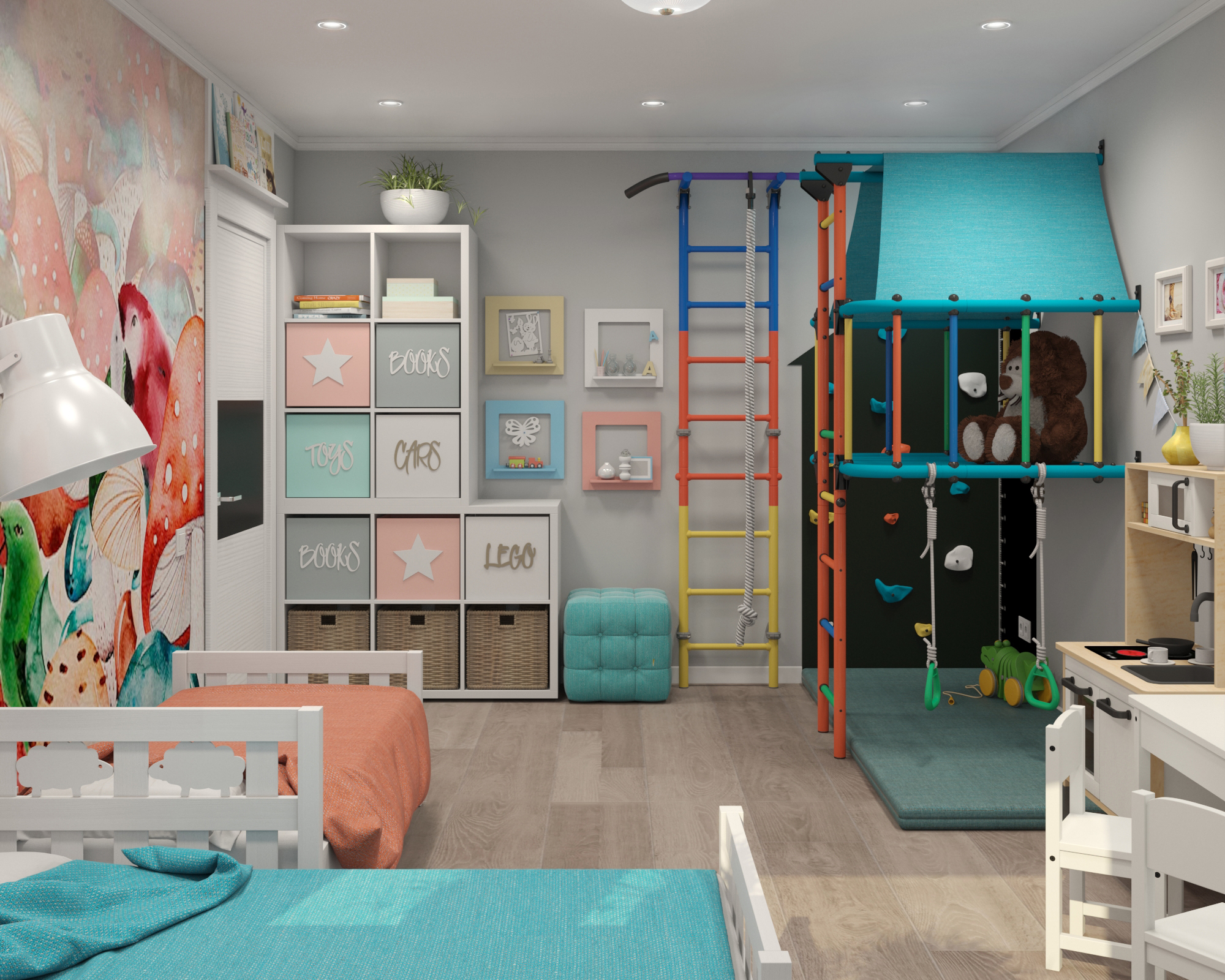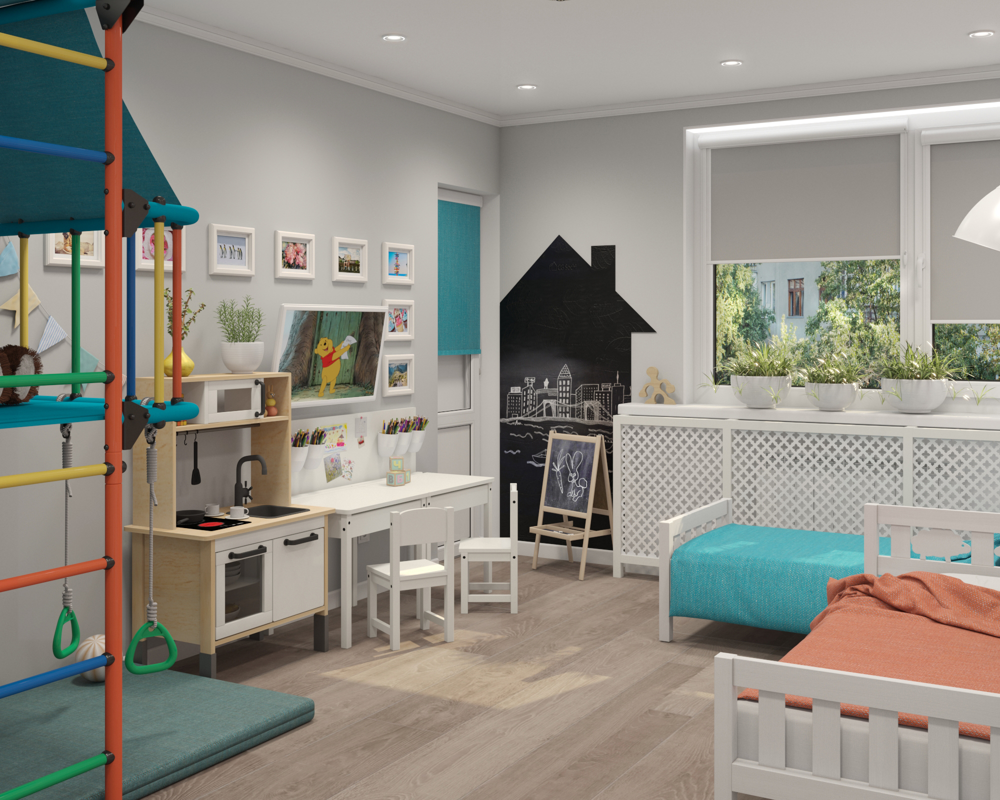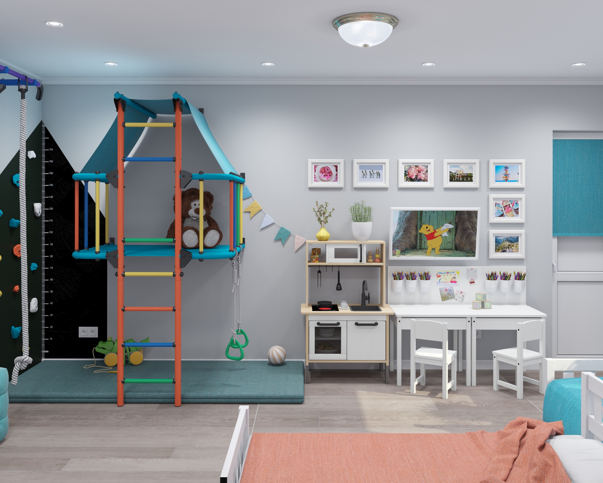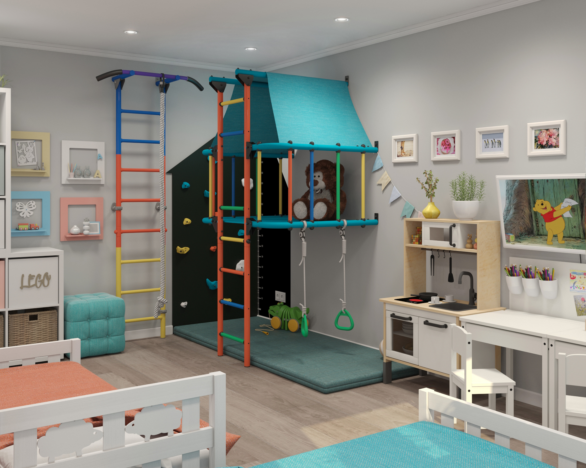 В детской мы сохранили прежние кровати, детскую кухню, мольберт, телевизор, шведскую стенку. Добавили стену для рисования, созданную при помощи грифельной краски, столы для детского творчества, спорткомплекс со стеной для скалолазания и "домиком" на втором этаже, стеллаж для игрушек у двери