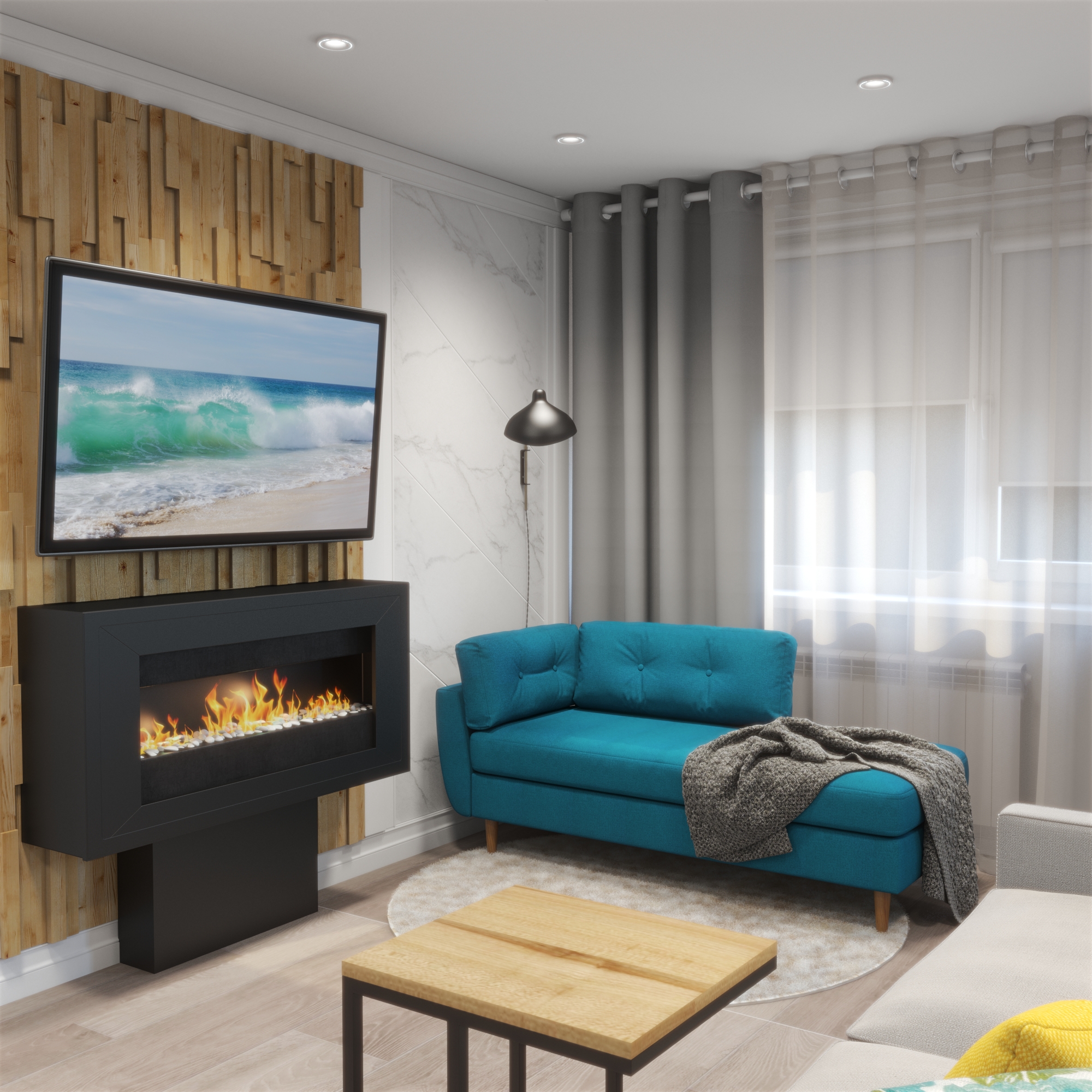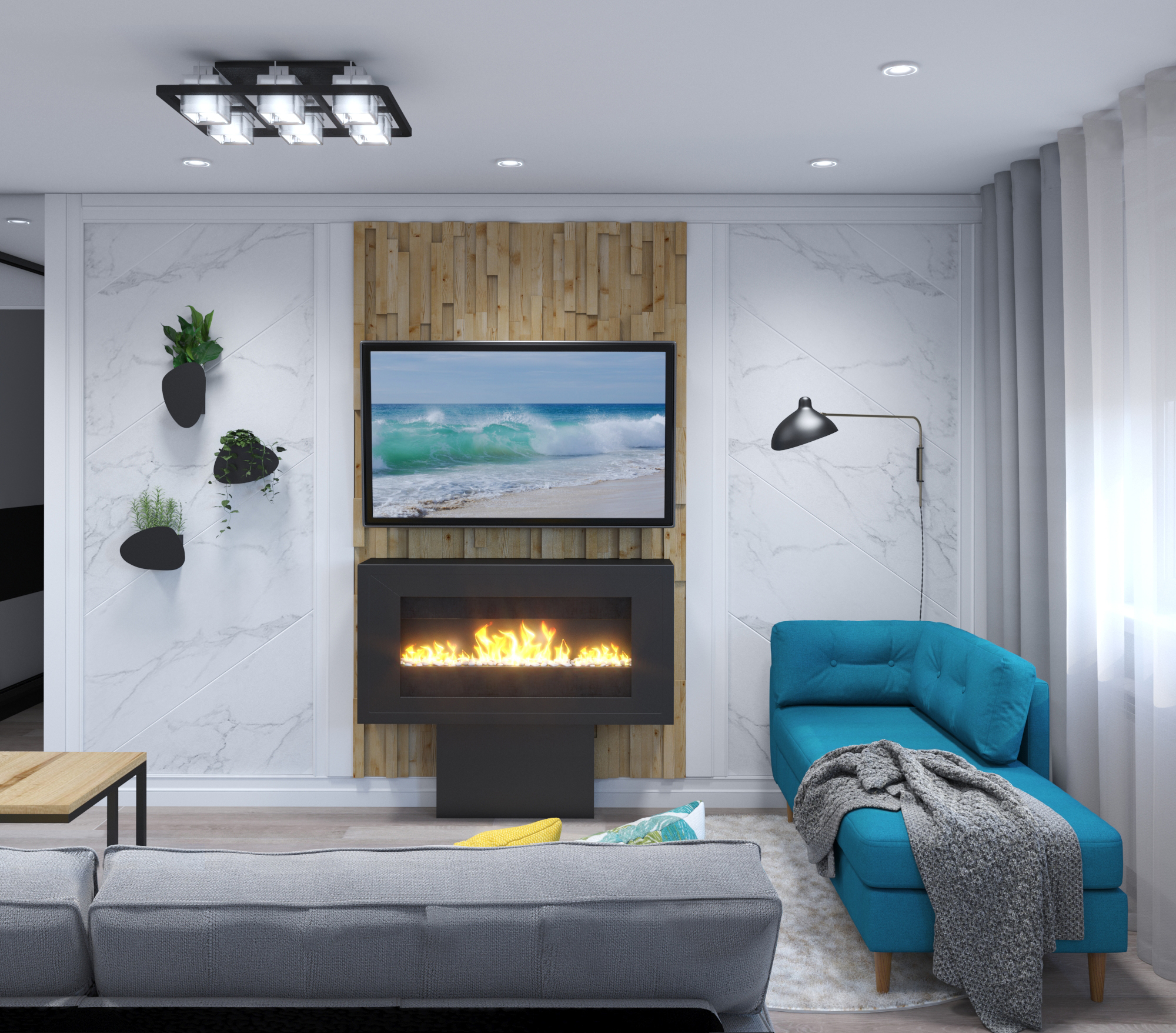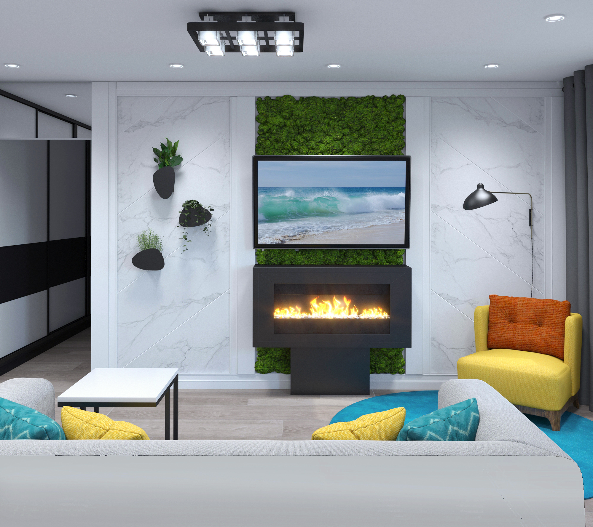 Заказчикам хотелось больше зелени, поэтому сначала мы примерили стабилизированный мох для оформления стены над камином. Но в финальных вариантах дизайна заменили его панелью из натурального дерева. Выбор был обусловлен простотой ухода и большей долговечностью