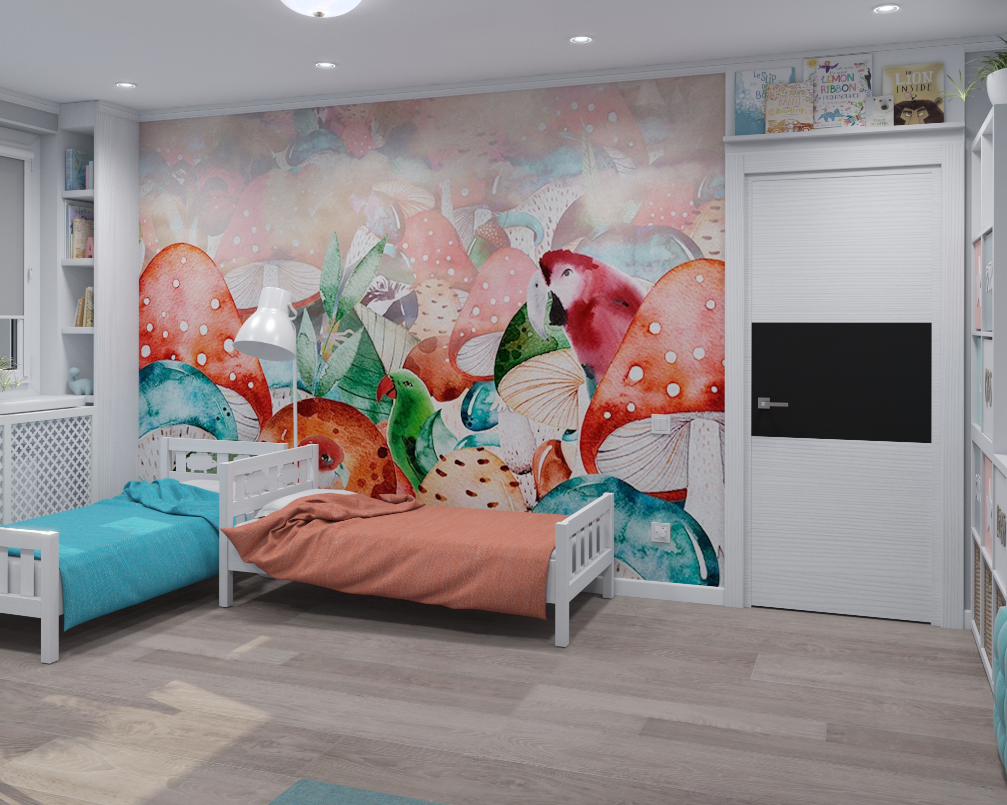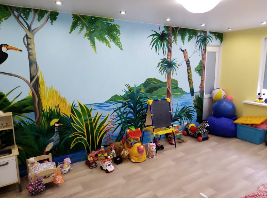 Роспись на стене, которой пришлось пожертвовать. Поскольку она была очень яркой, полностью закрасить ее не получилось и потребовалась замена обоев