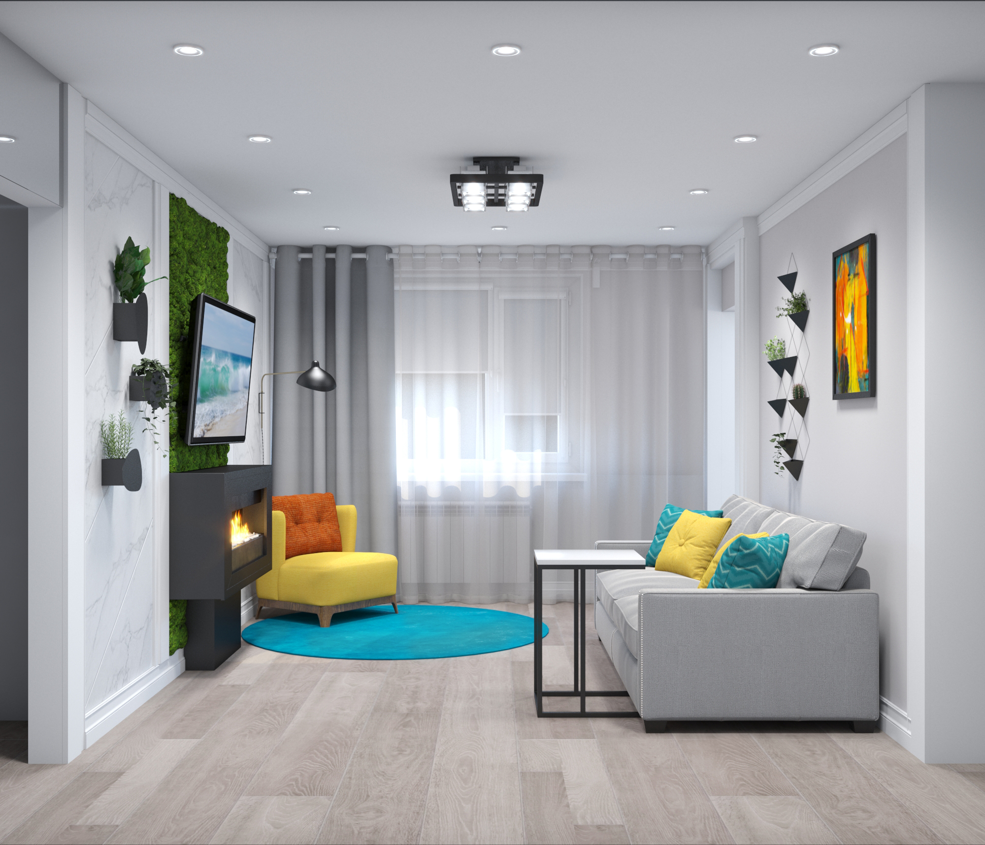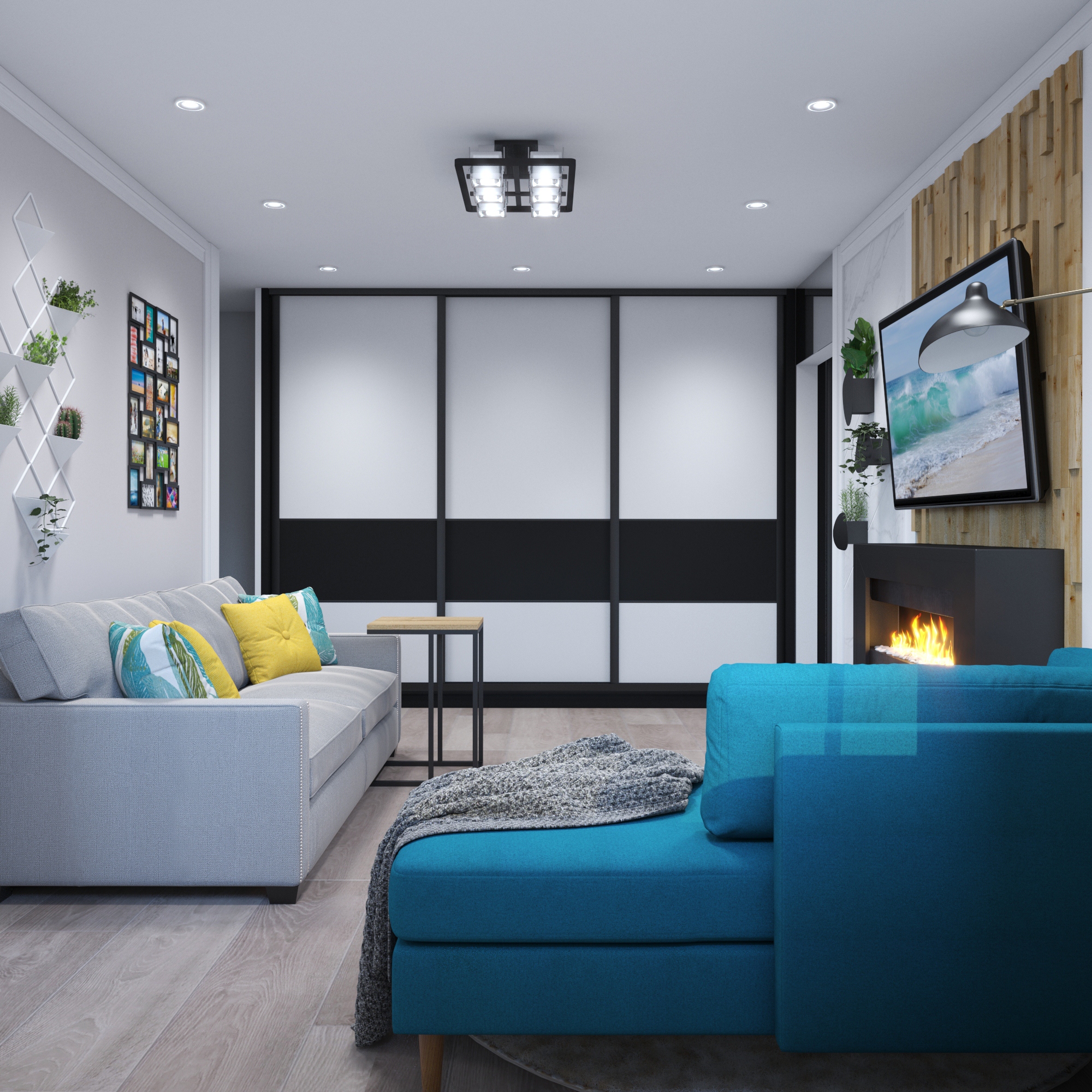 Светильники, черный электрический камин и контрастный черно-белый шкаф-купе заставили меня поддержать общую высокотехнологичную направленность помещения. Но поскольку заказчице не хватало в гостиной ощущения уюта, я решила обратиться к неоклассическому стилю. Он не спорит с современным минимализмом, но делает интерьер более спокойным и гостеприимным