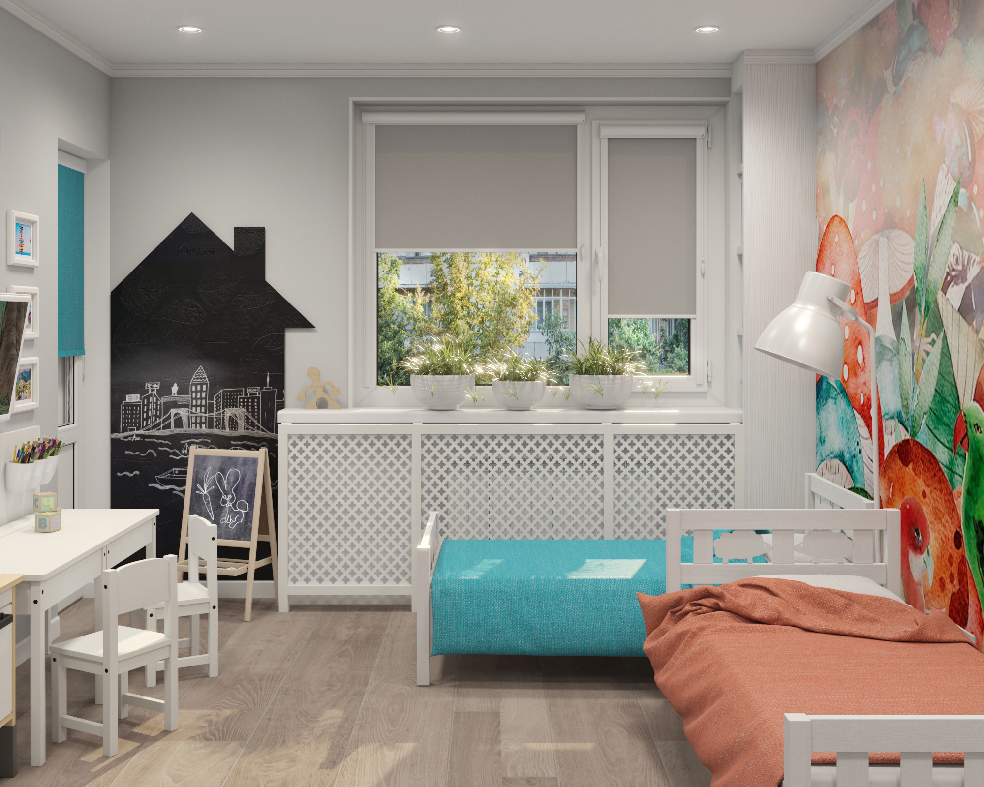Площадь комнат для редизайна — 15,3 квадратных метра (детская) + 17 квадратных метров (проходная гостиная)
