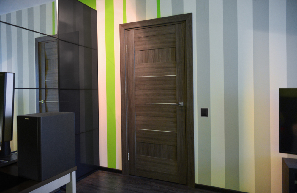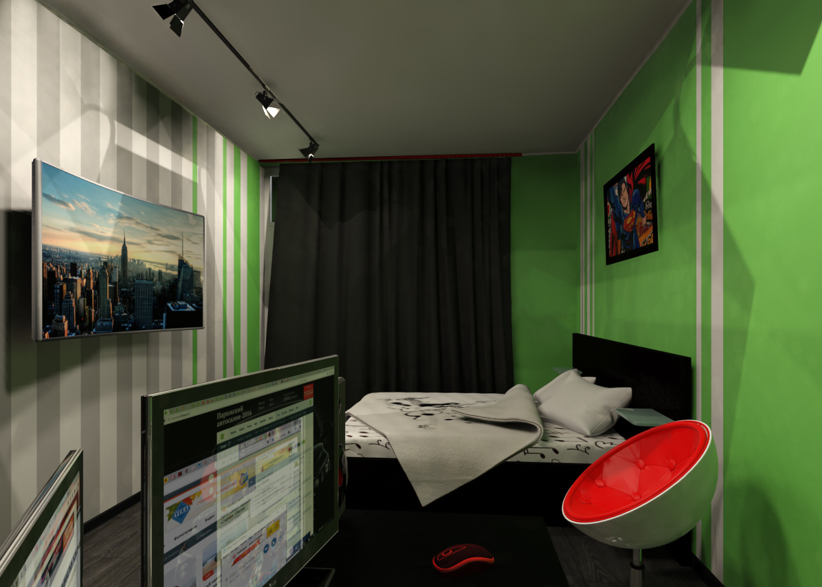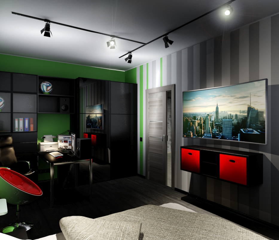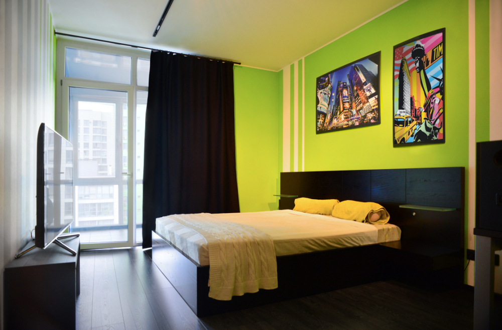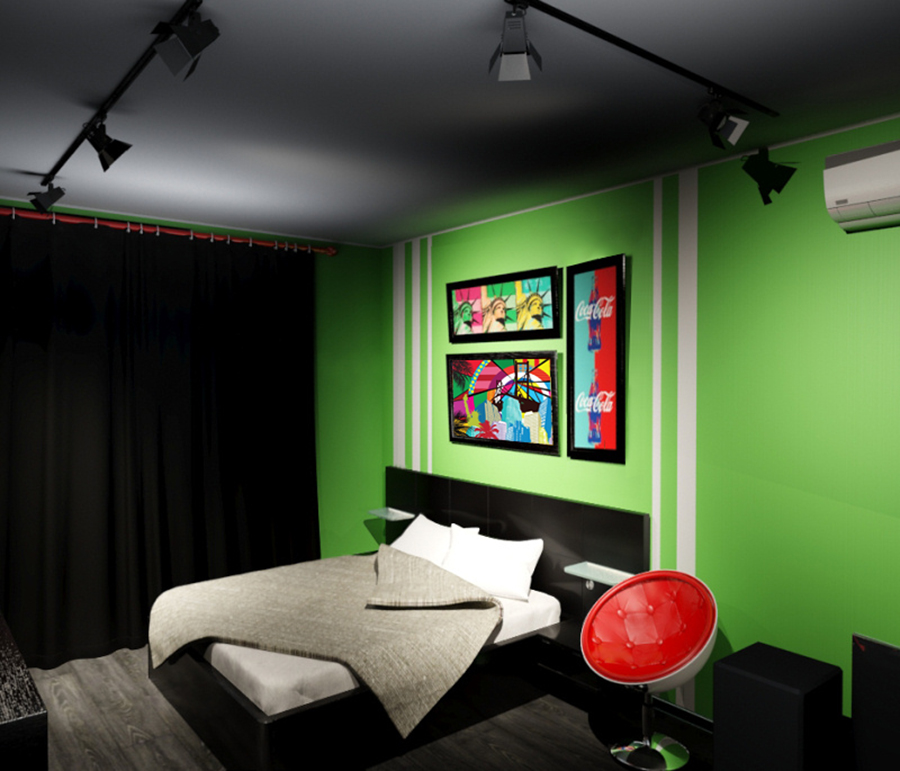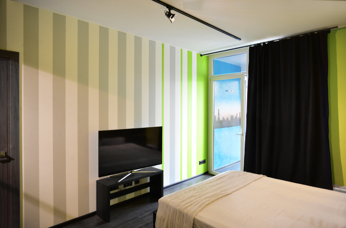 Стены выкрашены в салатовый с белыми и серыми полосками - их очередность и ширину подобрал сам владелец. Черный плинтус и трек-система на потолке усиливают контраст.