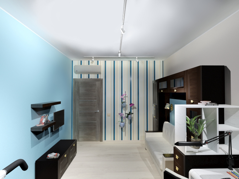 Для гостиной - женской комнаты - была подобрана более сдержанная цветовая гамма. Основные цвета - небесно-голубой, светло-бежевый и шоколадный.