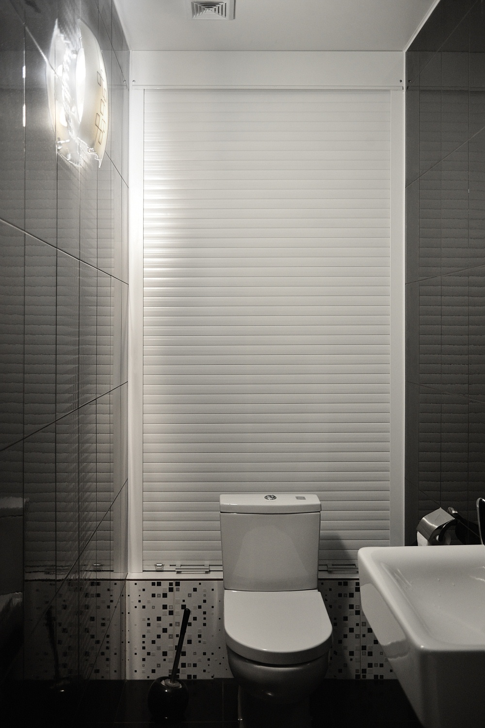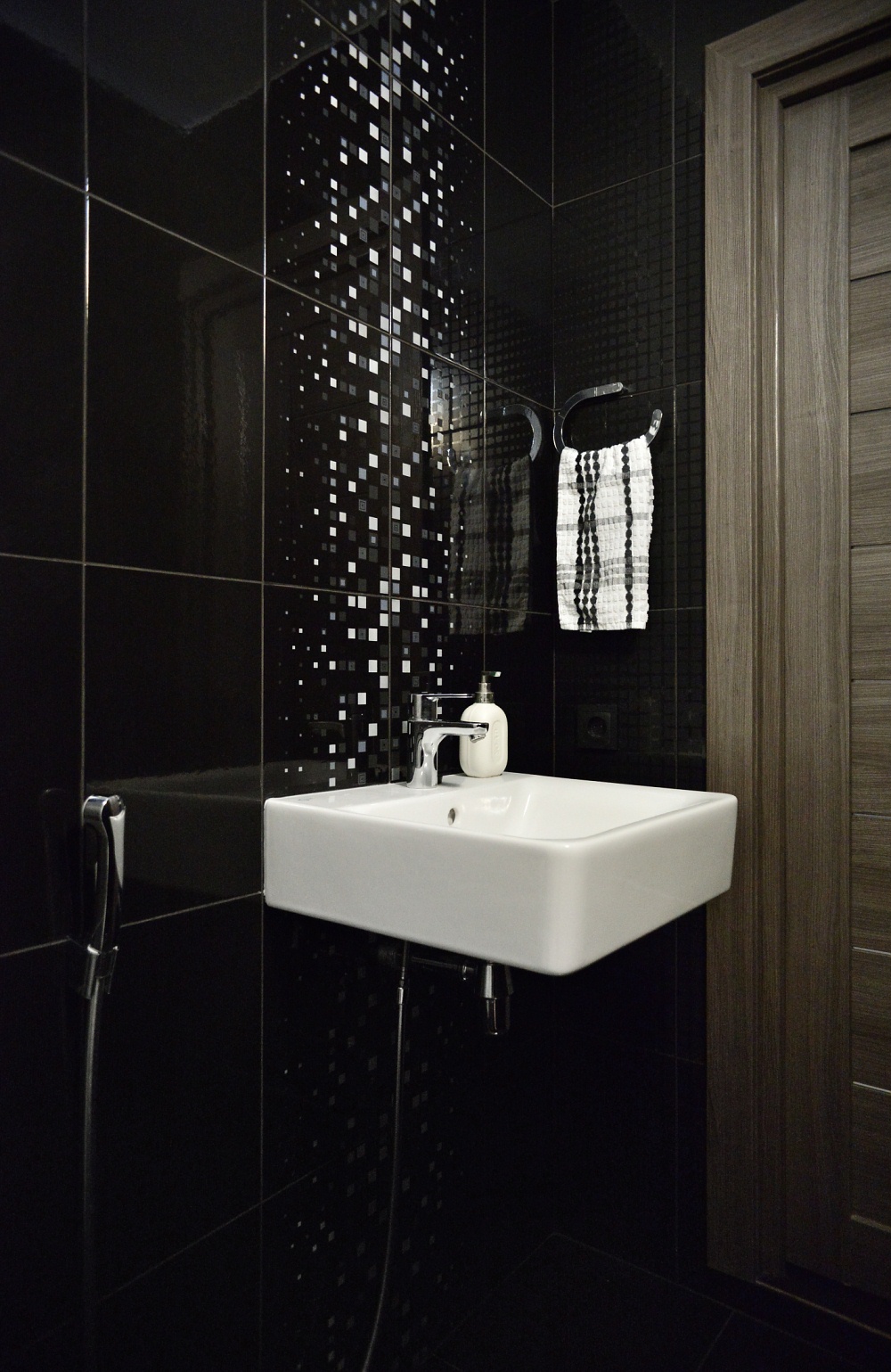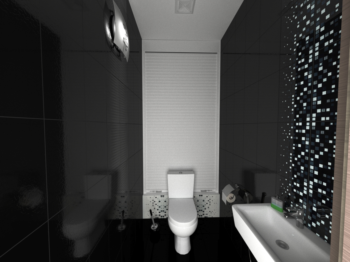 Длинный и узкий санузел выложен глянцевой черной плиткой. За унитазом скрывается глубокий шкаф хозяйственного назначения, позволивший с пользой занять часть помещения.