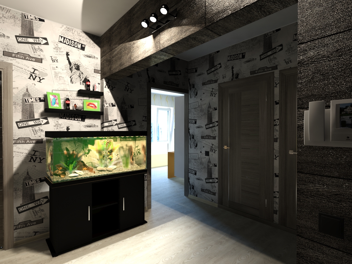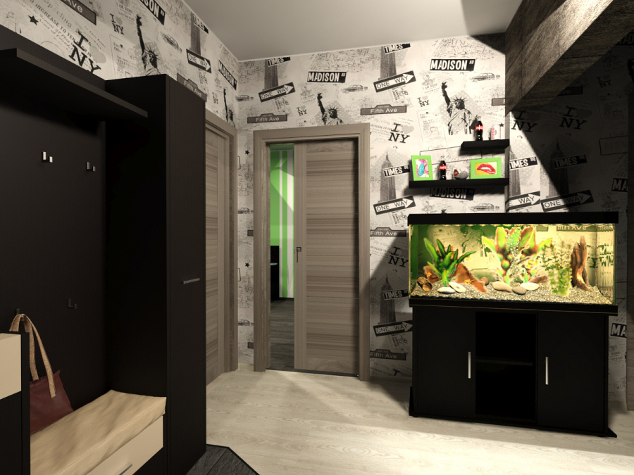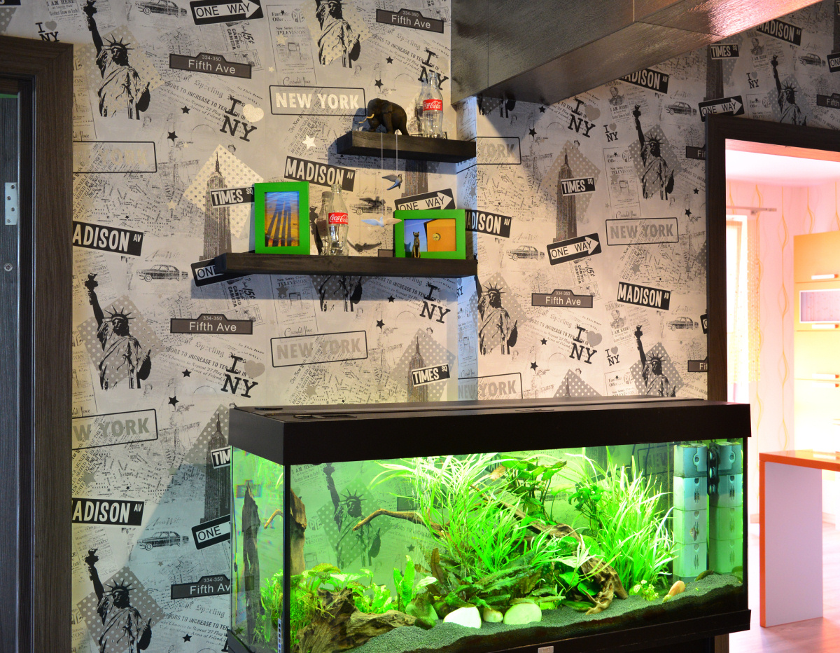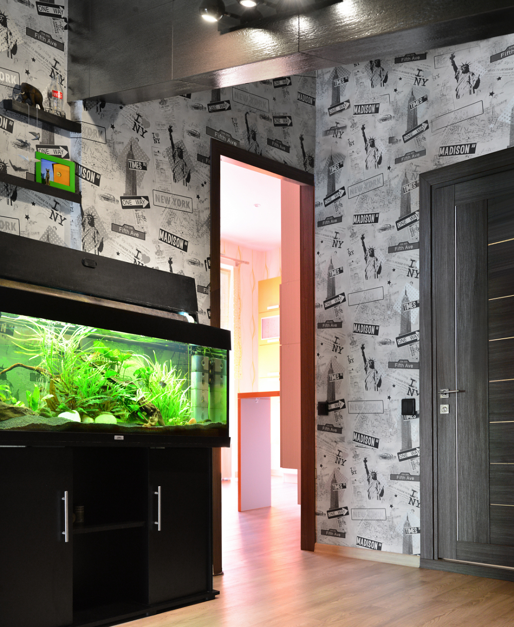 Центральное место в прихожей занимает большой аквариум.