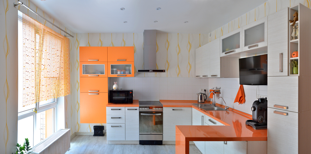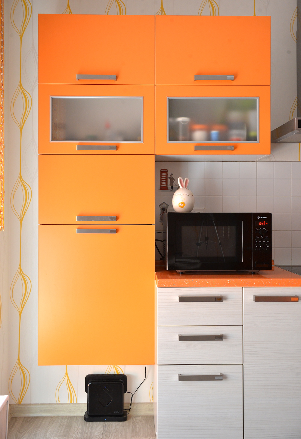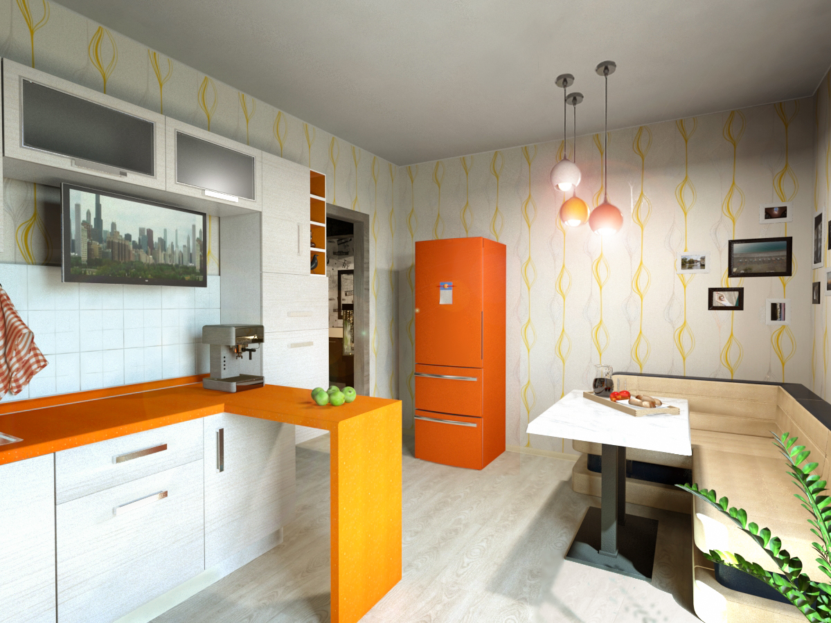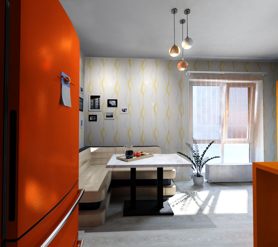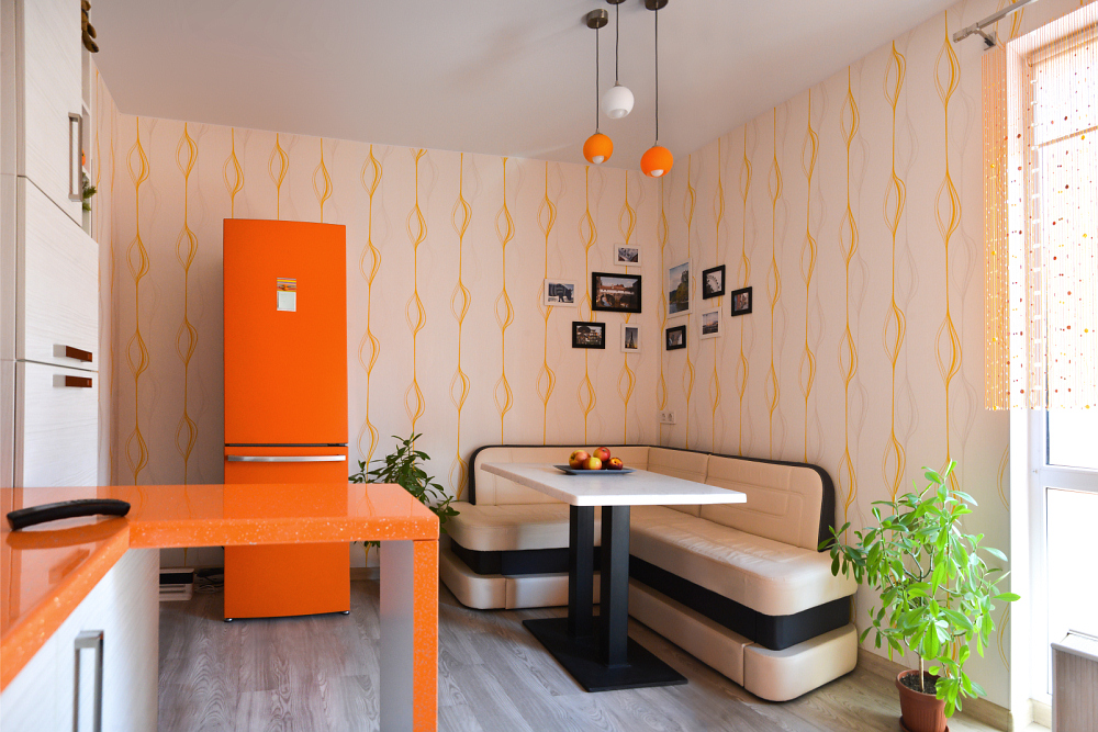 Солнечное настроение поддерживает отдельно стоящий оранжевый холодильник, найти который оказалось непросто. По задумке владельцев, всю его боковую стенку займет коллекция магнитов, приобретенных в путешествиях.