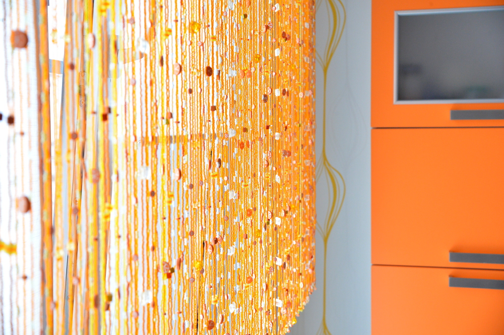 Окно кухни выходит на солнечную сторону, но хорошего вида из окна нет: помещение смотрит в так называемый "световой колодец". Напротив - окна лифтовых холлов другого подъезда. Отвлекать внимание от невзрачной панорамы призвана шторка из бисера ручной работы, которую хозяйка смастерила сама.