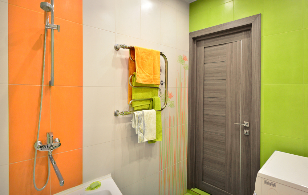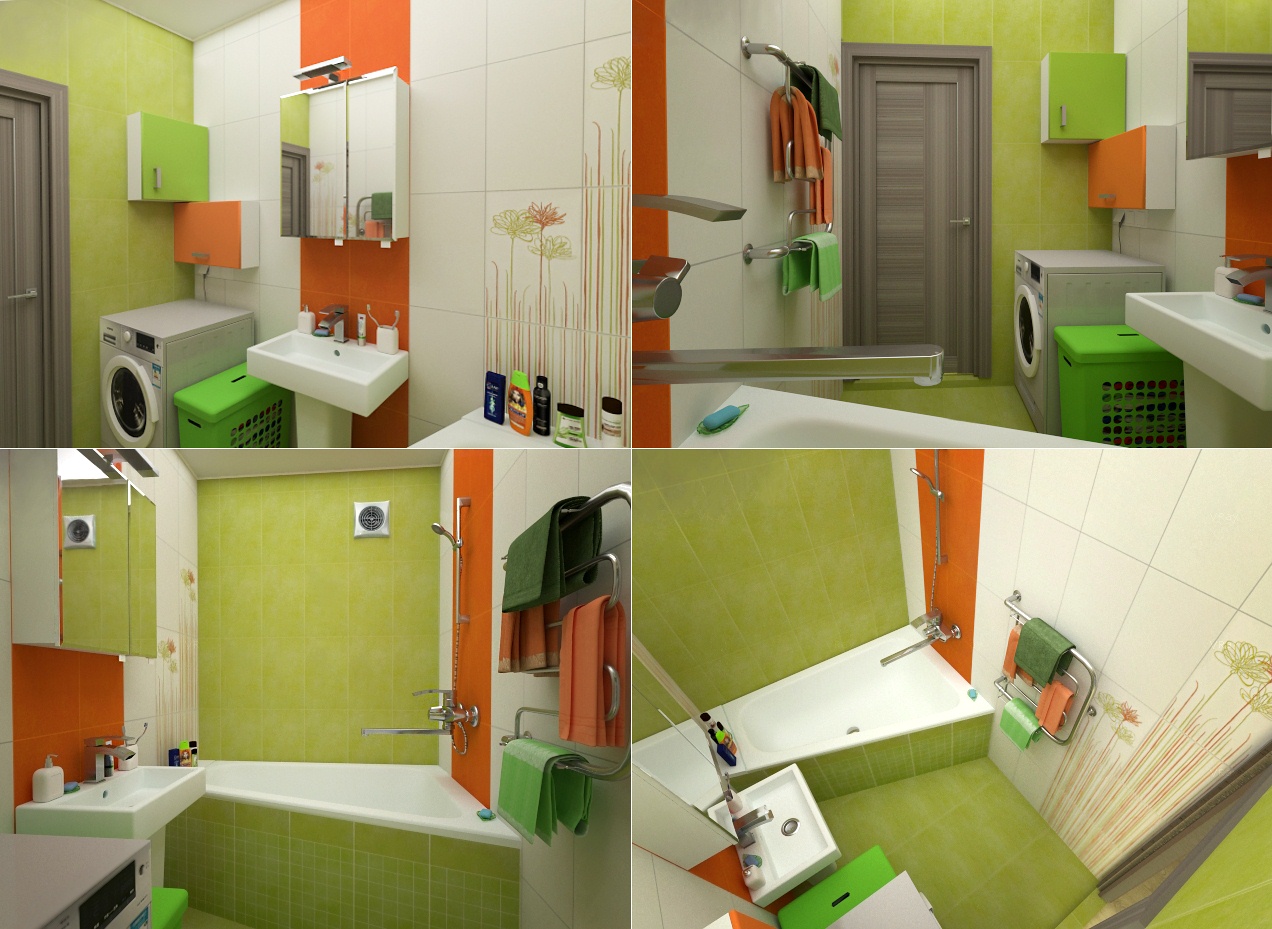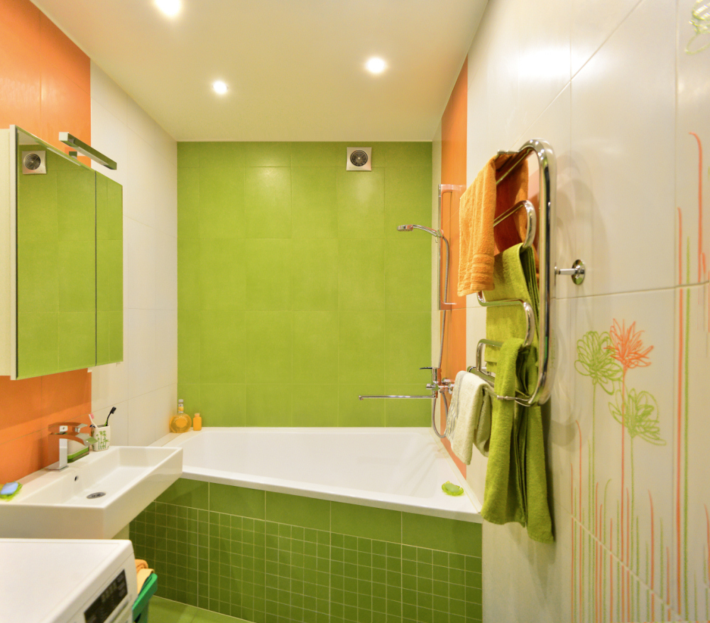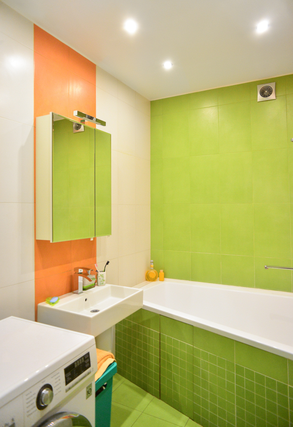 Ванная комната продолжает солнечное настроение, заданное кухней. К белому и оранжевому добавились сочные оттенки зеленого - любимого цвета главы семьи.