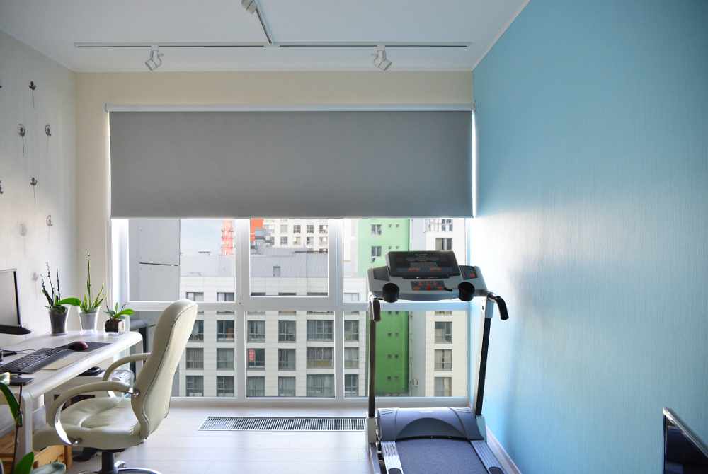 Огромная рулонная штора служит фоном для студийной фотосъемки, которой увлекается хозяйка.