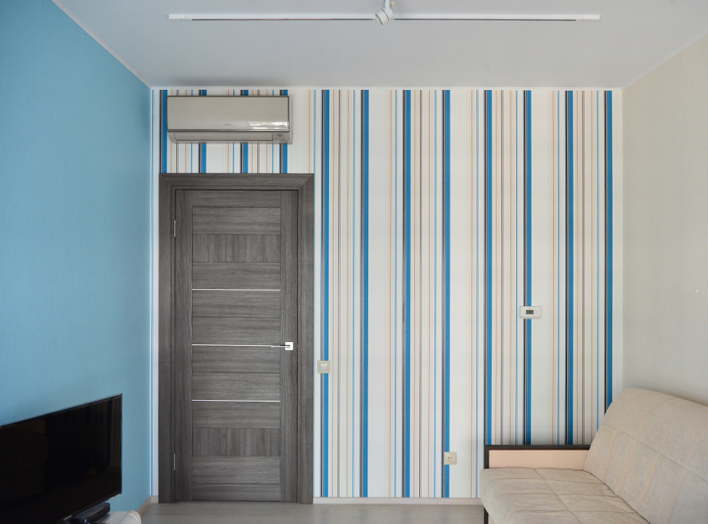 Всю площадь полосатой стены в перспективе займет коллекция орхидей. Ближе к окну их сдвигать нельзя: по утрам листья цветов страдают от прямых лучей солнца.