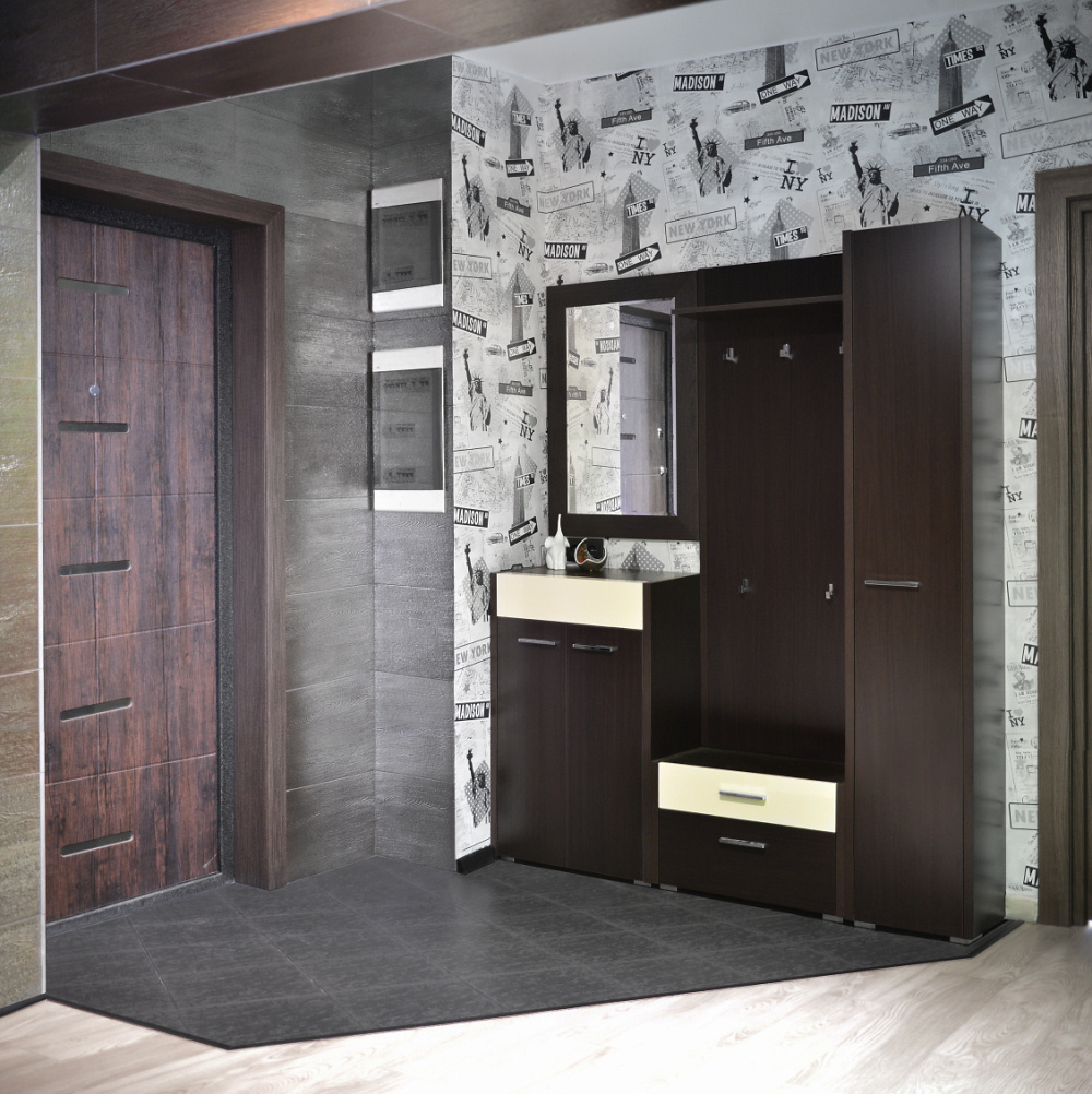 Мебель для прихожей владельцы поначалу хотели подобрать черно-белую, но потом остановились на темно-коричневой с глянцевыми сливочными акцентами- она идеально вписалась по своим габаритам.