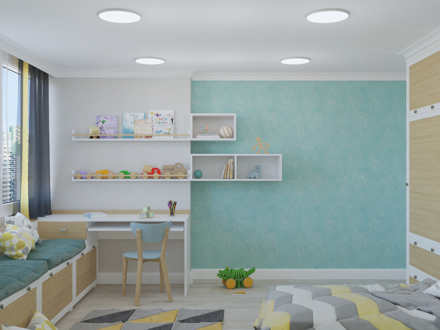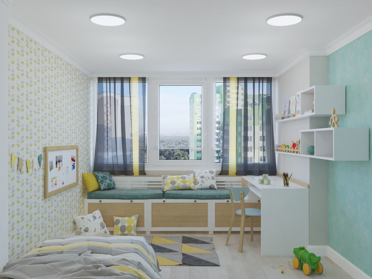 В комнате мальчика, который пока не дорос до школы, преобладают бирюзовый, желтый и древесные оттенки. Всю стену вдоль окна занимает скамья с ящиками для игрушек.