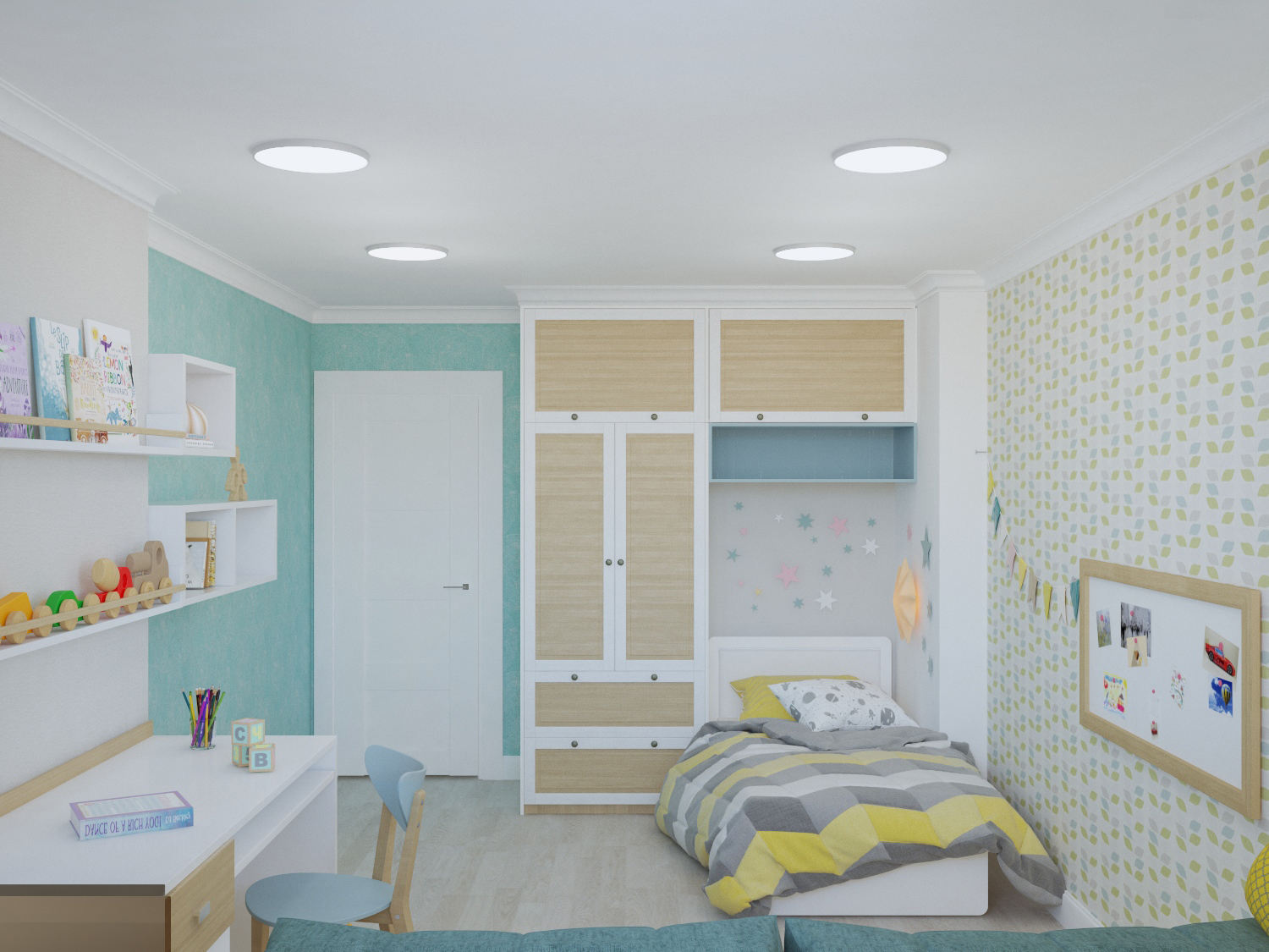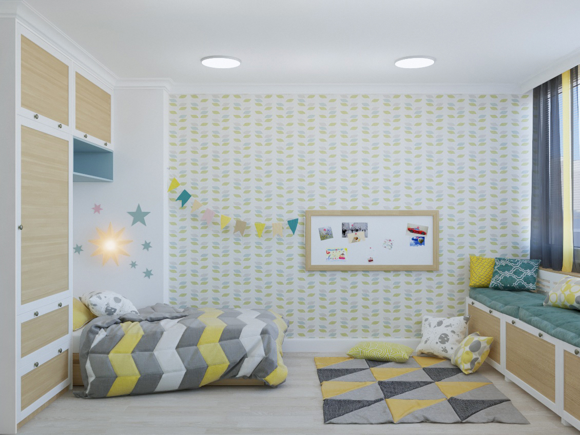 Кровать встроена в нишу, образованную Г-образным шкафом, а над игровой зоной висит специальная доска-стенд со сменяемой экспозицией детских рисунков.