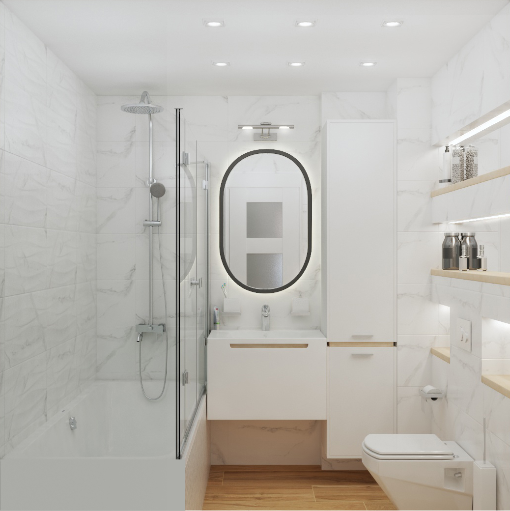 Ванная комната оформлена белой плиткой под мрамор. С белоснежными стенами помещение кажется более просторным, чем оно есть на самом деле.