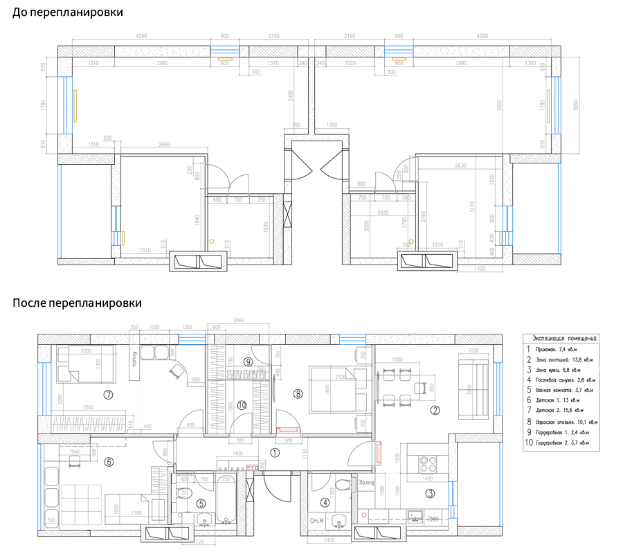 За зеркальной дверью со скрытой дверной коробкой расположена гардеробная для всей семьи. Часть ее отделена перегородкой и имеет вход из спальни родителей.