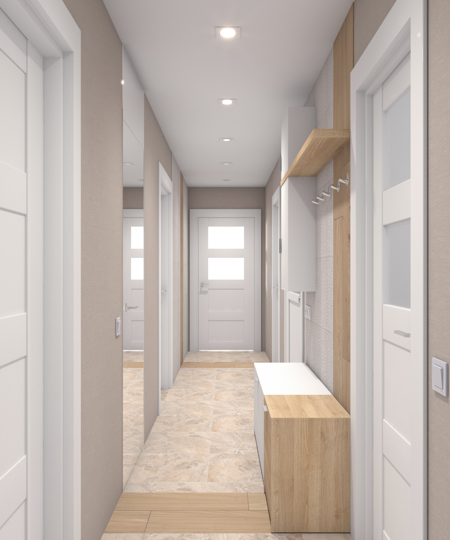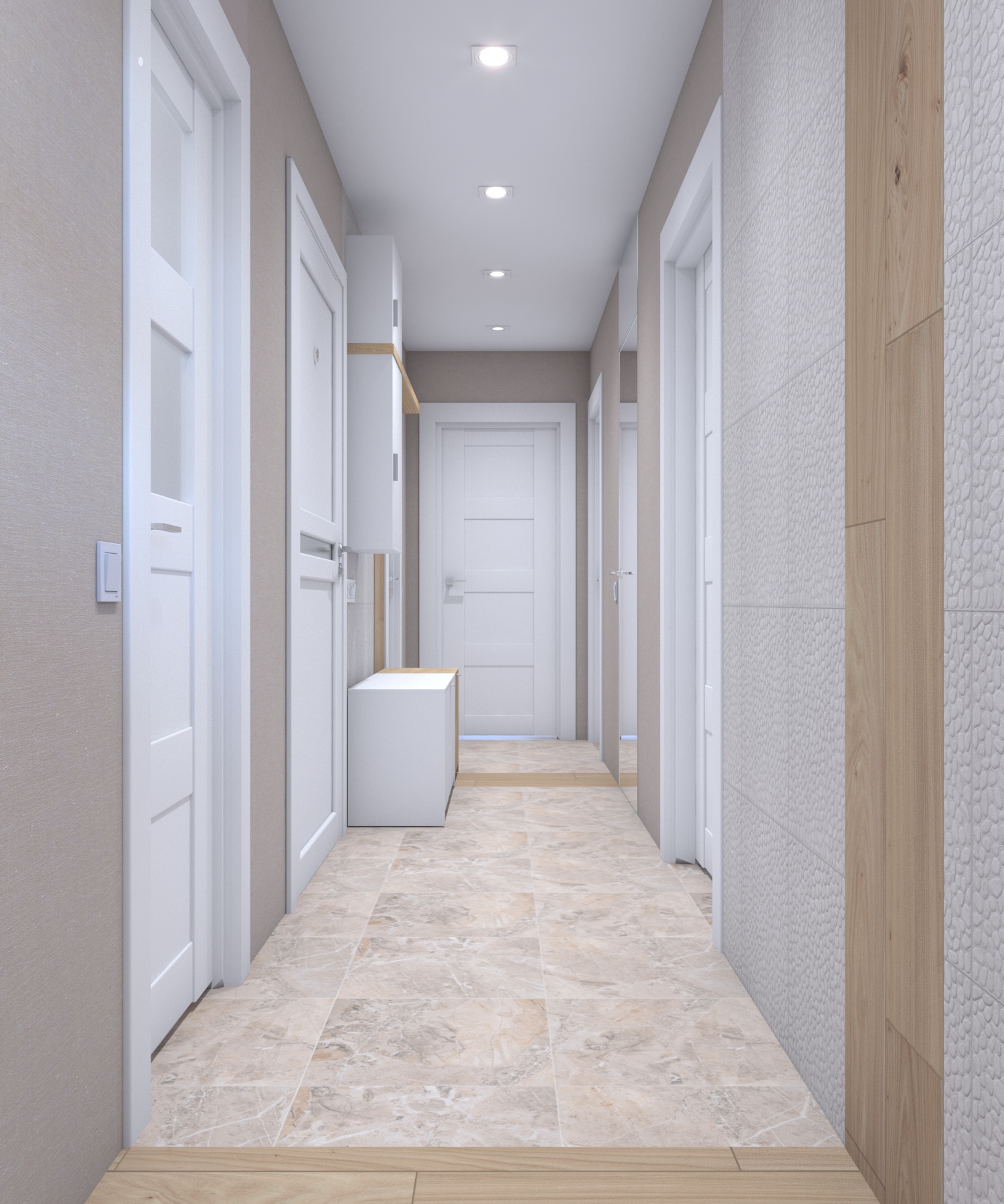 Поперечные вставки под дерево, растянутые по полу и стенам, визуально "рассекают" коридор на отдельные участки. Это позволяет избежать ощущения тоннеля.