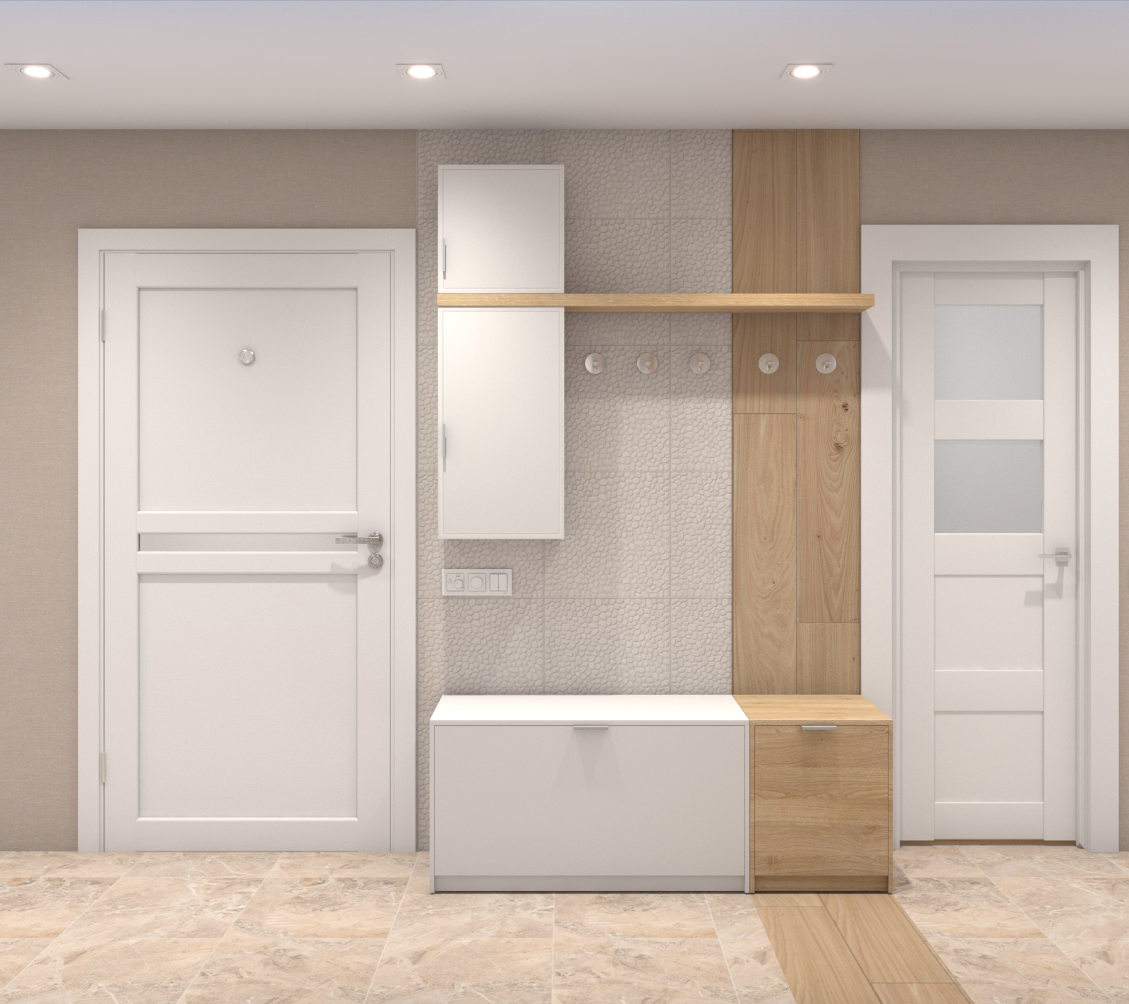 Основная проблема длинного и не очень широкого коридора - отсутствие изолированной прихожей.  Переходить из комнаты жильцам придется мимо входной двери. Верхняя одежда будет храниться в гардеробной, но тумба и навесной шкаф для тапочек, электрощитка и мелочей все же решено было установить.