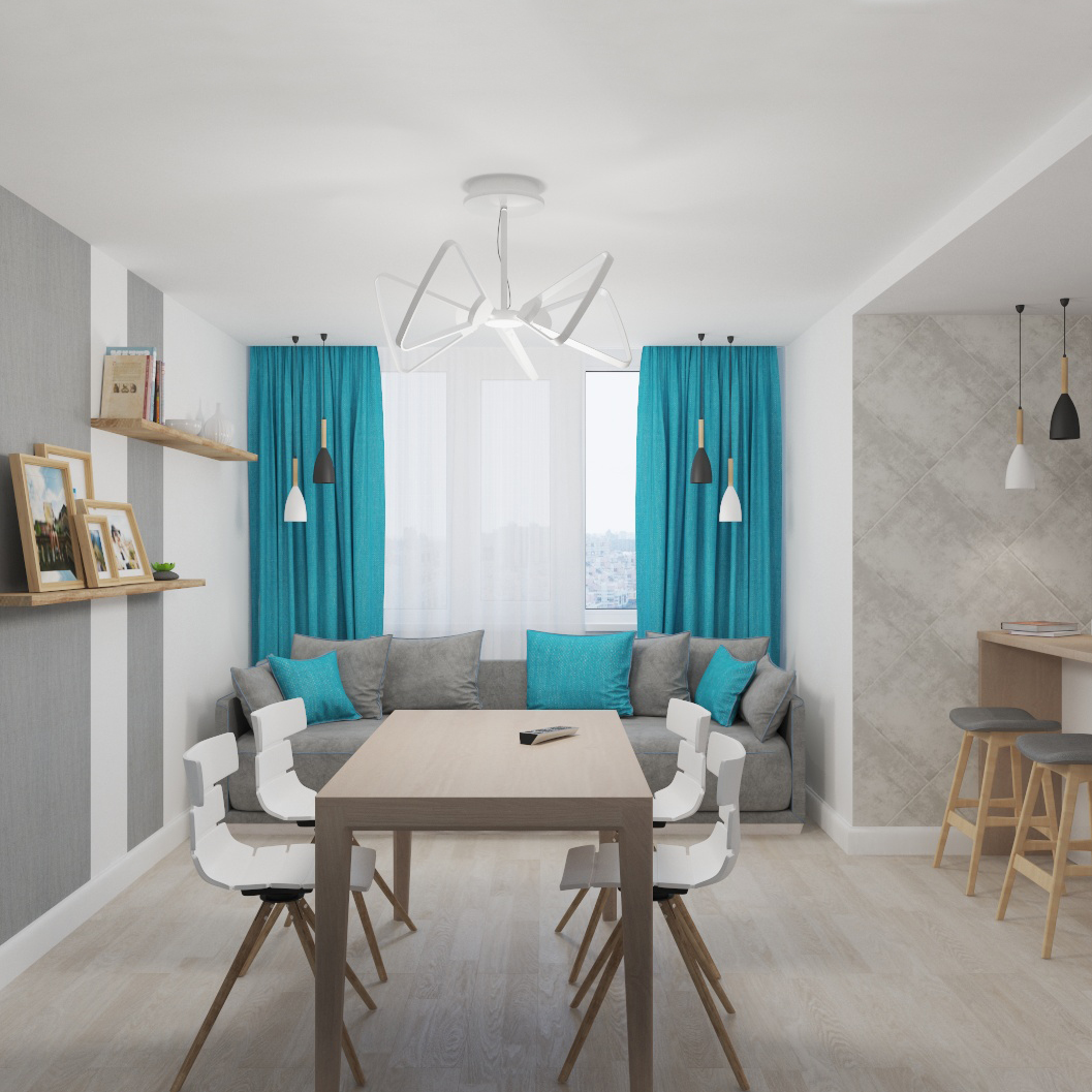 Широкий диван занимает всю стену вдоль окна. Ниша выделена ярким голубым текстилем и имеет собственную подсветку в виде парных светильников-подвесов. Такие же размещены и над барной стойкой.
