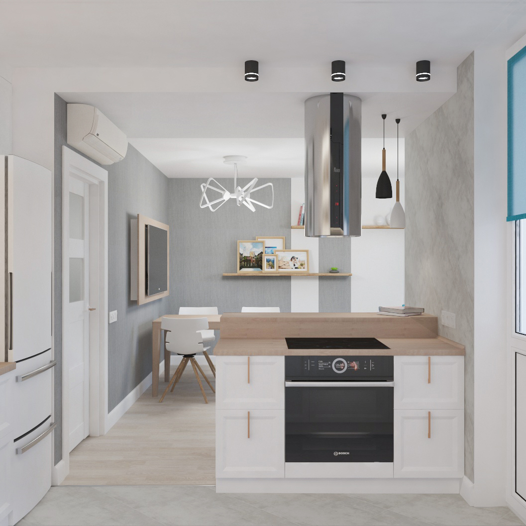 От столовой и гостиной зоны кухонную часть отделяет полуостров с небольшой барной стойкой и электроплитой