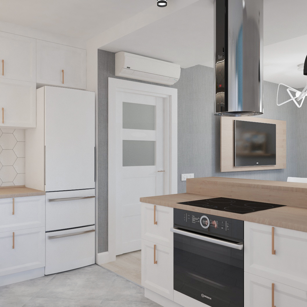 В зоне кухни потолок опущен только над шкафами. Там проходят трассы вентиляции. Светильники же используются накладные.