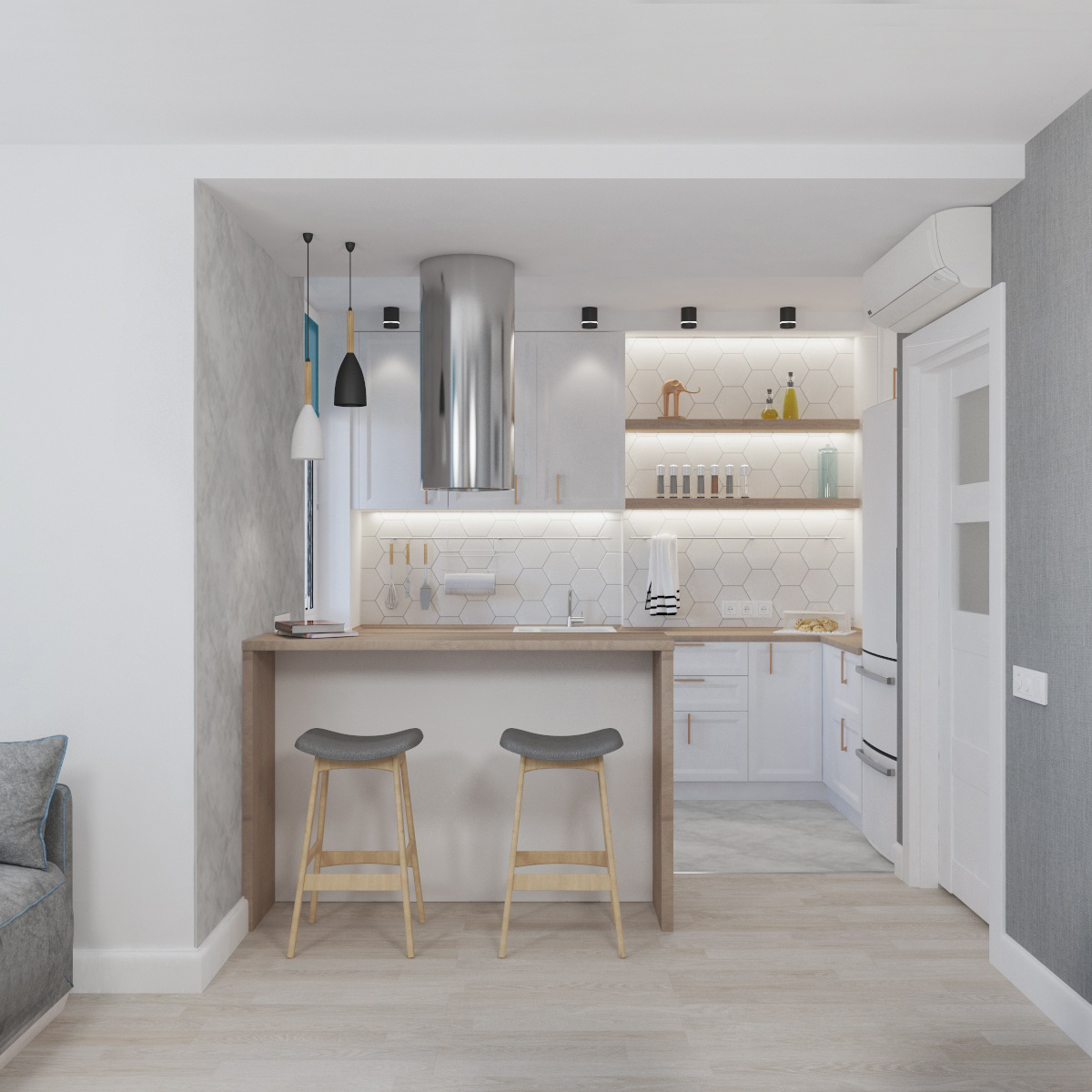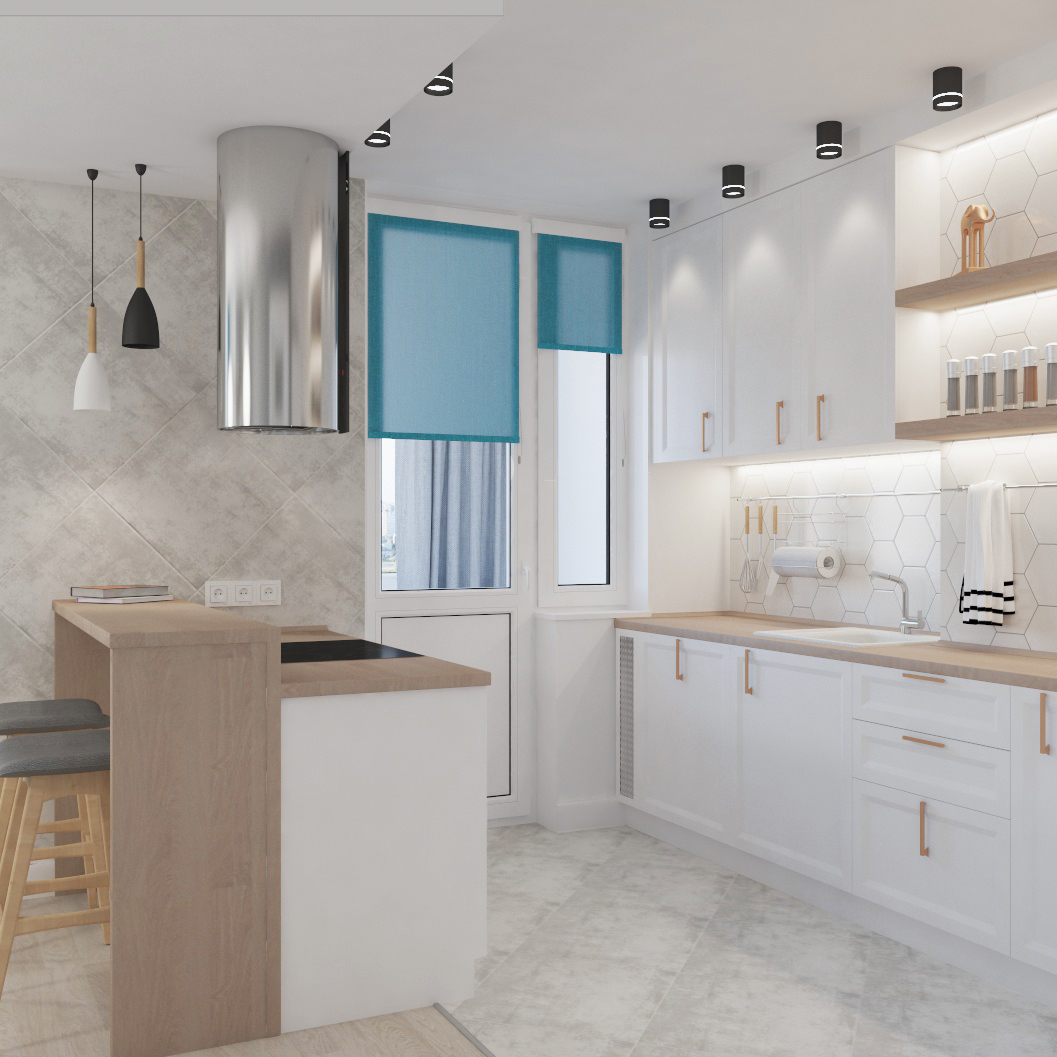 Стена над полуостровом отделана той же плиткой под бетон, что и пол в зоне готовки. Кухонный фартук оформлен белой плиткой в форме шестигранников с контрастной темной расшивкой.