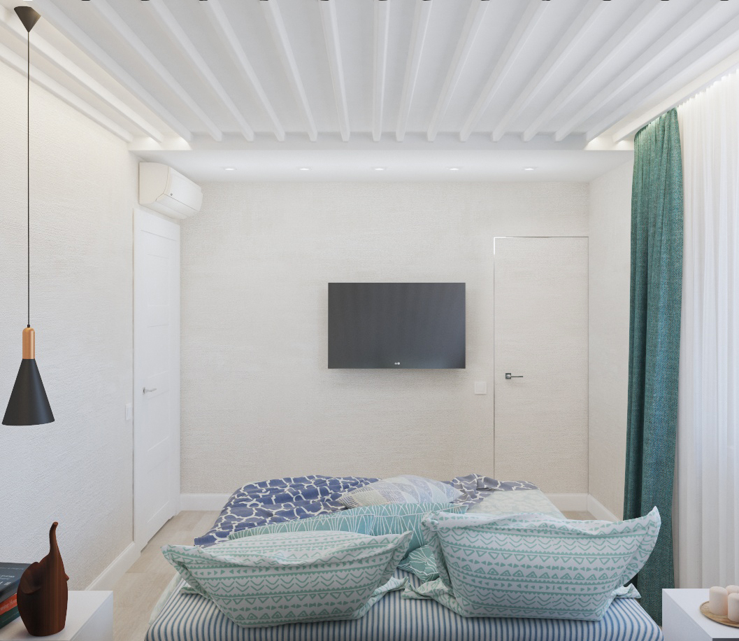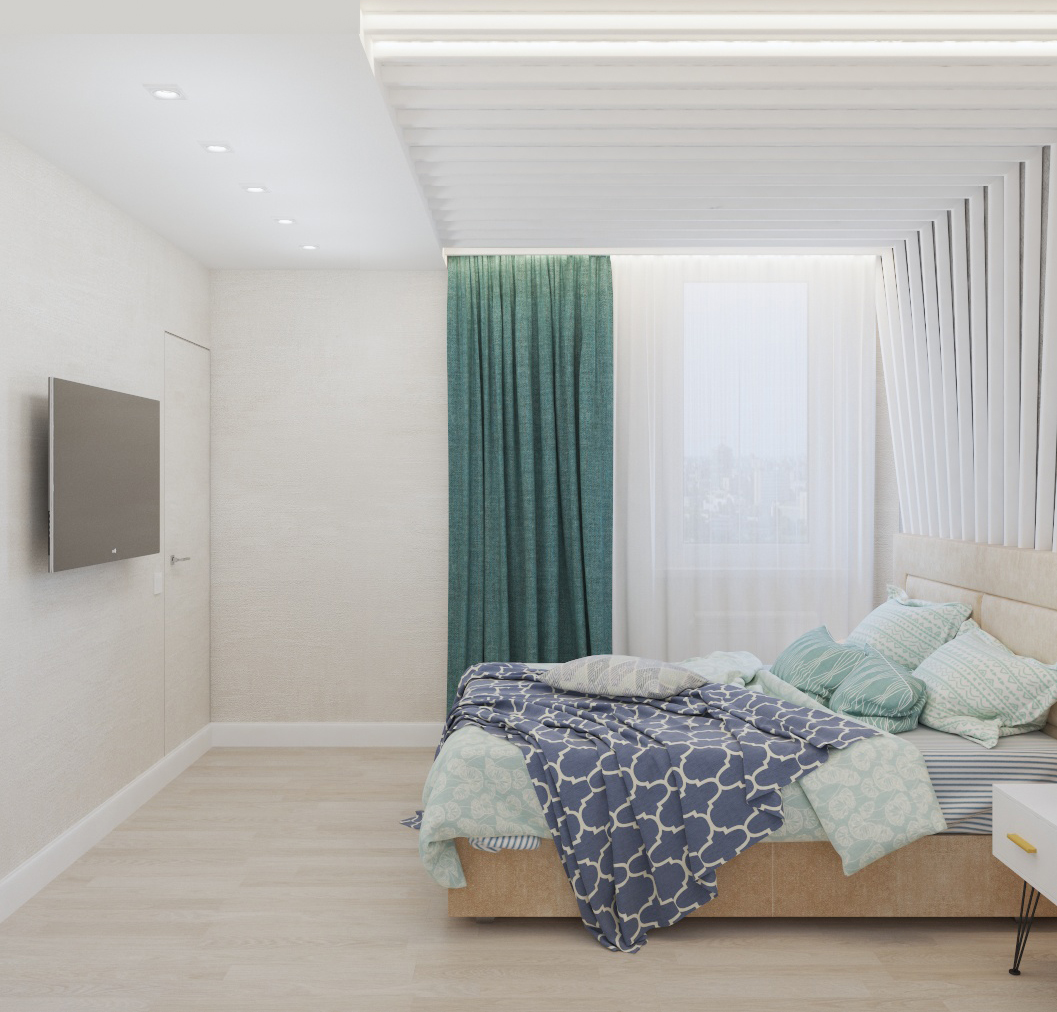 Изюминкой скромной по размеру родительской спальни стала акцентная стена, украшенная белыми рейками. Они продолжаются и на потолке, до выступа. За боковыми рейками скрывается потолочный шторный карниз и светодиодная подсветка. Зеркальные вставки по двум сторонам "работают" на расширение пространства.