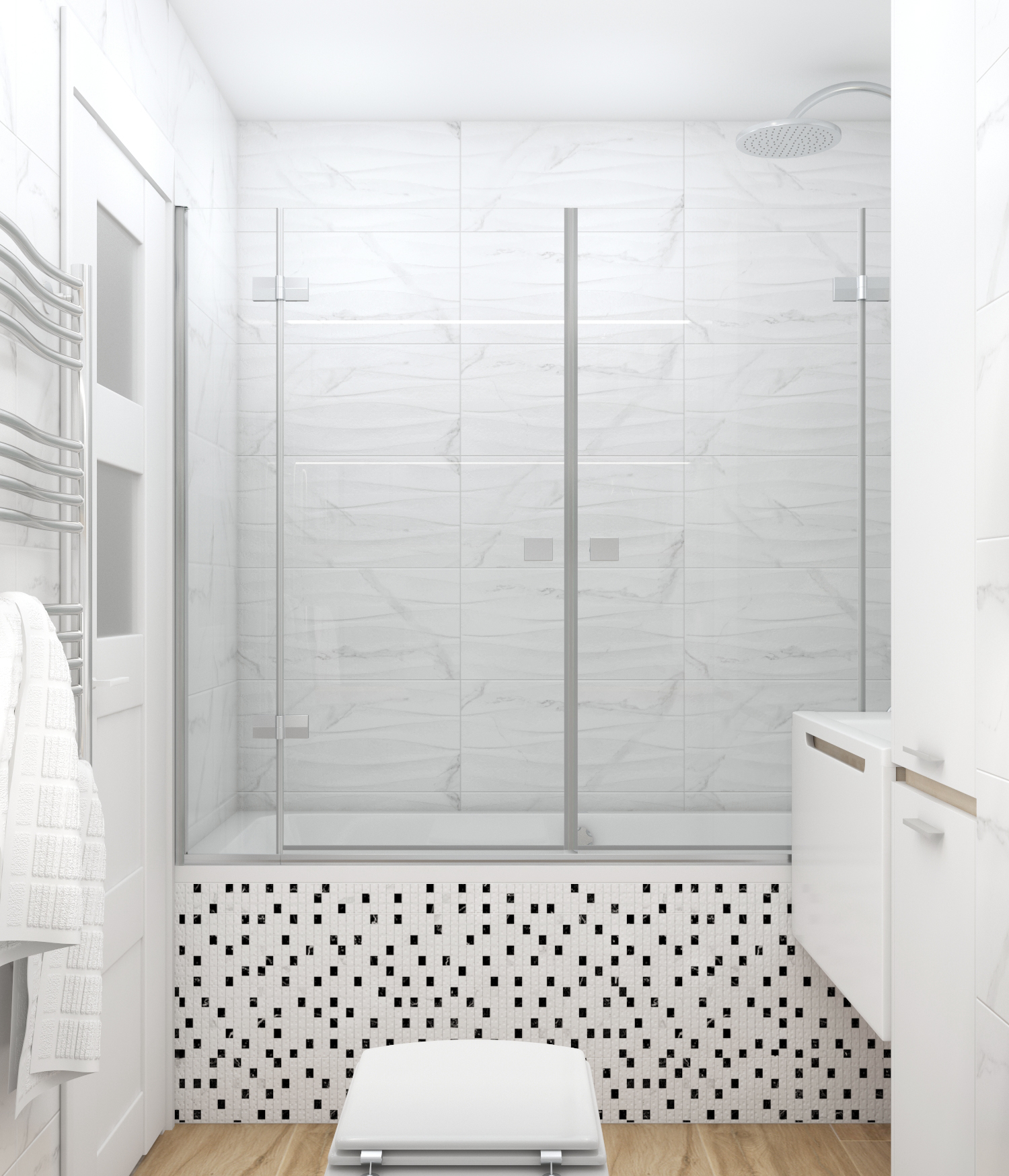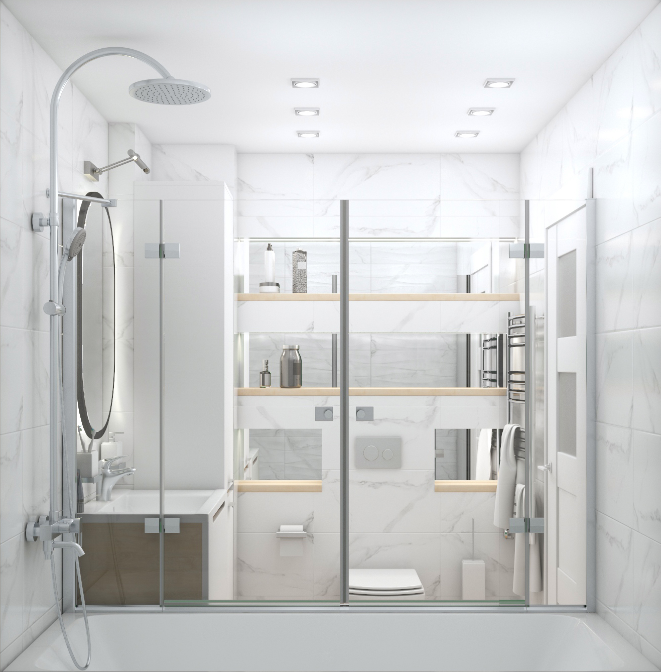 Стеклянное ограждение на ванной, скорее всего, получит раздвижную конструкцию. Тогда тумба с раковиной не будут мешать стеклянным створкам.