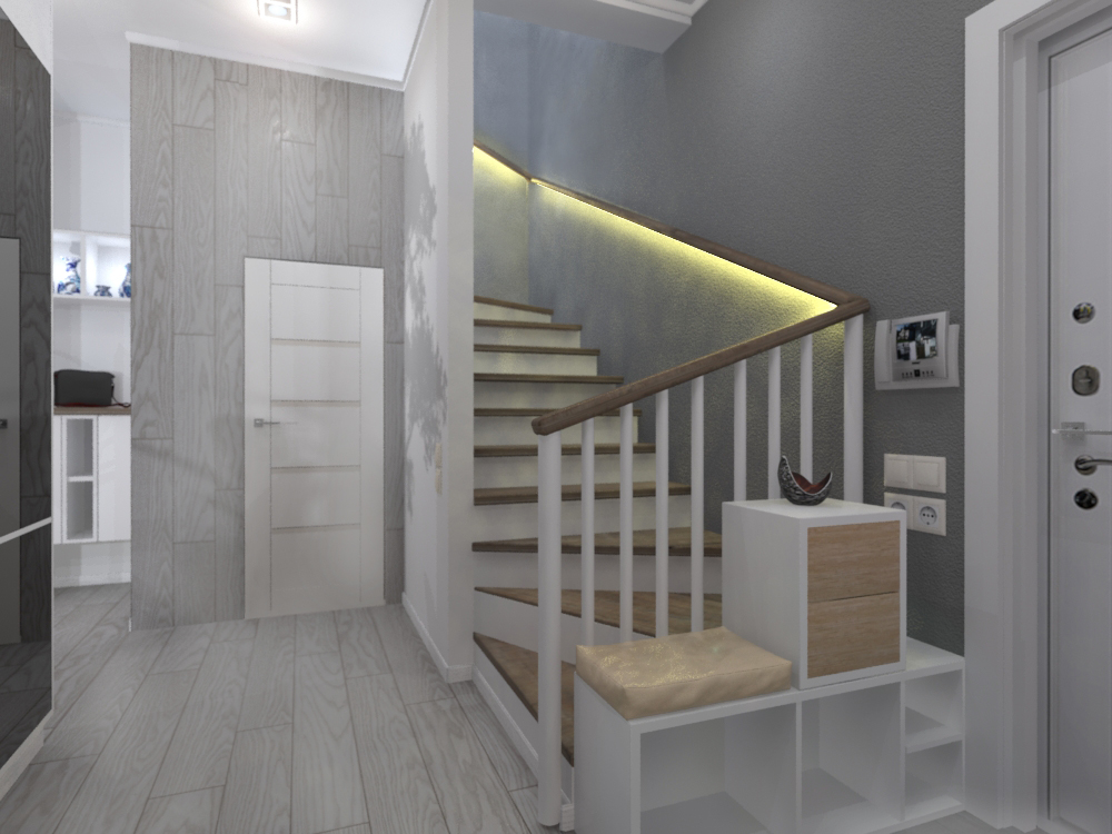Подсветка ступеней лестницы спрятами под перилами, а стена защищена стойкой к истиранию рельефной штукатуркой.