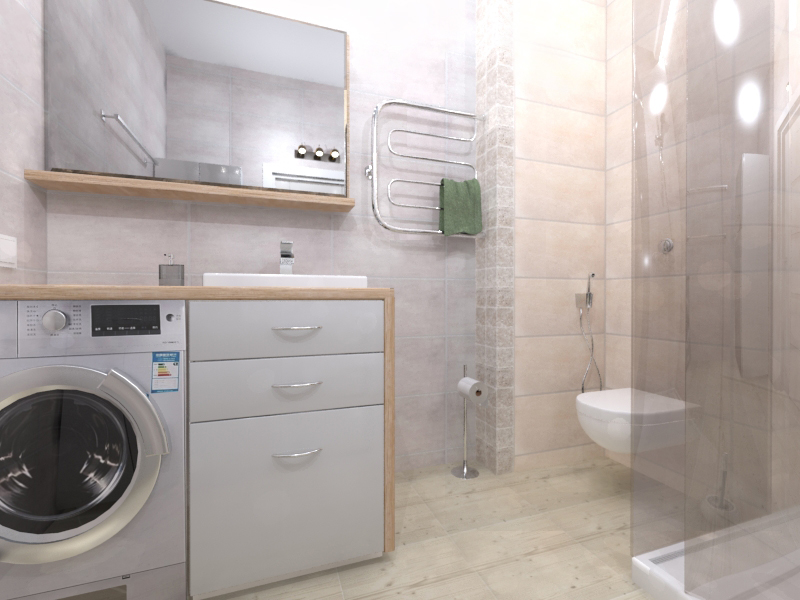 В нижнем санузле есть все необходимое: душевая кабина для мытья собачьих лап (третий жилец квартиры - маленький шпиц), инсталляция с гигиеническим душем, большое зеркало, раковина со стиральной машиной под одной столешницей и шкаф-колонка у противоположной стены.
