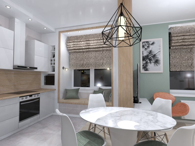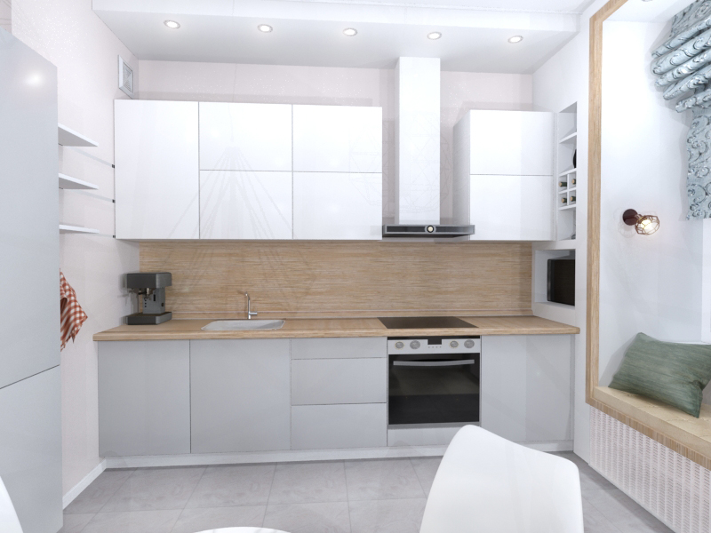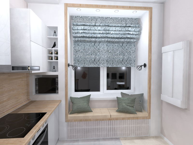 Владелица квартиры всегда мечтала о диванчике, встроенном в нишу окна на кухне. Для реализации этой идеи она даже не пожалела потерянного места по обеим сторонам от лаунж-зоны. Впрочем, в короб со стороны кухни удалось вместить микроволновку и полки, легко трансформируемые в винный шкаф.