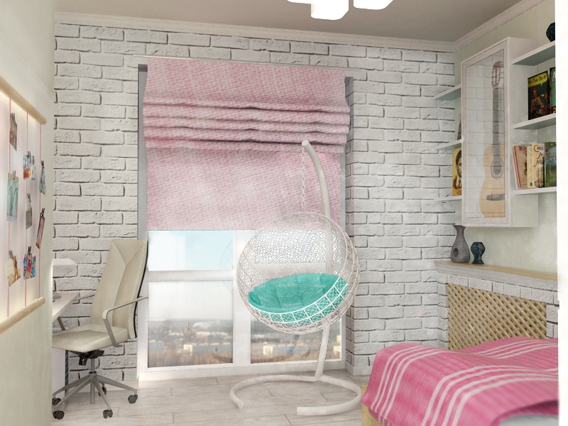 В комнате дочери тоже воплощены фантазии владелицы: стена из белого кирпича, кресло на подвесе, гирлянда из фотографий.