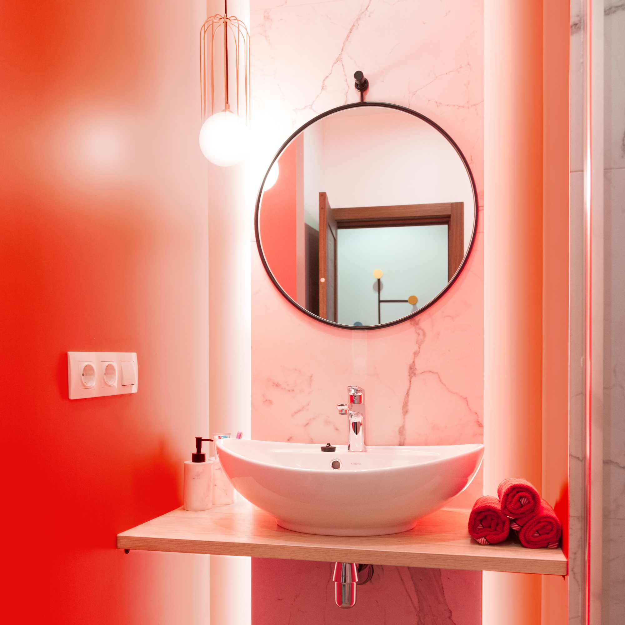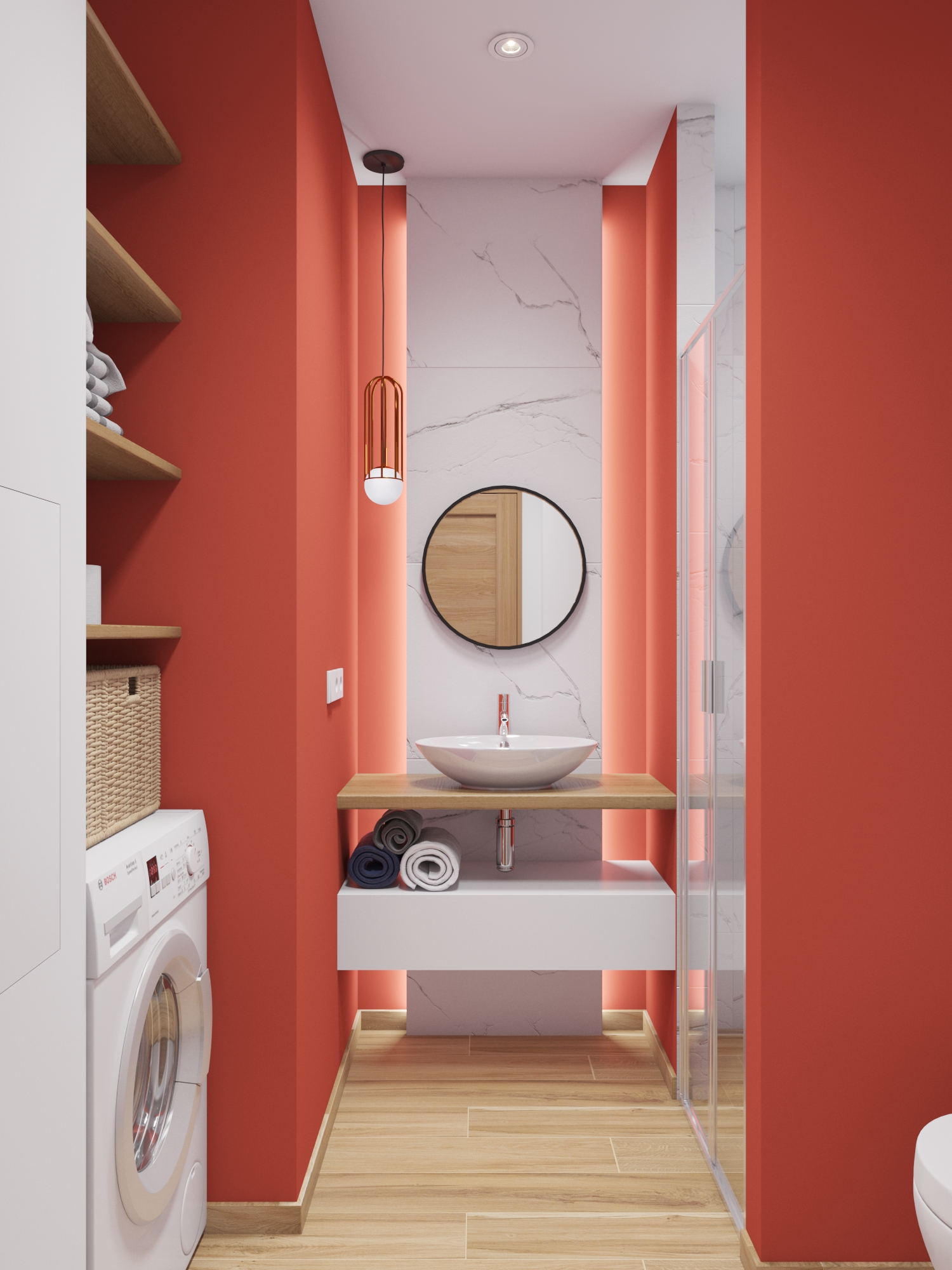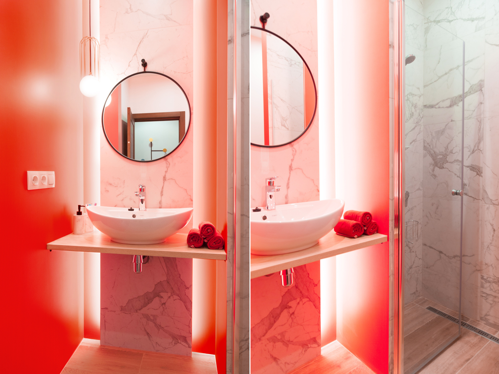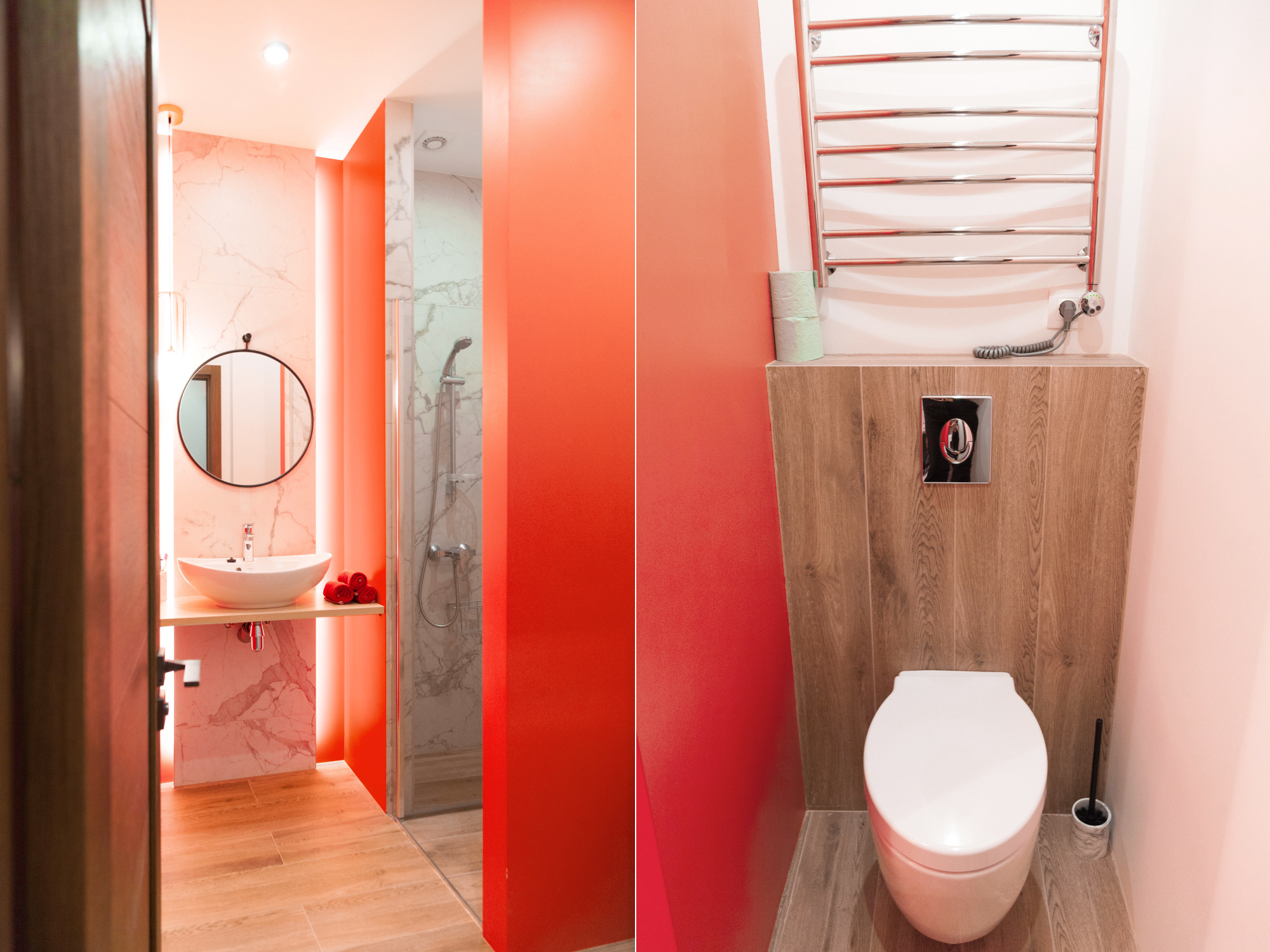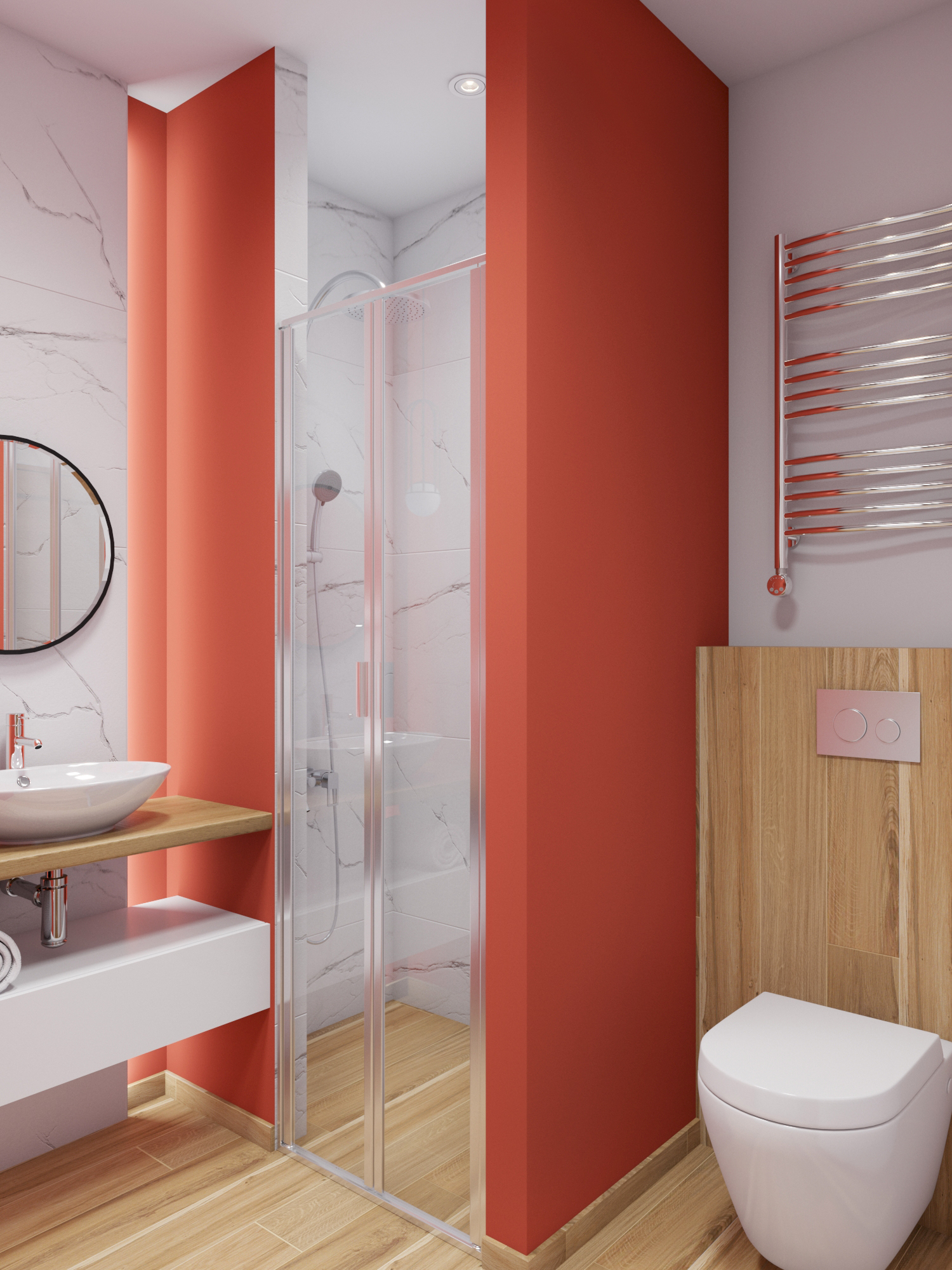 Отделку из керамогранита под белый мрамор с прожилками и доски мы дополнили яркой краской кораллового оттенка