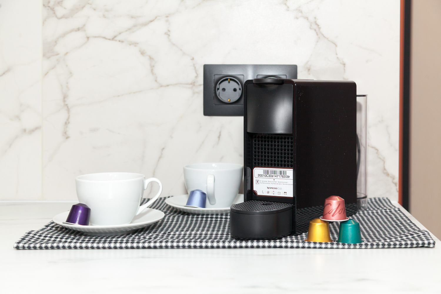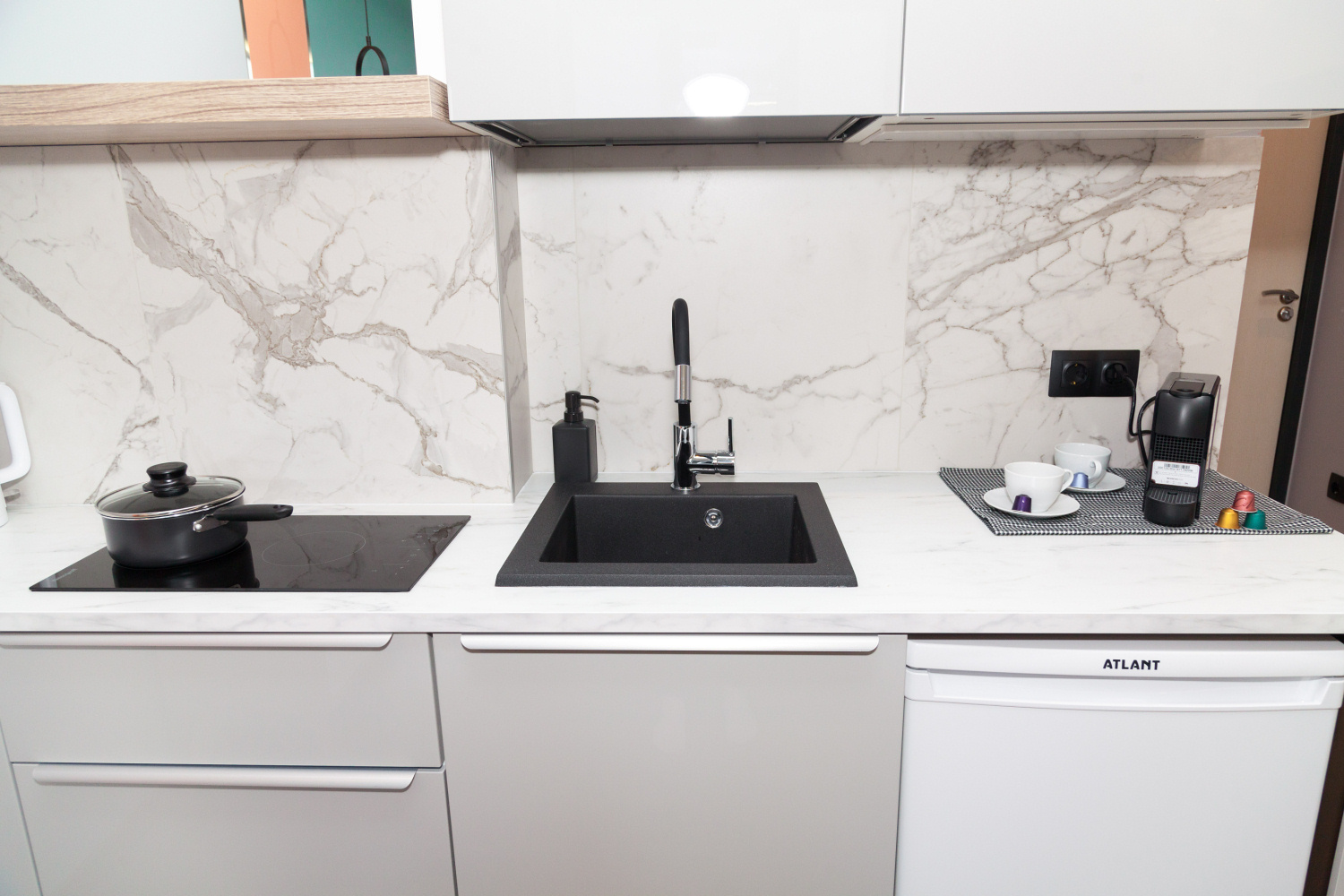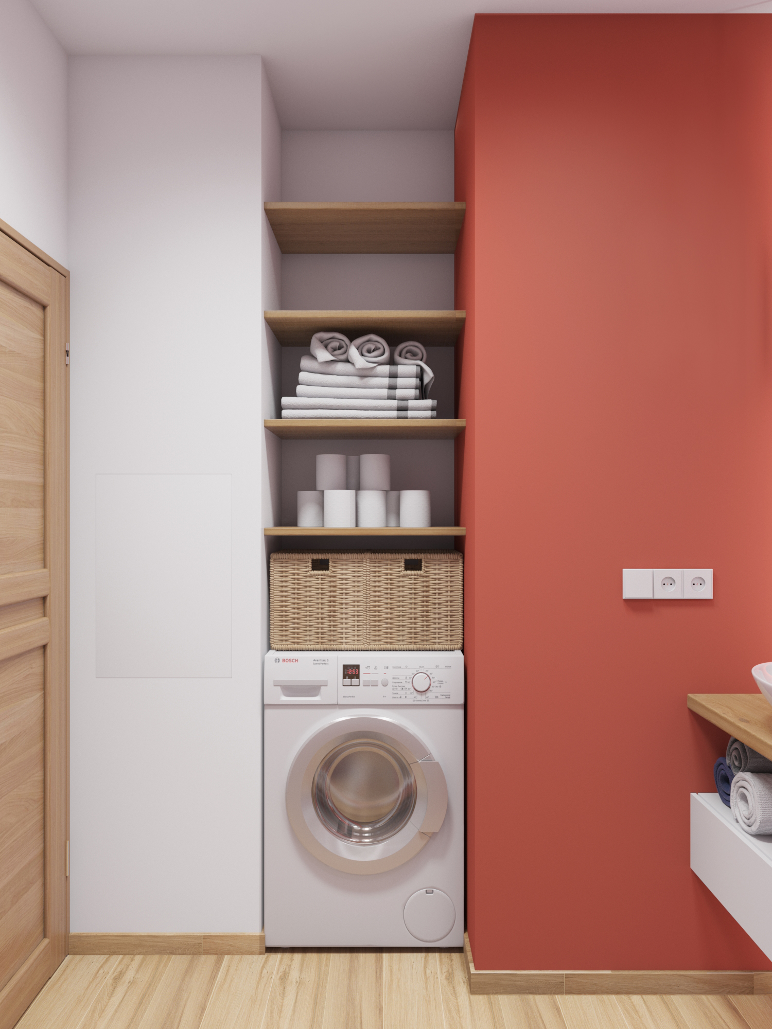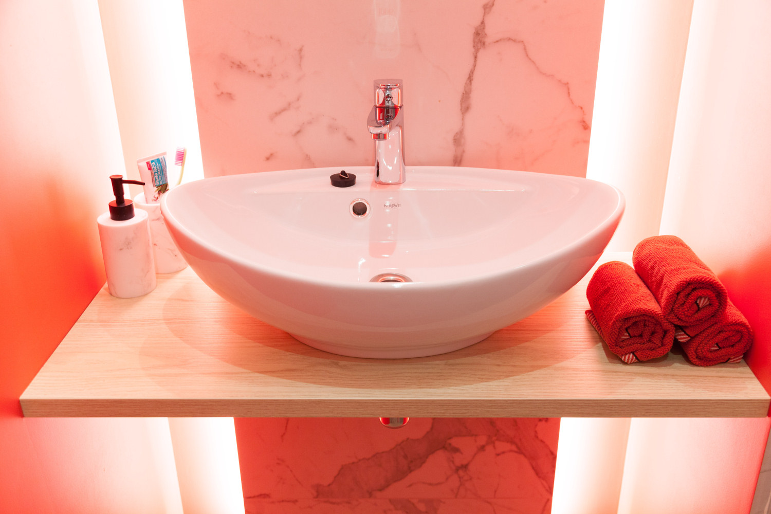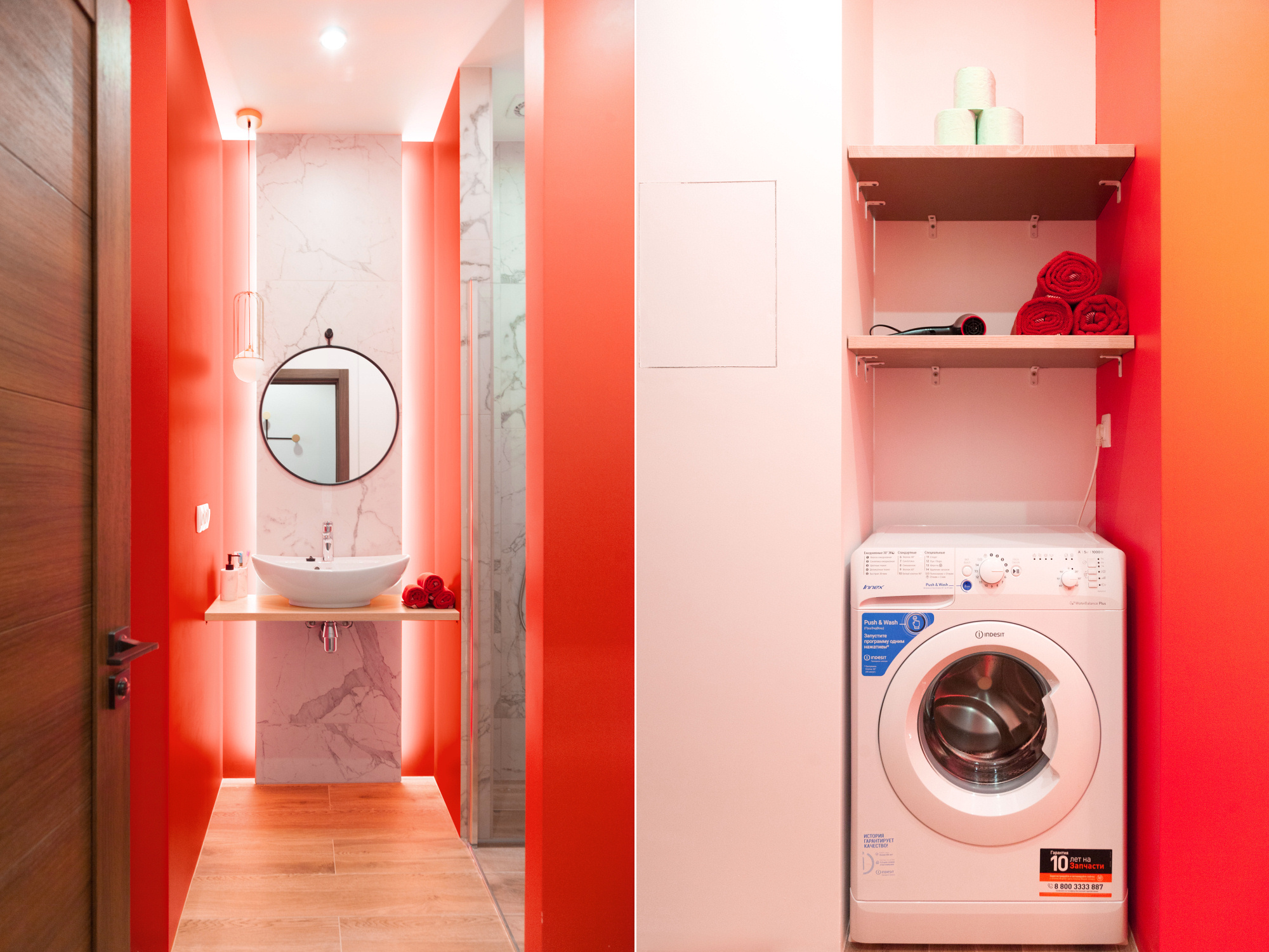 Отделку из керамогранита под белый мрамор с прожилками и доски мы дополнили яркой краской кораллового оттенка