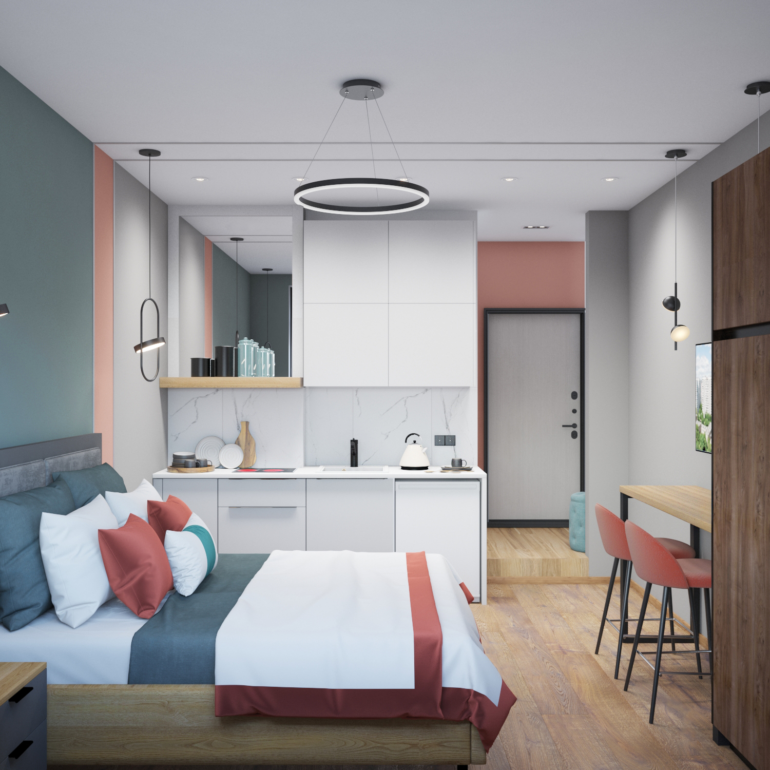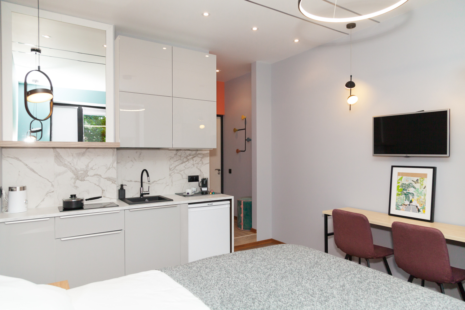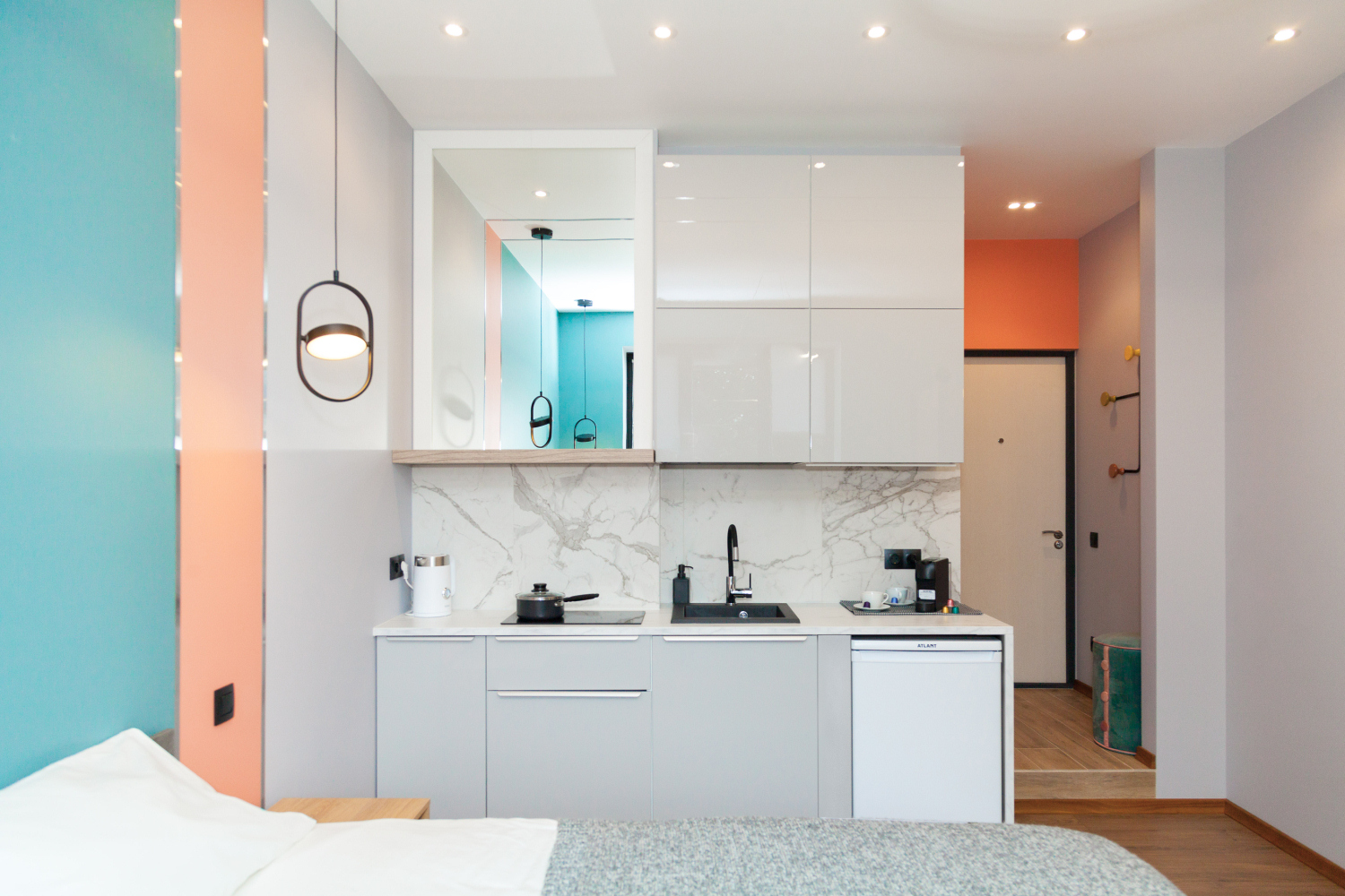 Для освещения использовали только футуристические светодиодные светильники. Стены покрасили более нежным пудровым оттенком кораллового, гармонирующим с ним пыльно-зеленым и серым цветами