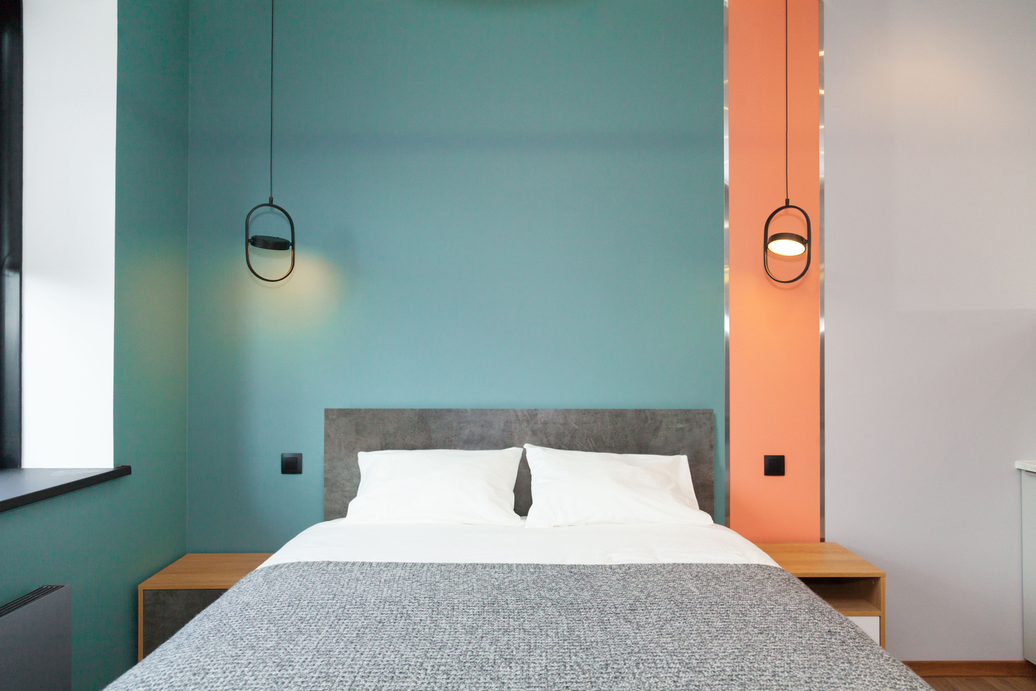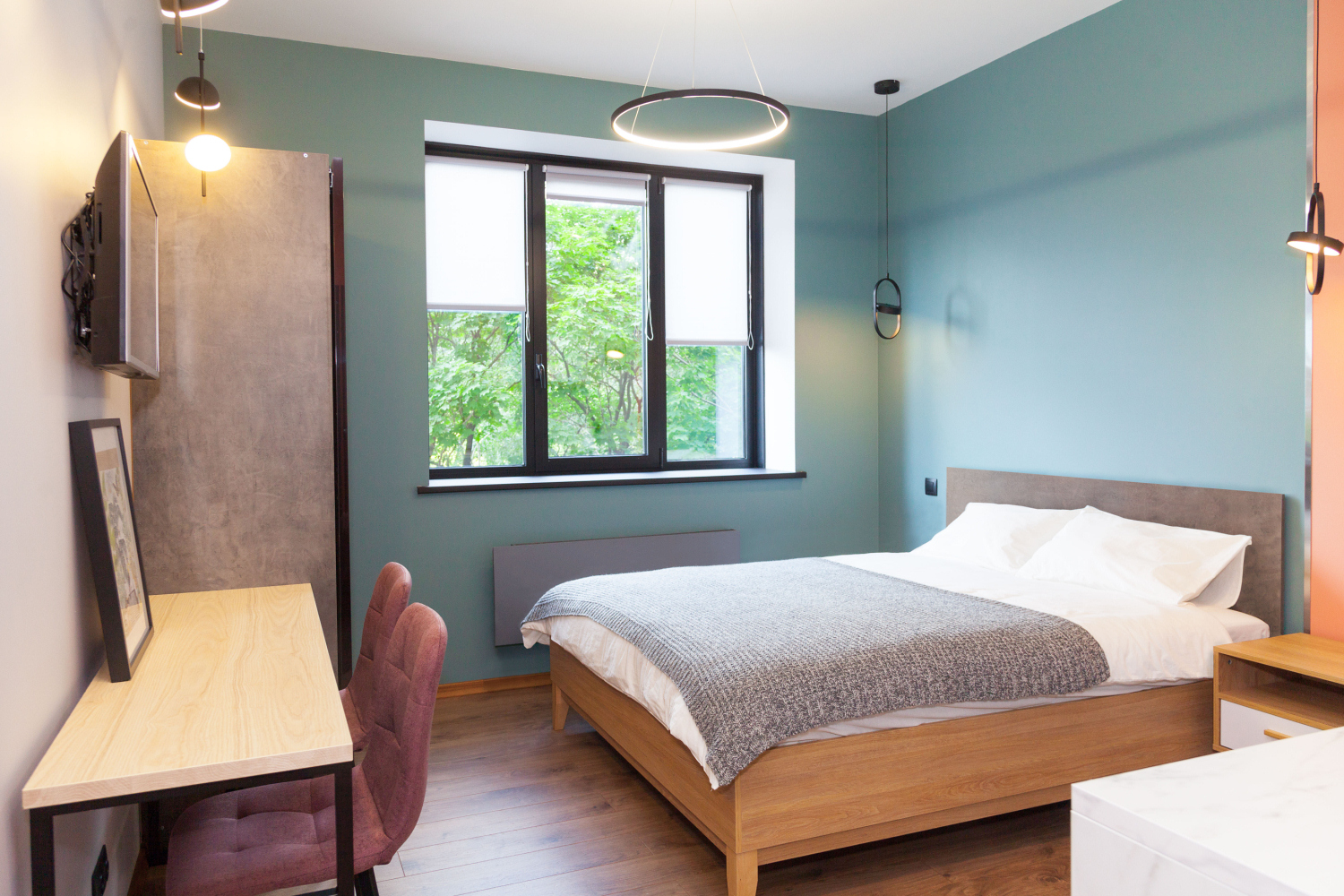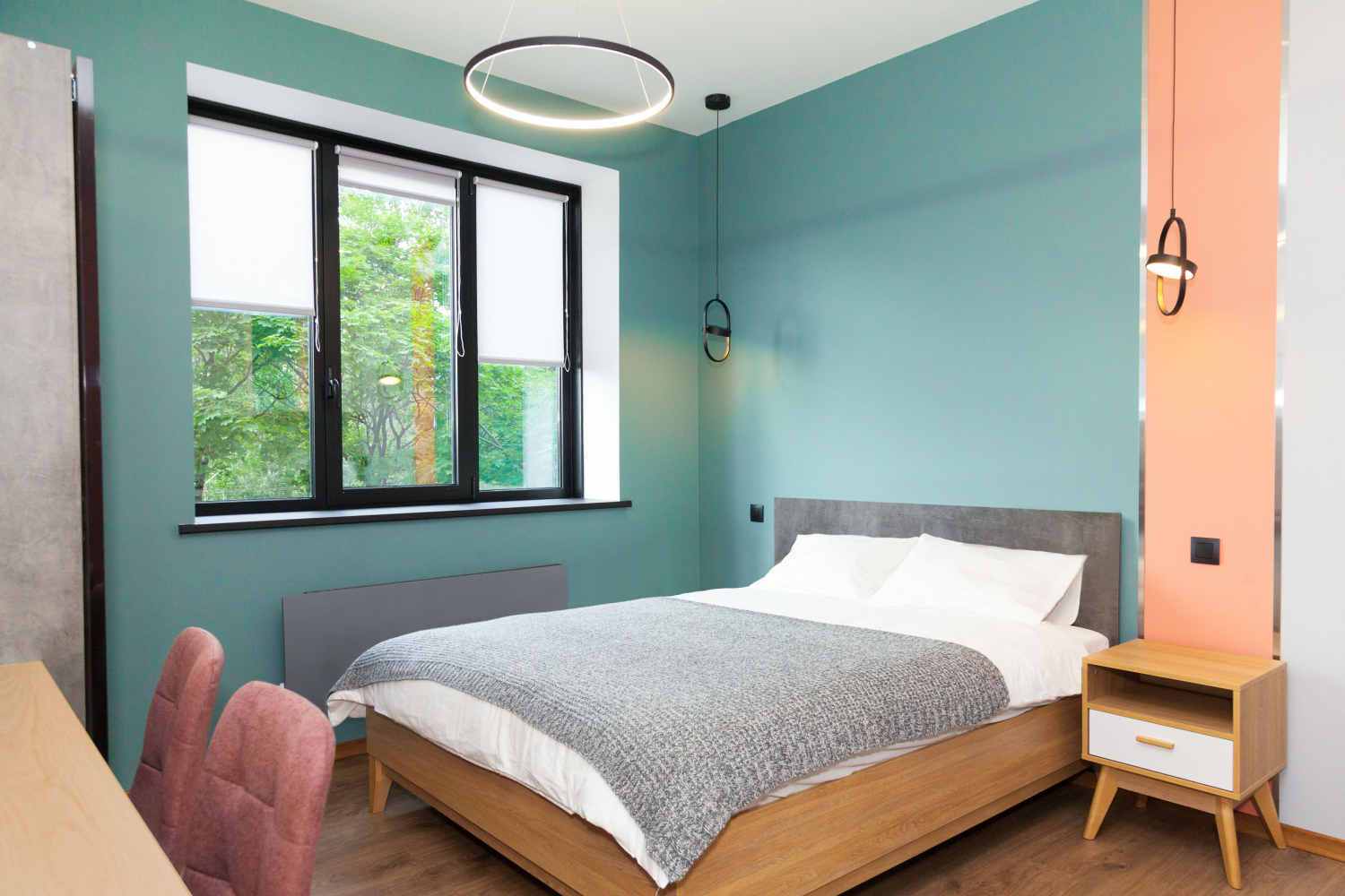 Для освещения использовали только футуристические светодиодные светильники. Стены покрасили более нежным пудровым оттенком кораллового, гармонирующим с ним пыльно-зеленым и серым цветами