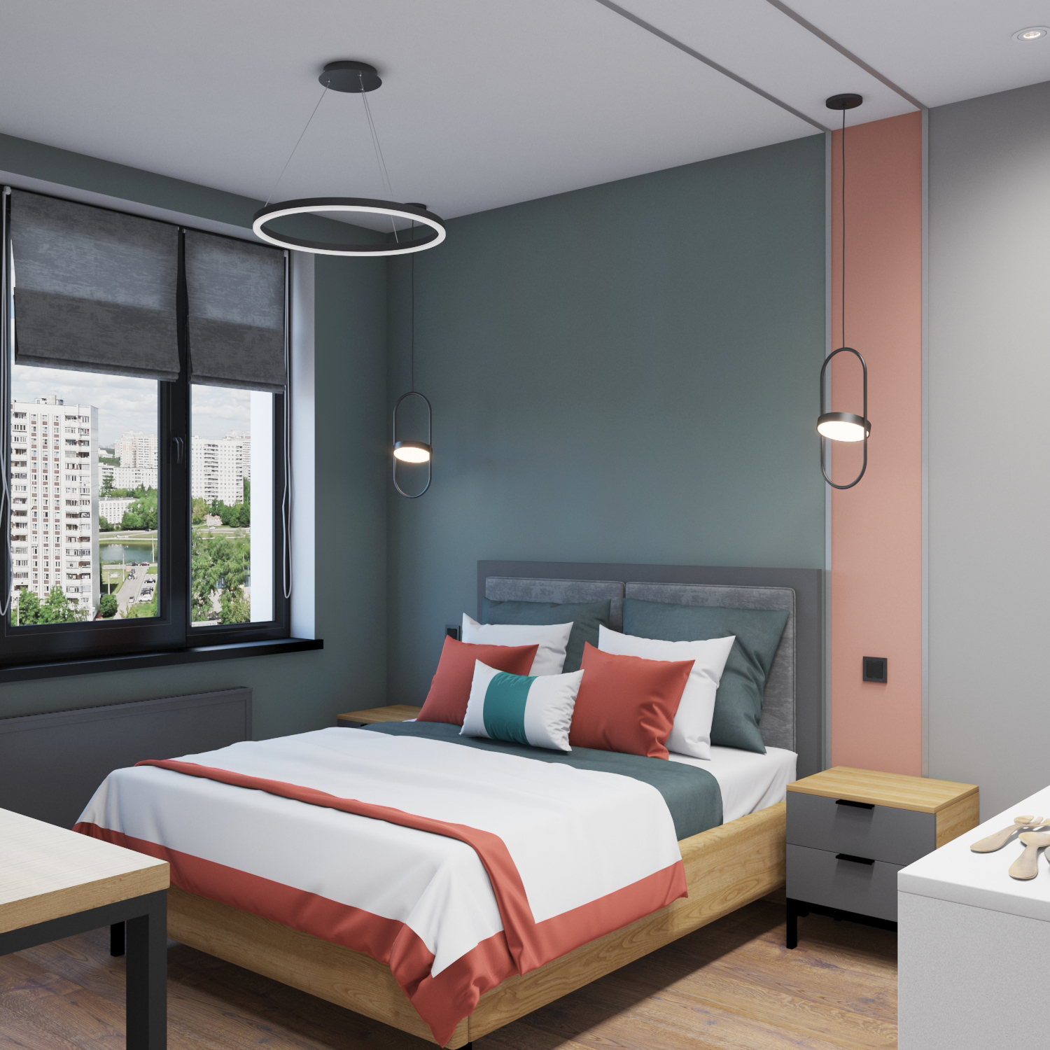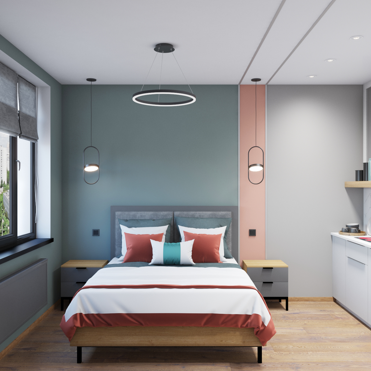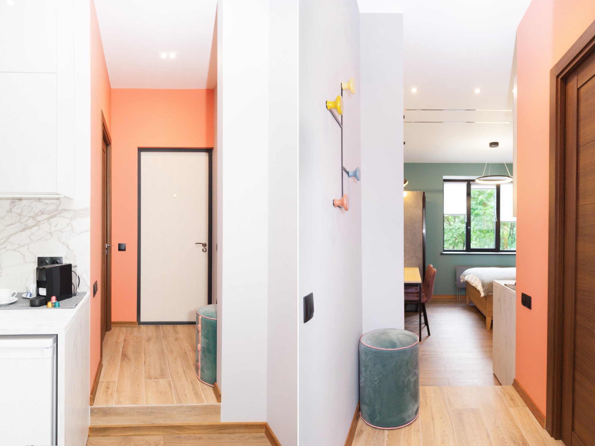 Для оформления интерьера мы решили выбрать “модные” оттенки зеленого, пудрового и кораллового цветов.