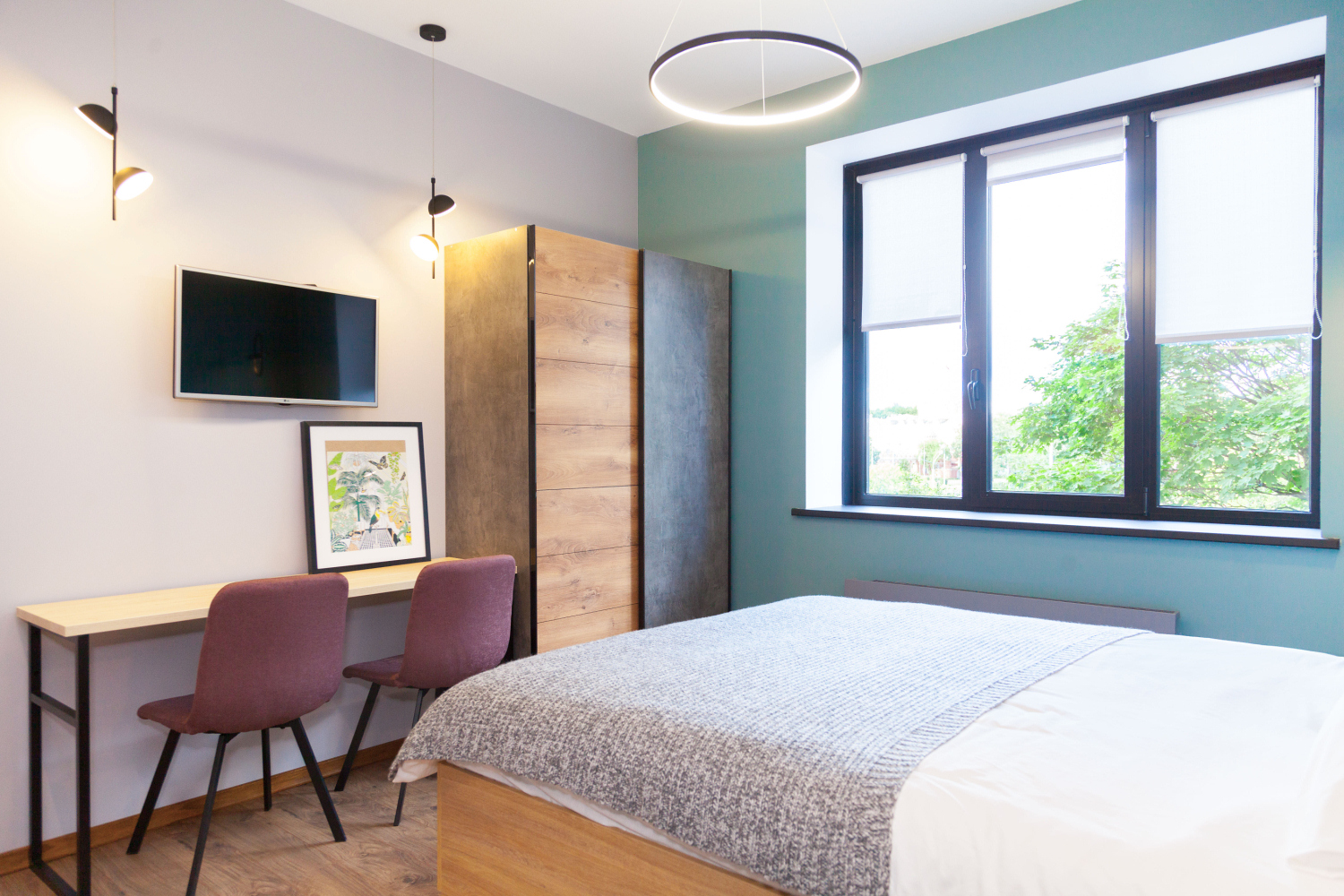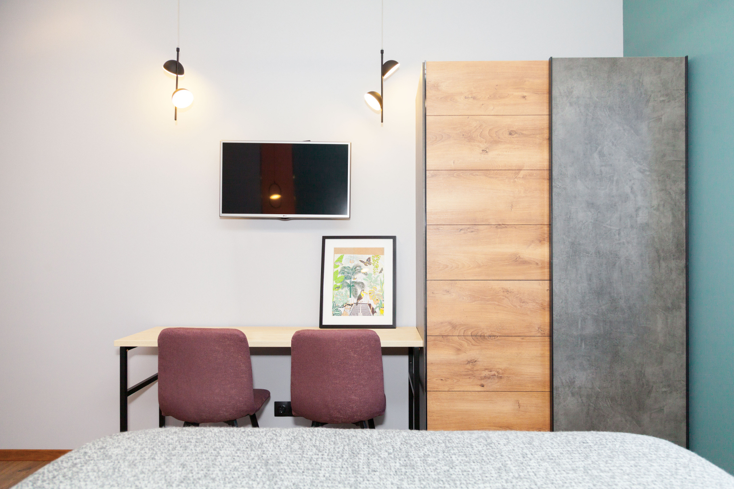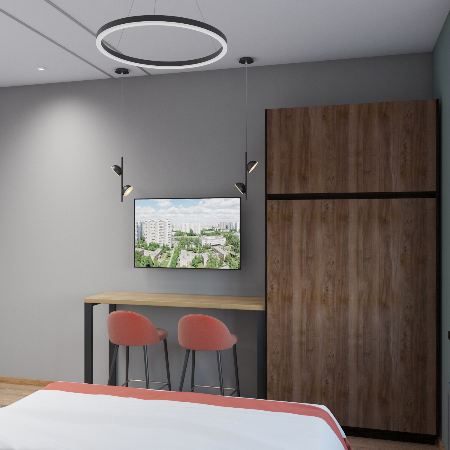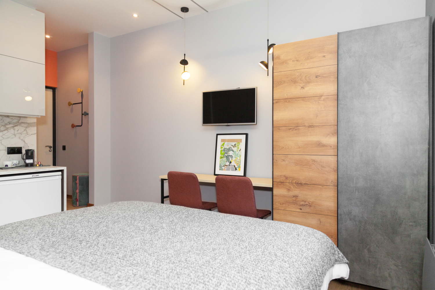 В помещении есть небольшой шкаф, пристенная полубарная стойка, кровать с двумя тумбами и телевизор