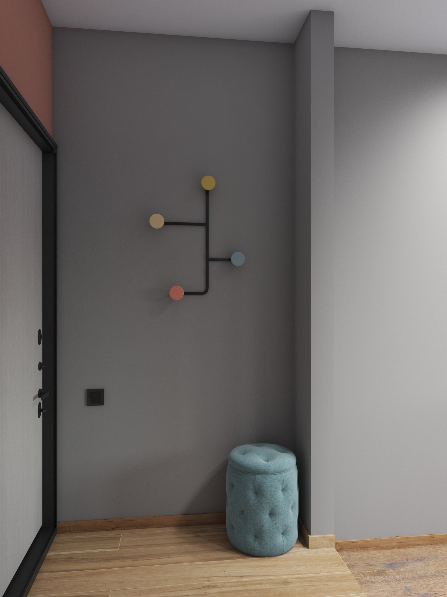 Для прихожей с приподнятым полом подобрали подходящий по цвету пуфик и необычную вешалку