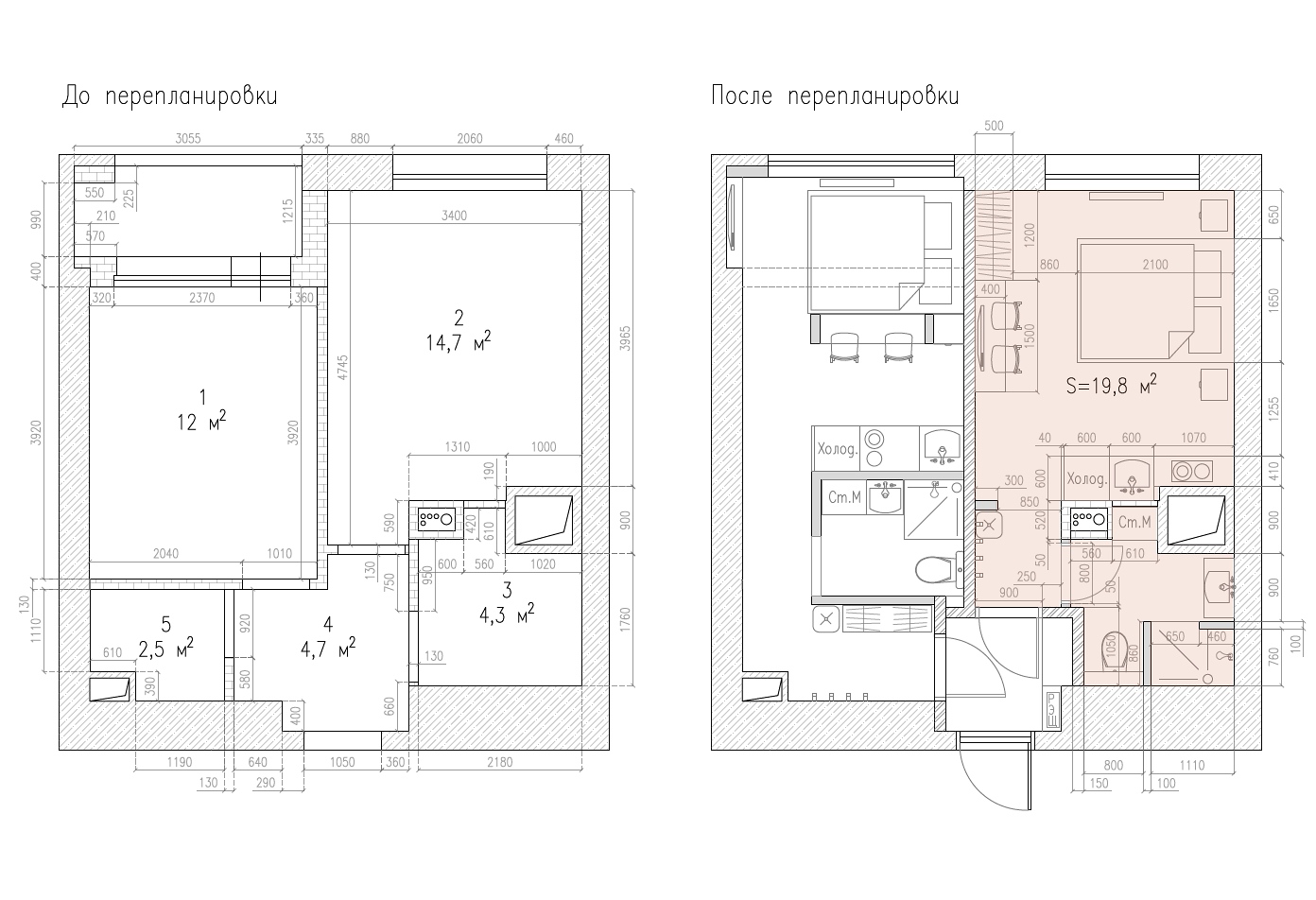 Апартаменты, купленные для сдачи в аренду посуточно, требовалось разделить на две небольшие, но оснащенные всем необходимым студии. Задачу усложняло то, что в помещении был всего один сантехнический стояк. Для того, чтобы подвести коммуникации во вторую студию, мы на 20 сантиметров подняли пол в санузле и прихожей первой студии.