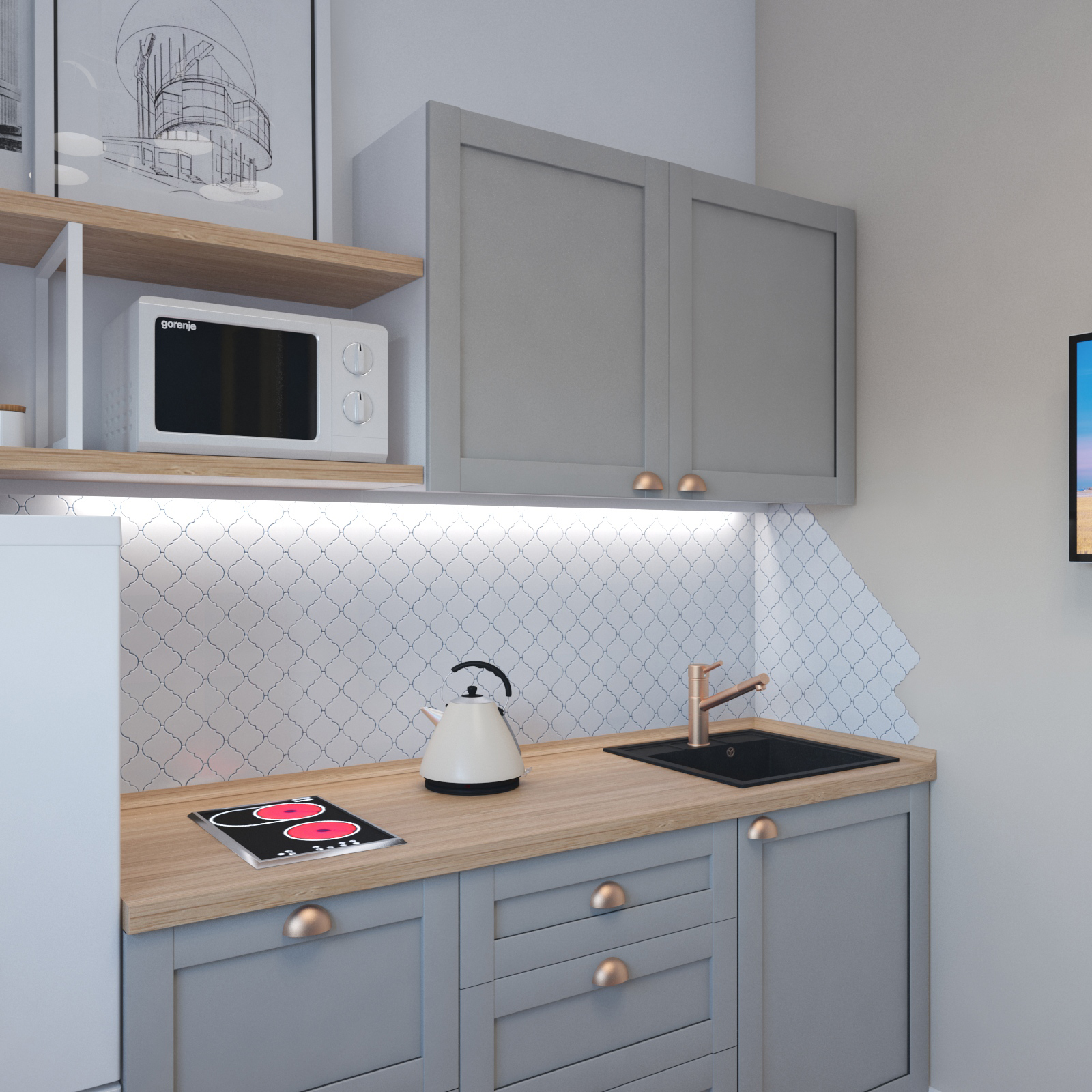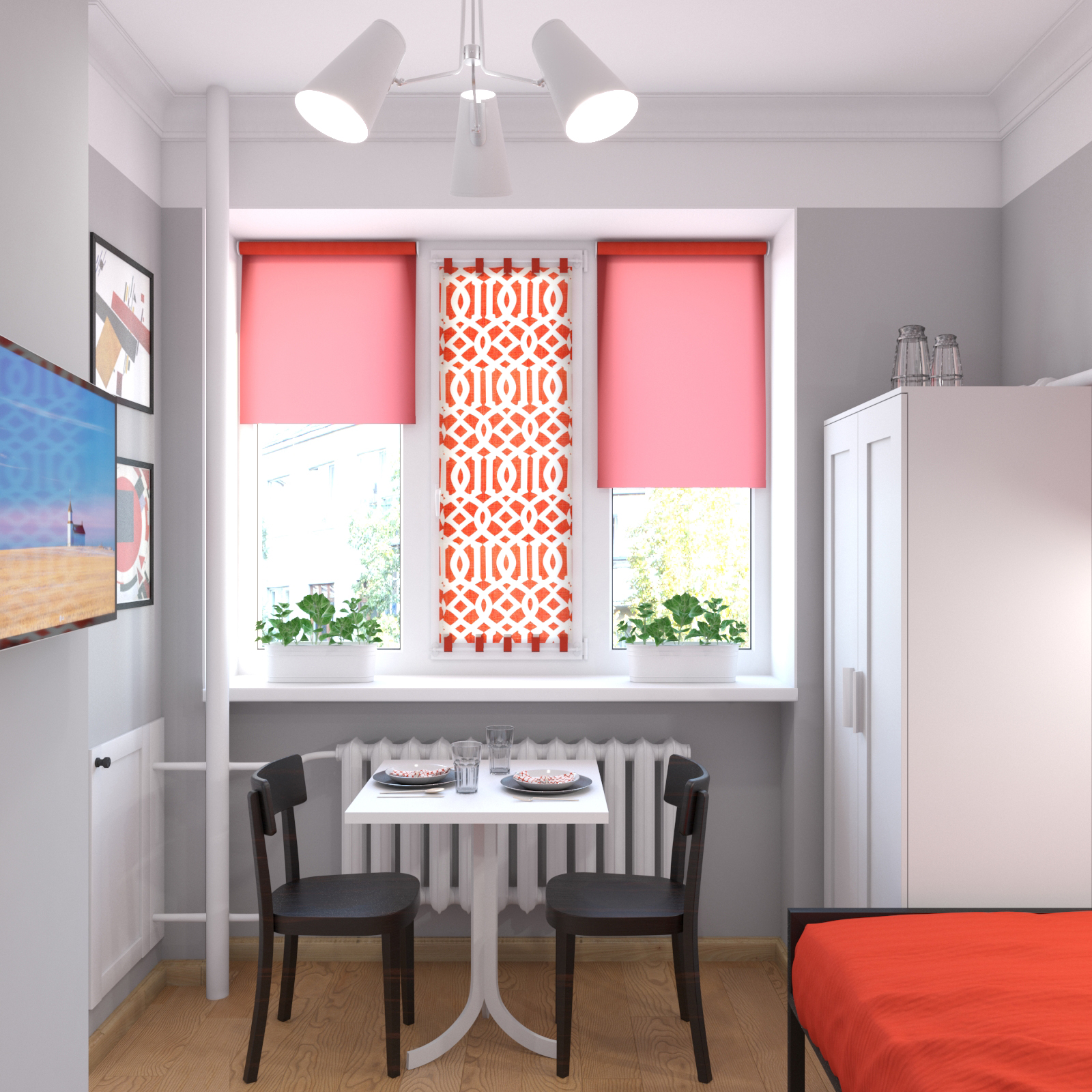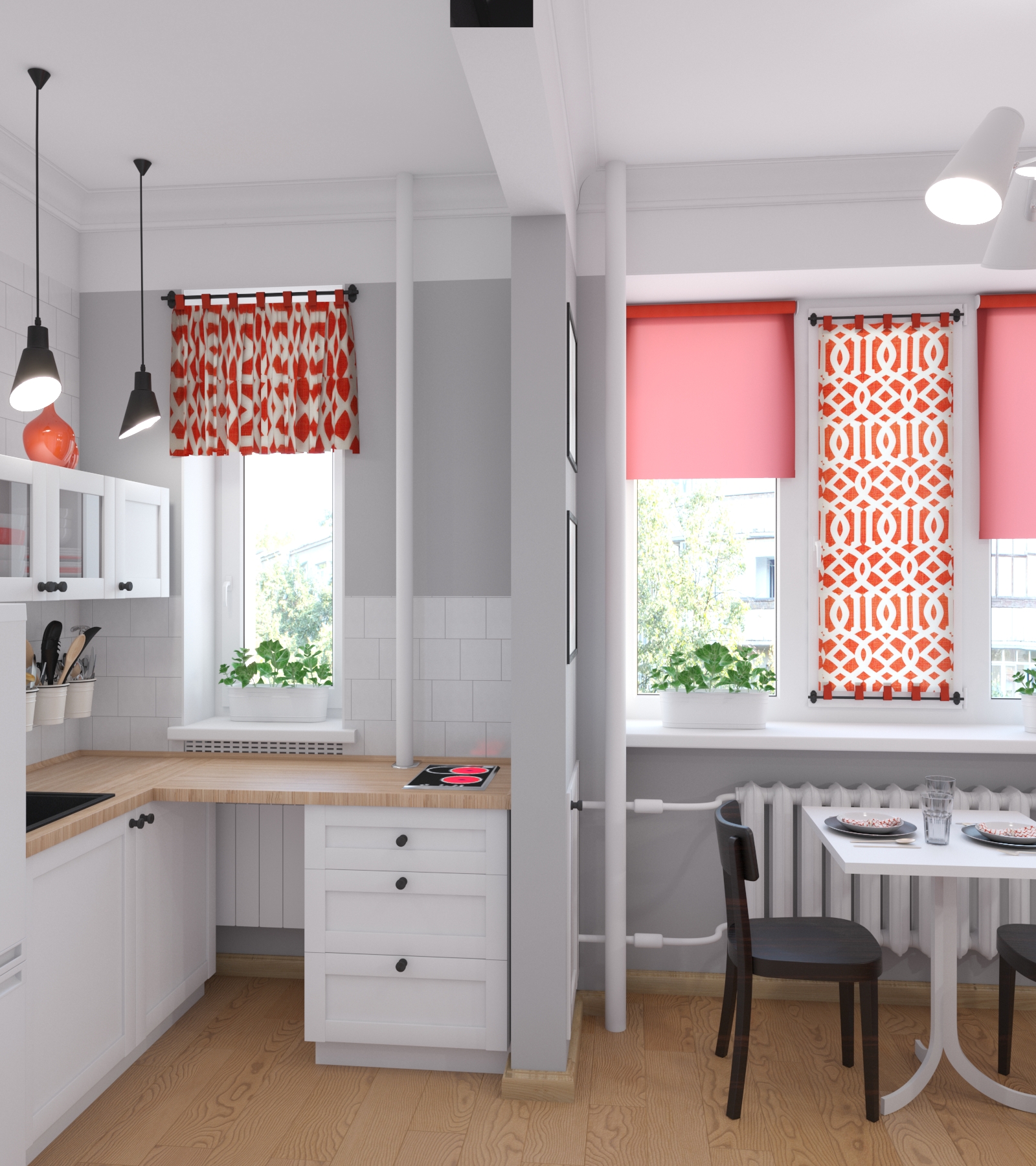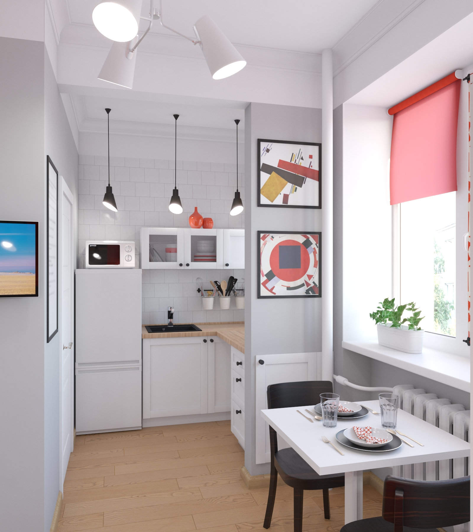 Эстетику дополняют простые рамочные фасады кухни IKEA, фартук из мелкой квадратной плитки, красные элементы декора и текстиль с авангардным рисунком, а также постеры с репродукциями Кандинского.