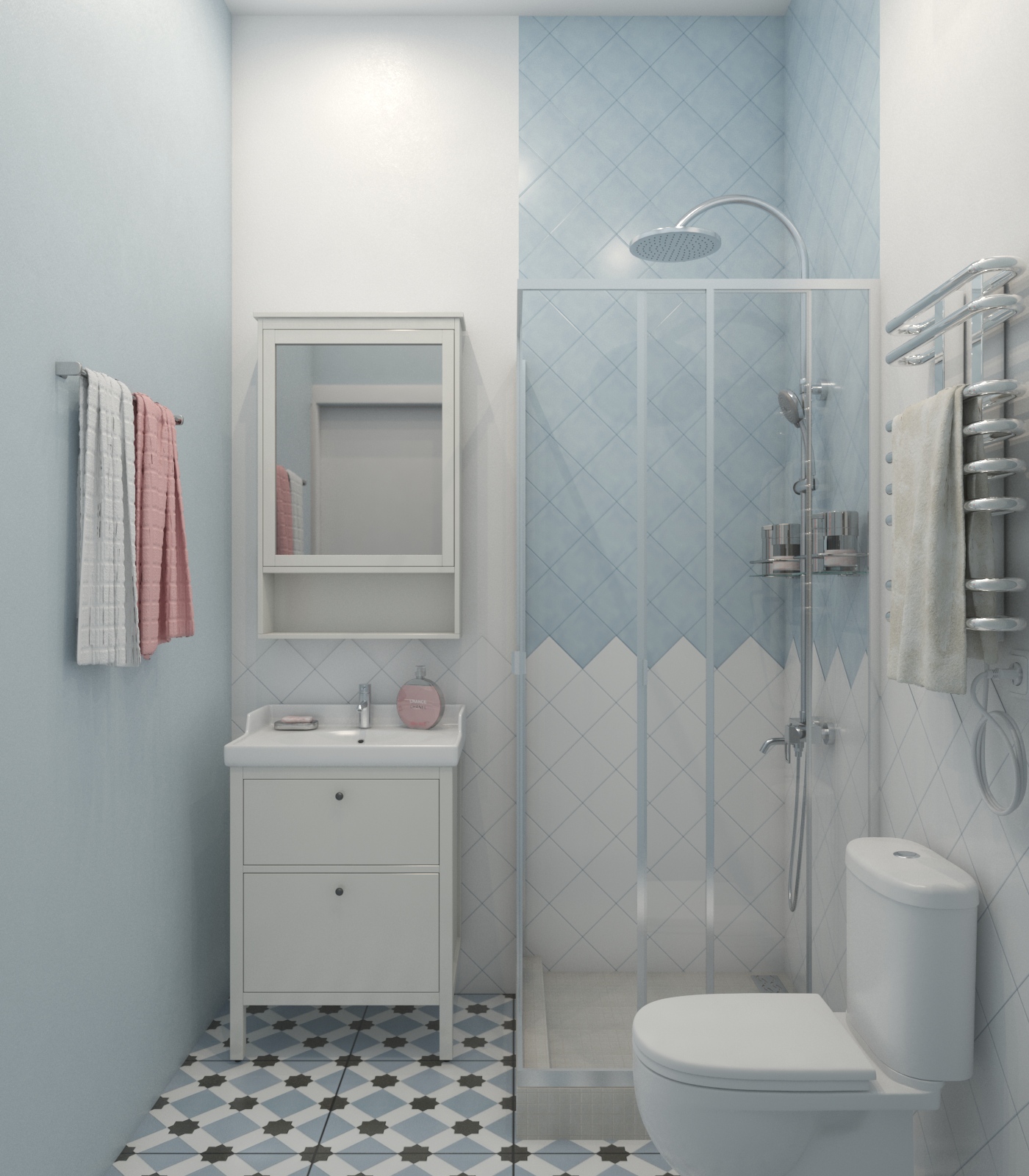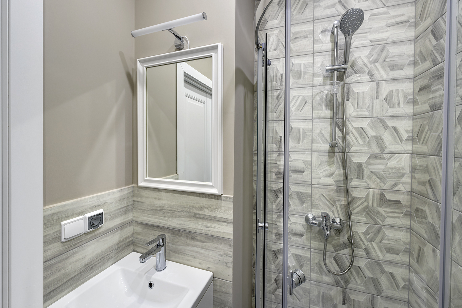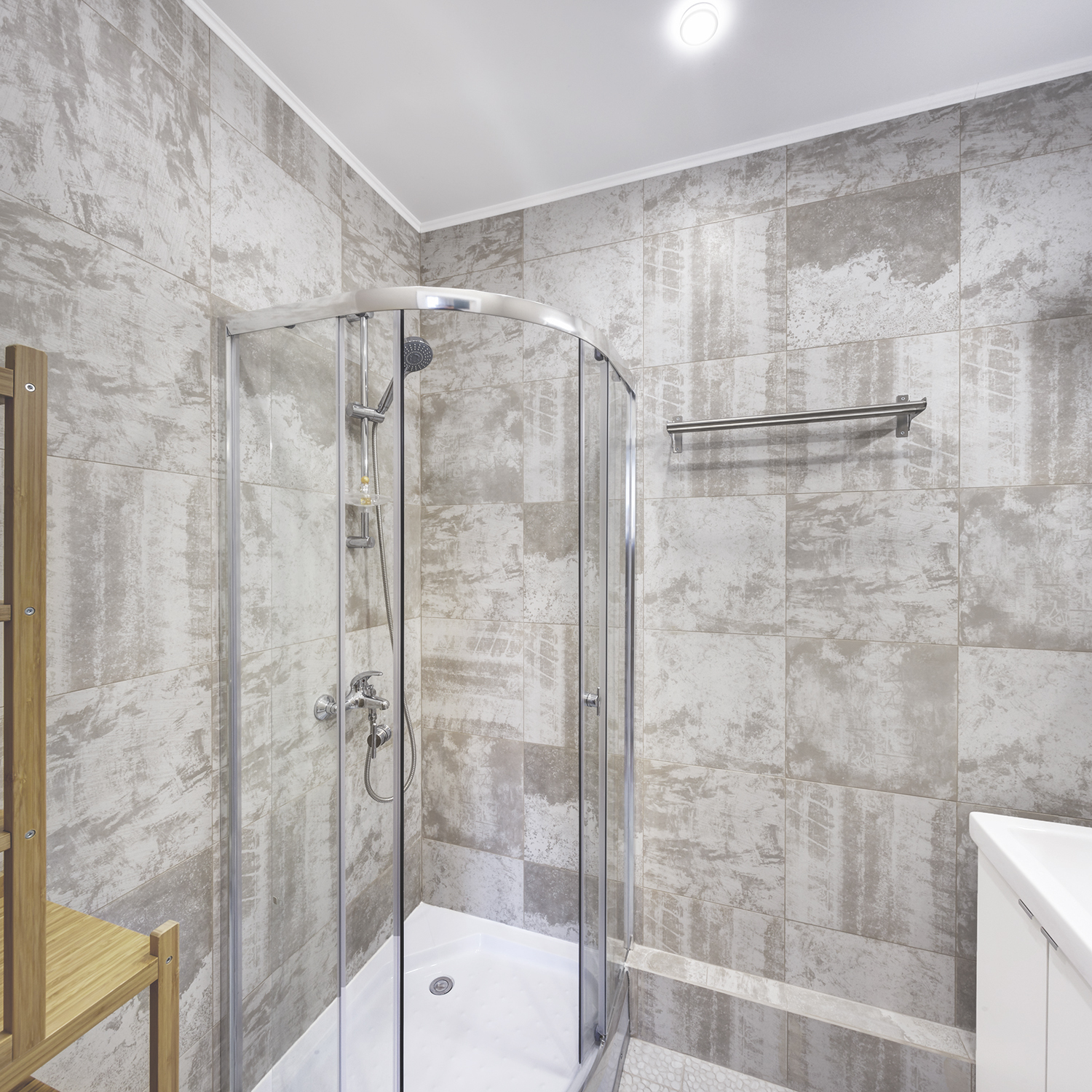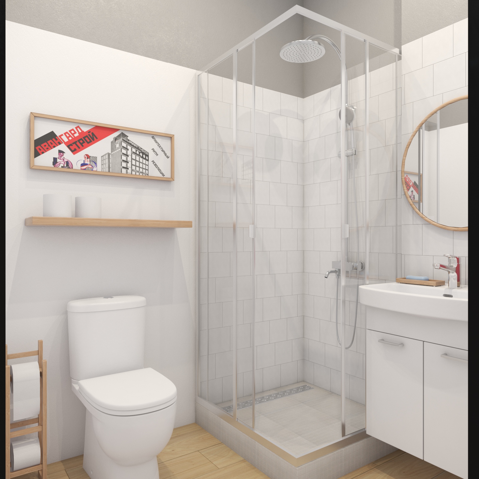 Санузел обошелся почти без настенной плитки. Она используется только для душевой ниши и в зоне над раковиной.