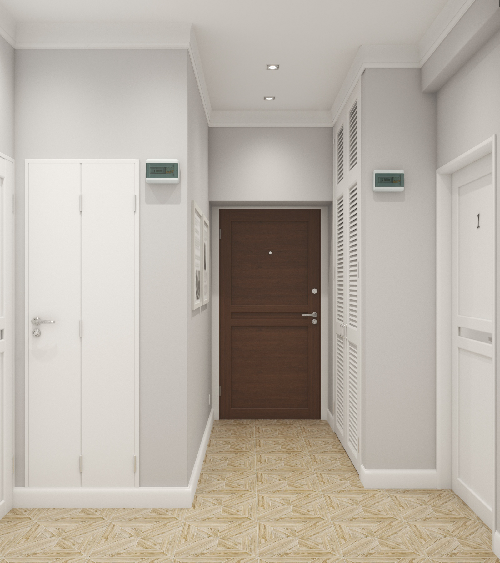 Белые двери и высокие плинтусы придают входному пространству более презентабельный и классический вид.