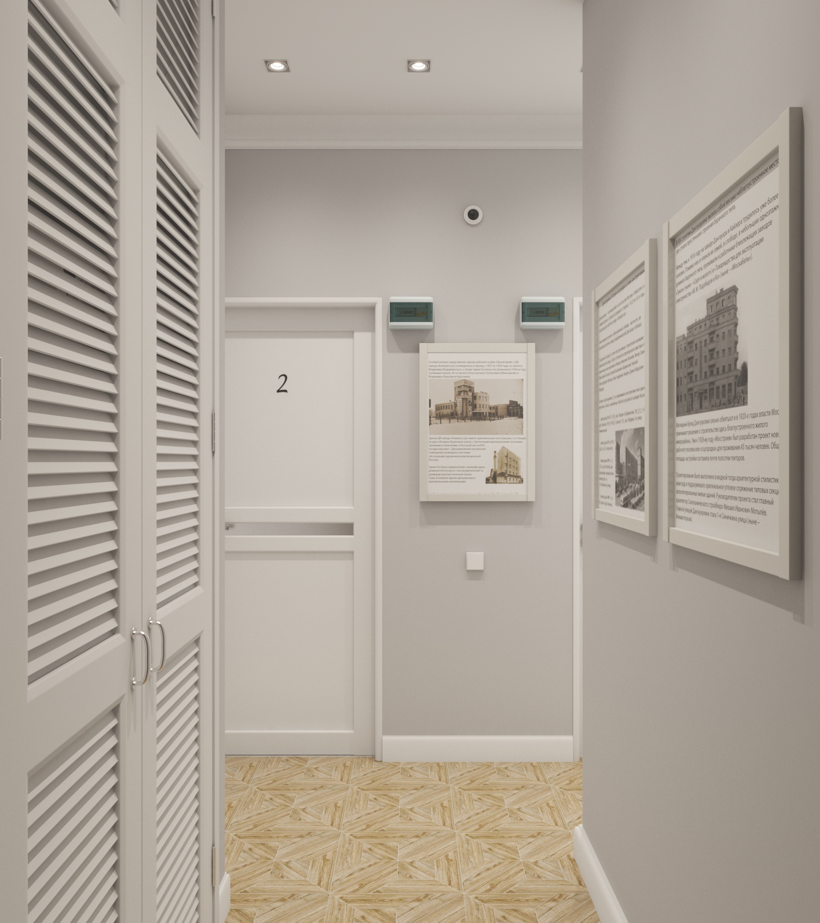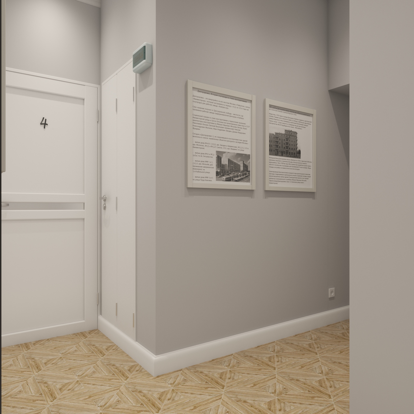 На историческую ценность здания намекает керамогранит с рисунком под паркетную укладку. Стены украшают плакаты с фотографиями и историей авангардной застройки района Дангауэровка.