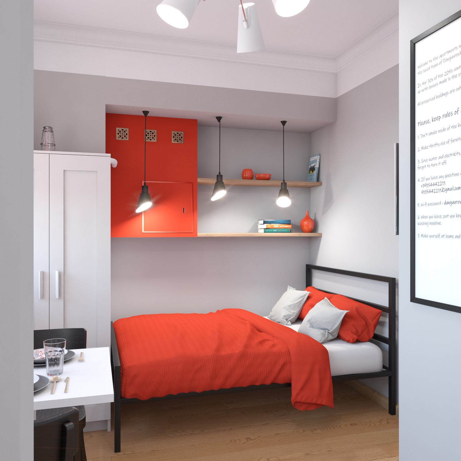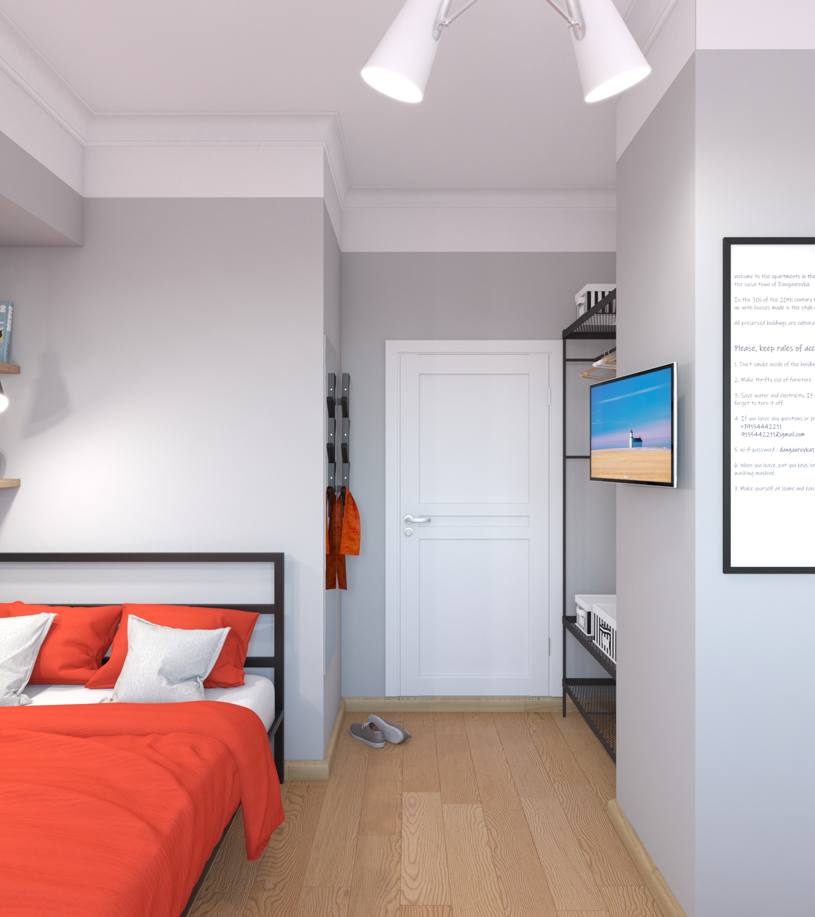 В нишу у входа, образованную вентиляционным коробом, удалось вместить открытый гардероб. Сам короб задействовали для крепления поворотного телевизионного кронштейна и плаката с правилами дома для постояльцев.