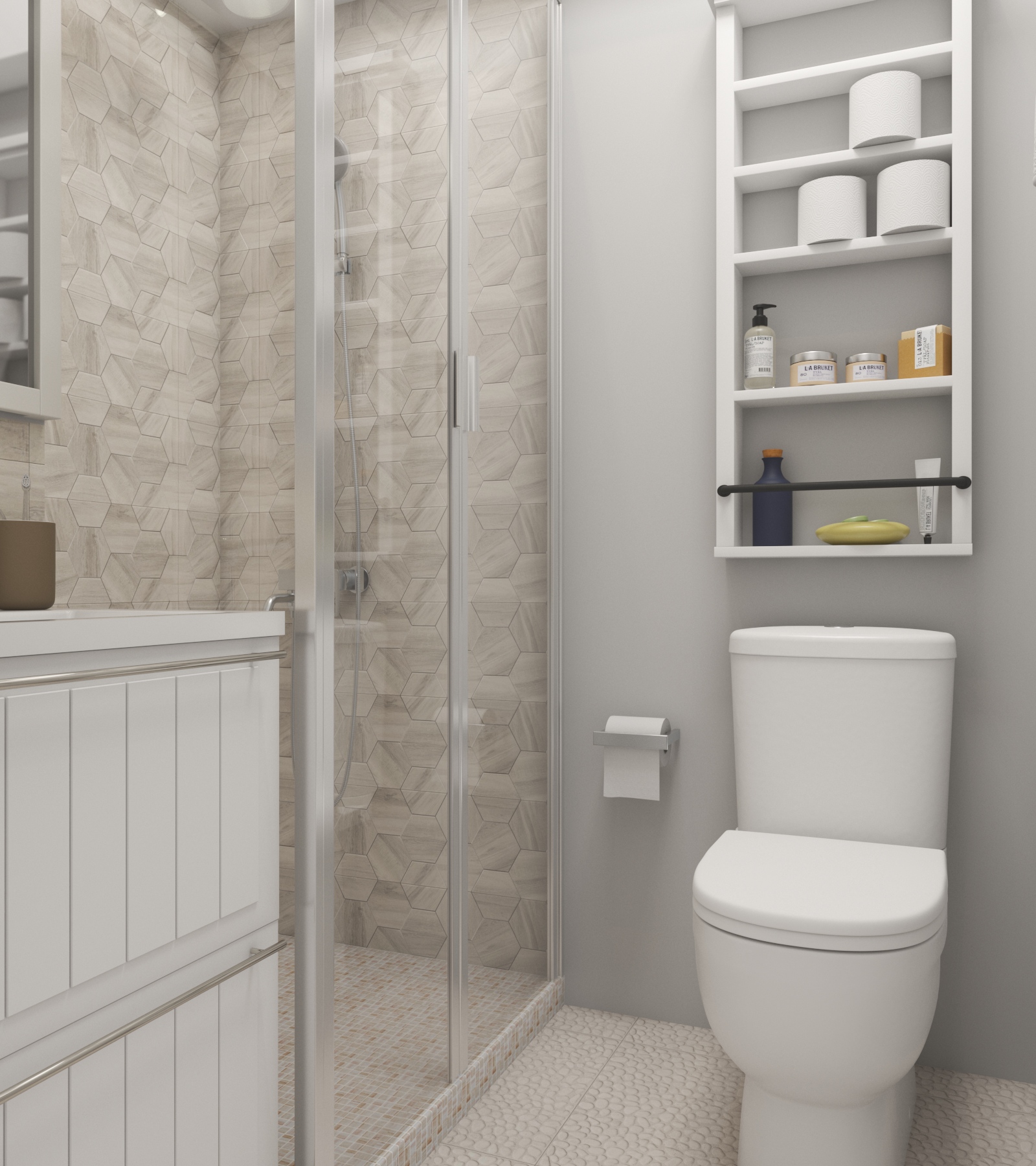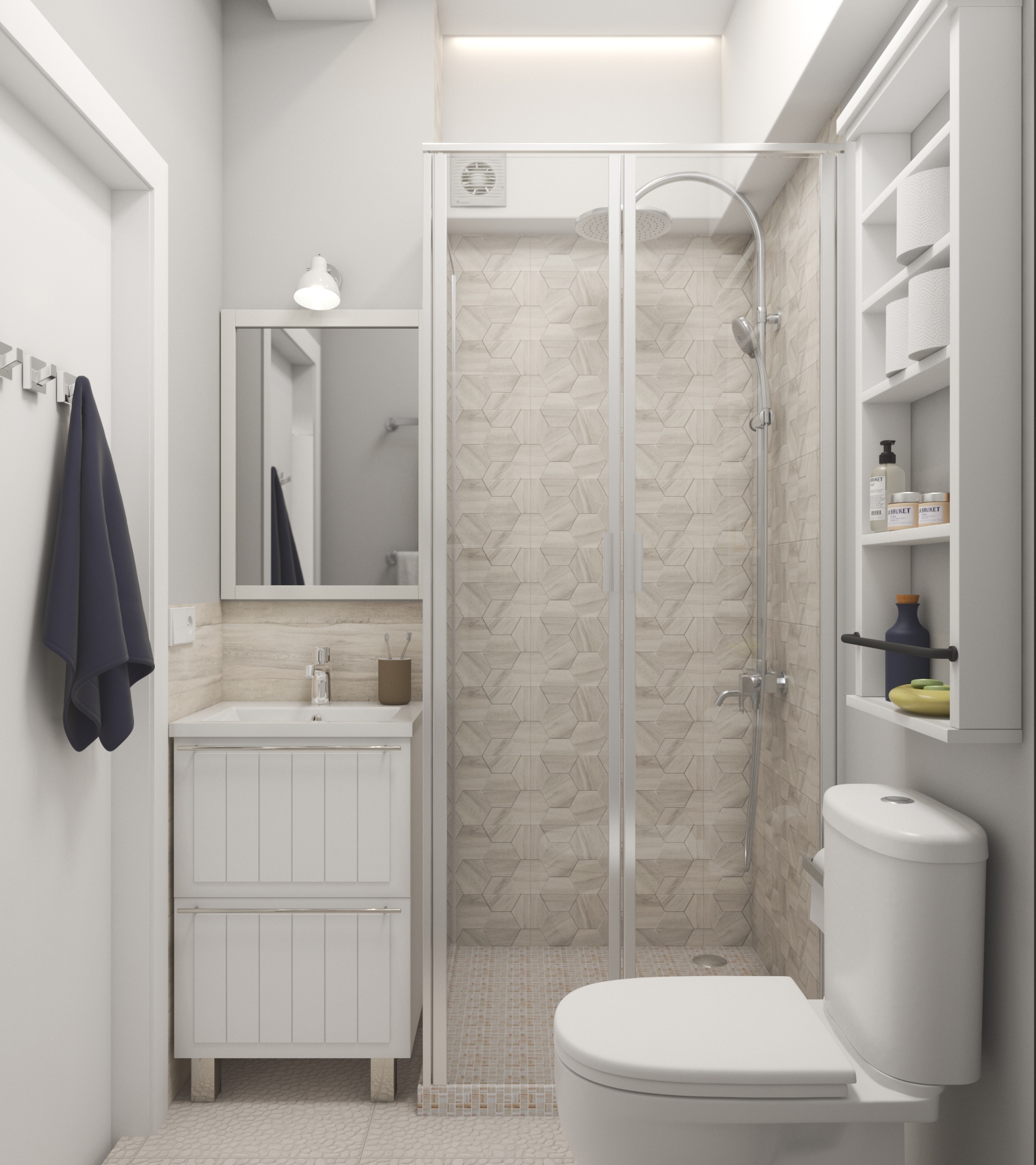 Место над унитазом задействовано для хранения ванных принадлежностей