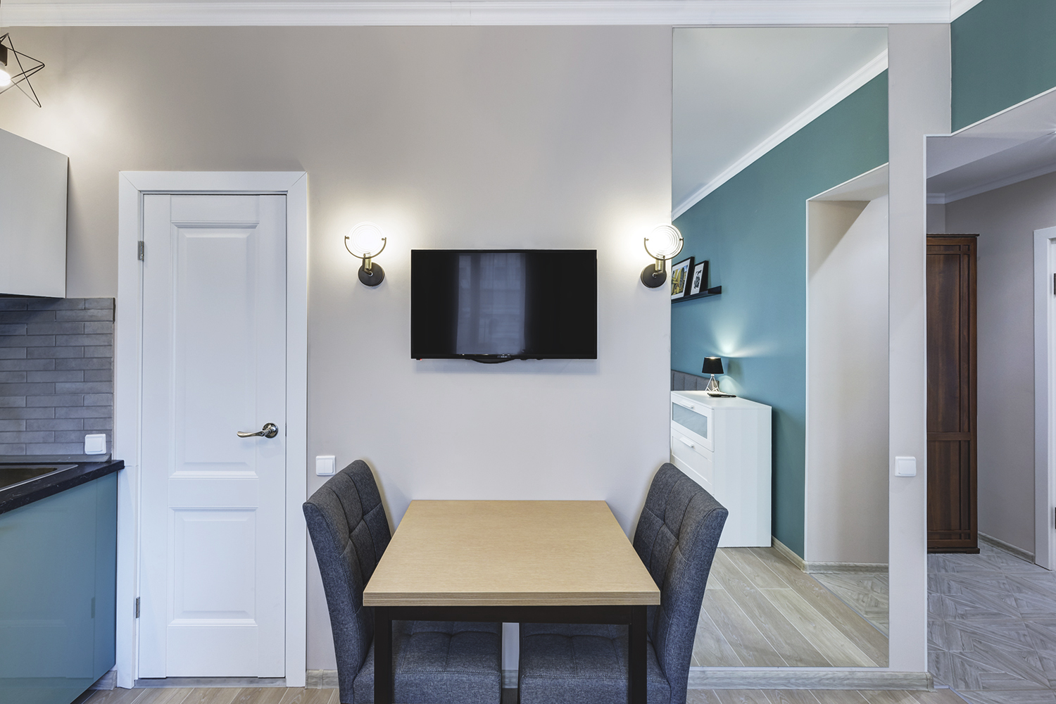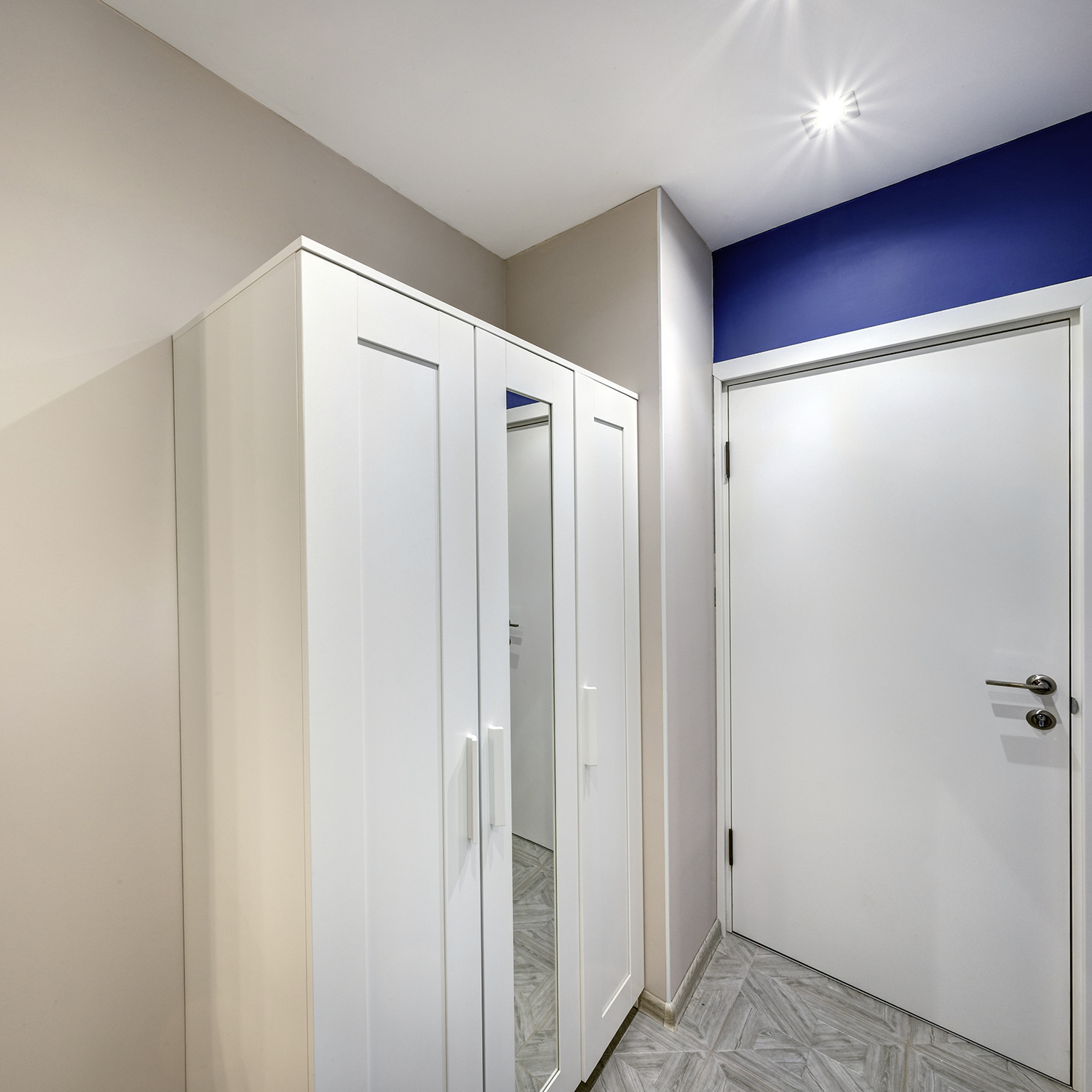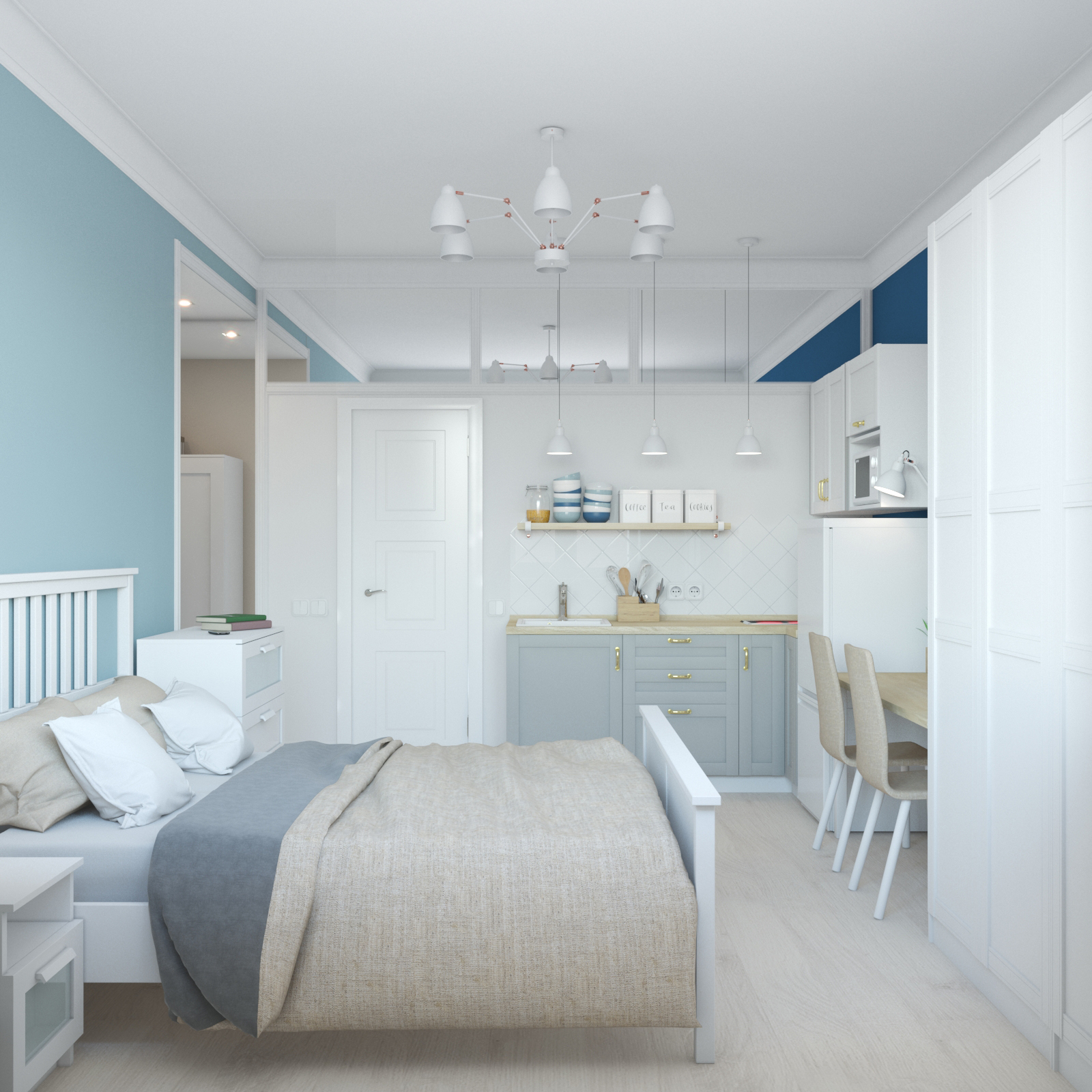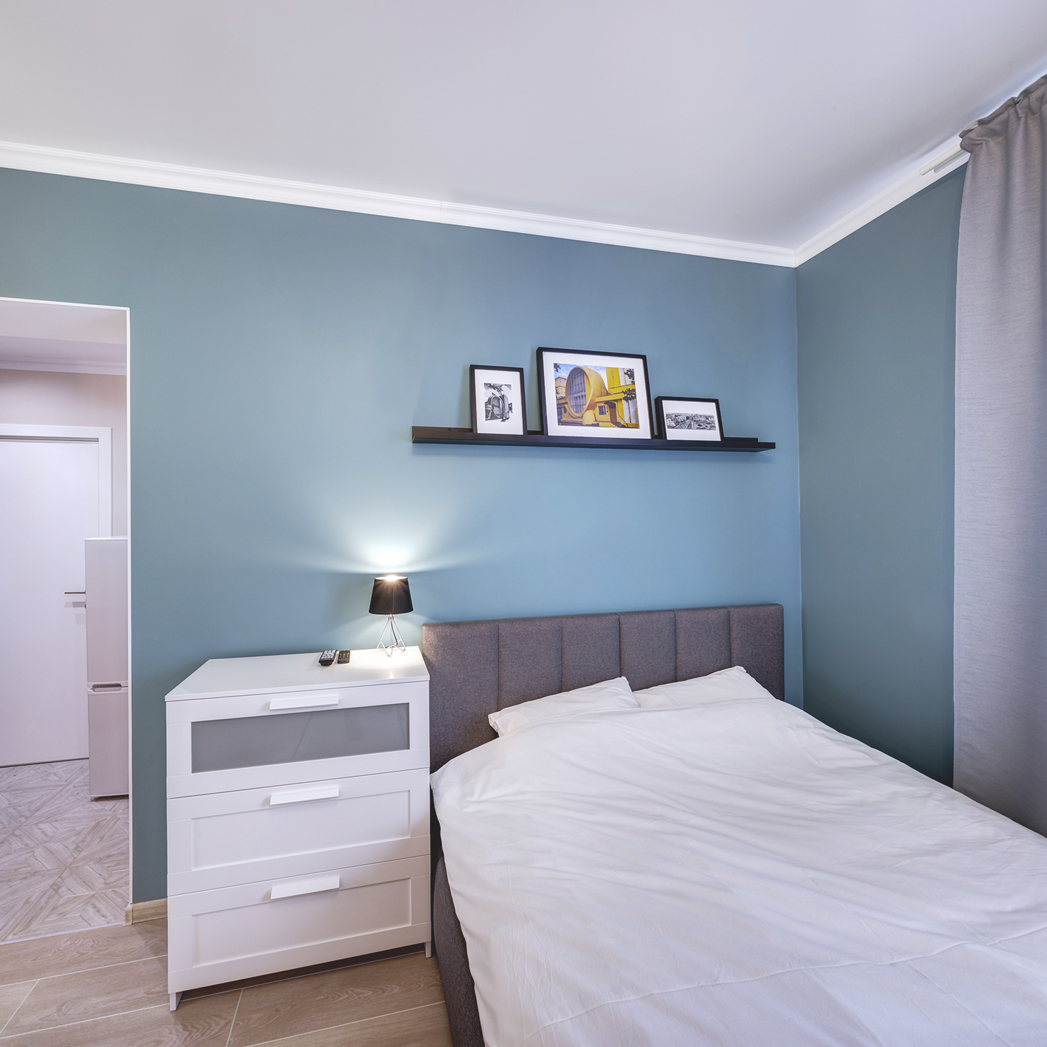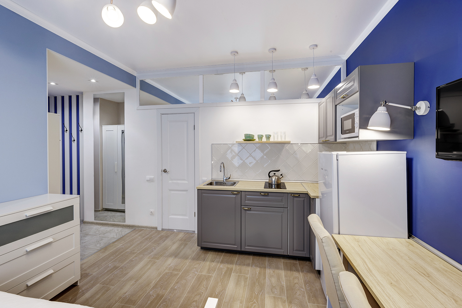 Третья студия оформлена в оттенках синего с использованием неоклассических приемов. Зеркала и проемы обрамлены молдингами, которые не только придают им завершенный вид, но и выполняют защитную функцию на углах.