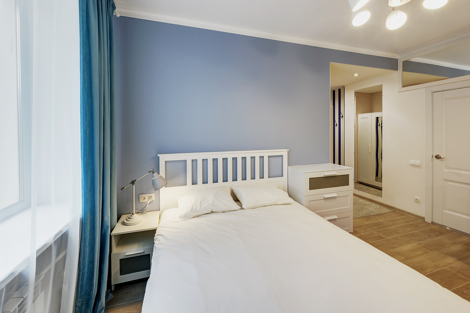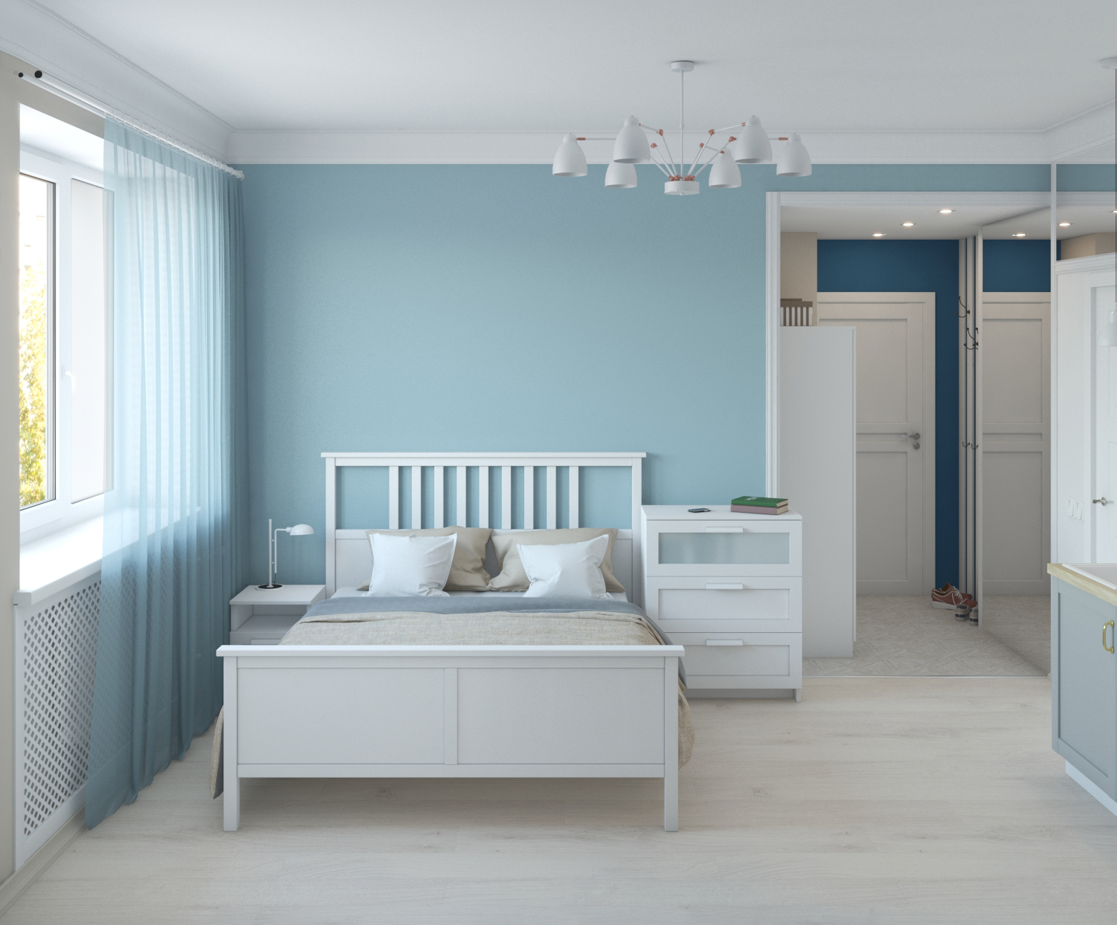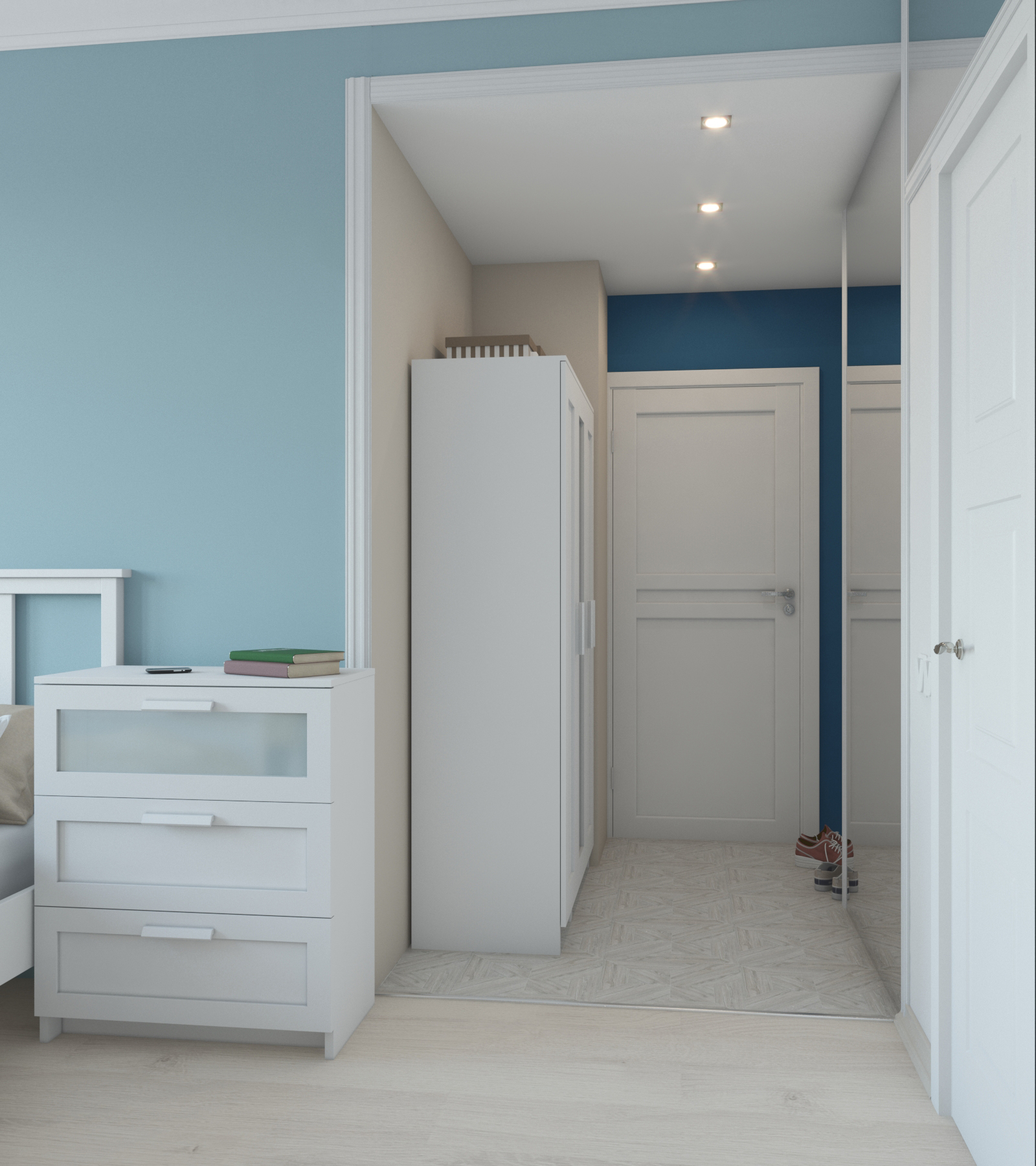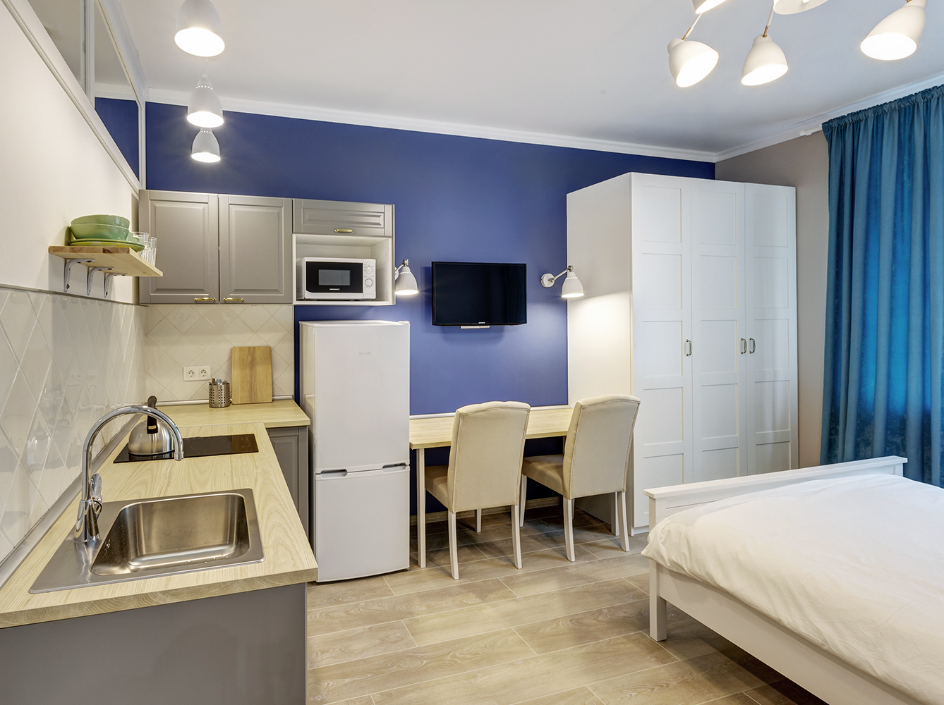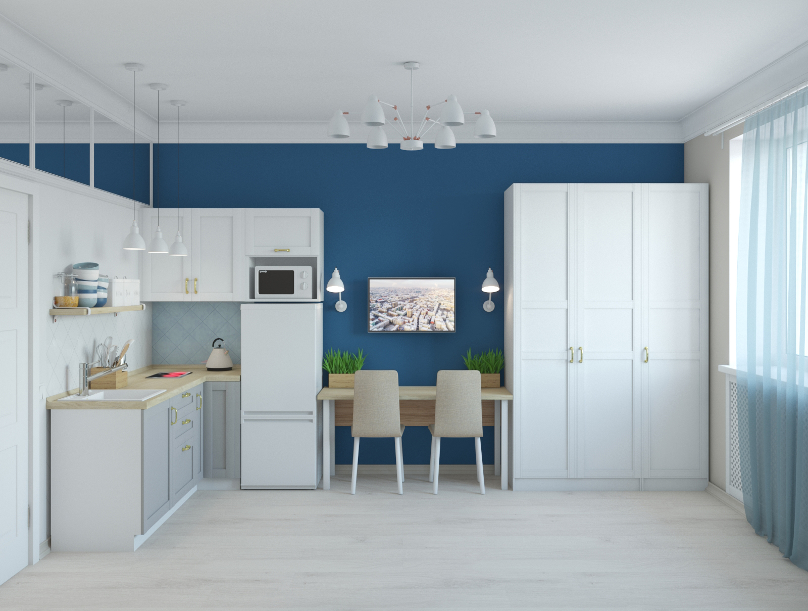 Третья студия оформлена в оттенках синего с использованием неоклассических приемов. Зеркала и проемы обрамлены молдингами, которые не только придают им завершенный вид, но и выполняют защитную функцию на углах.