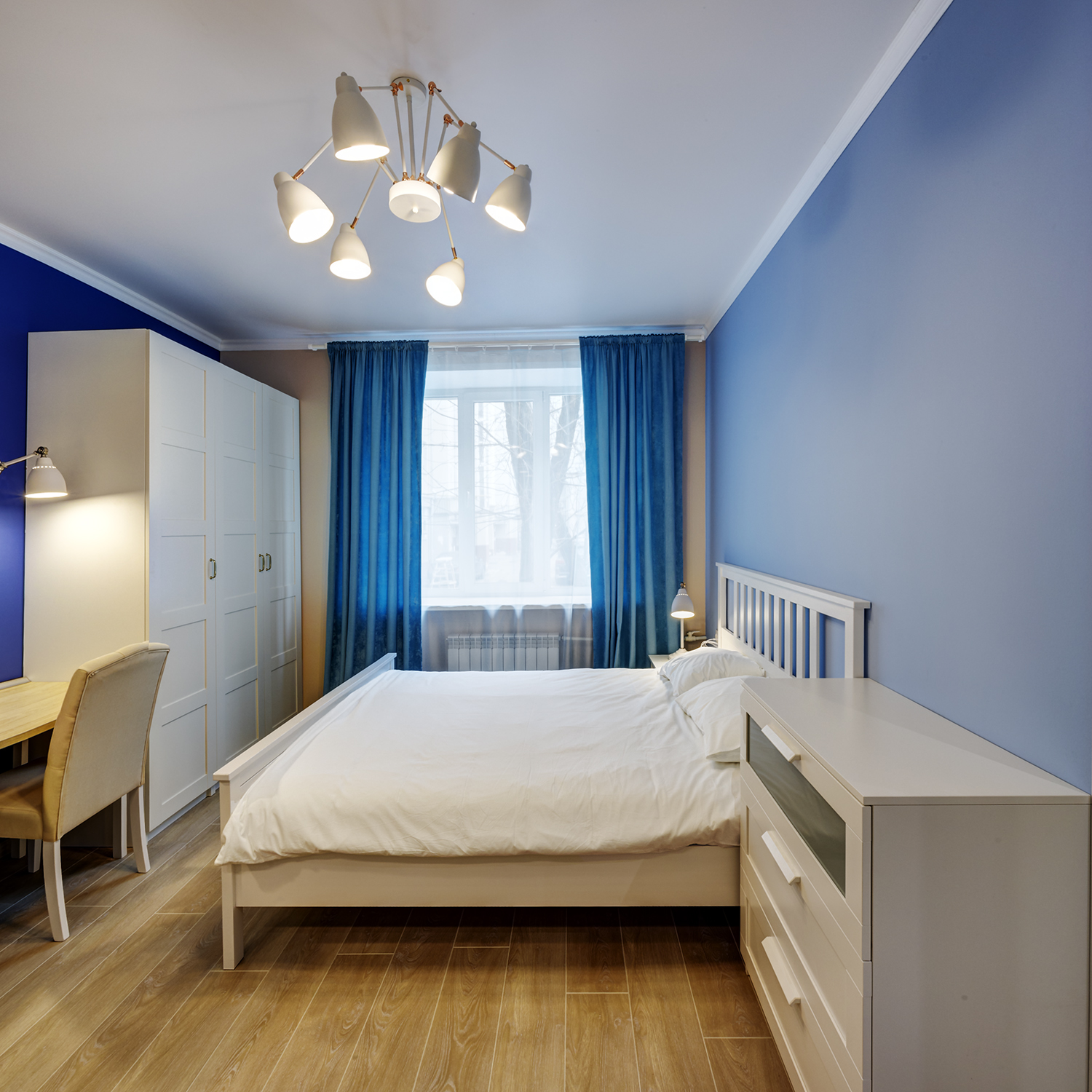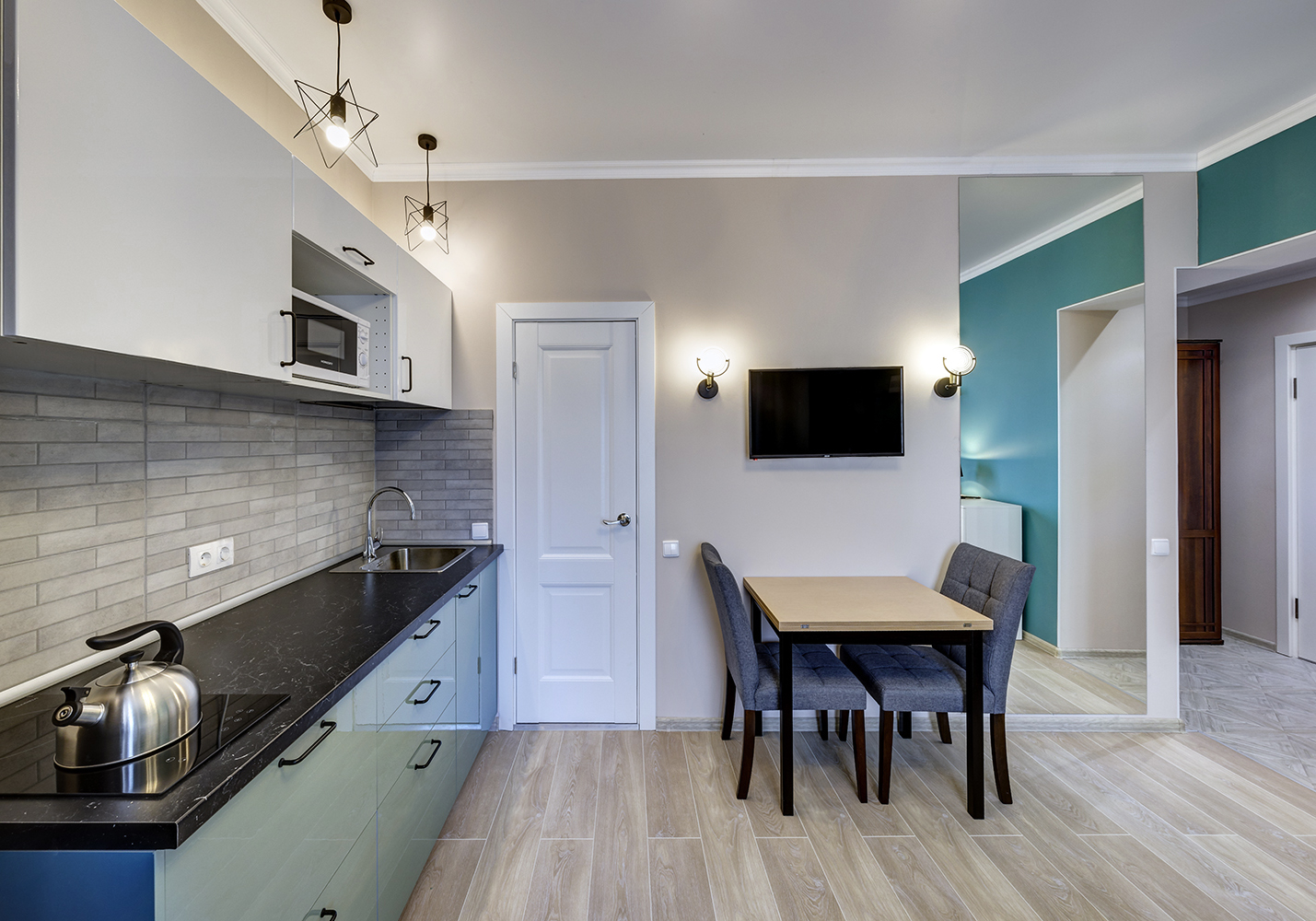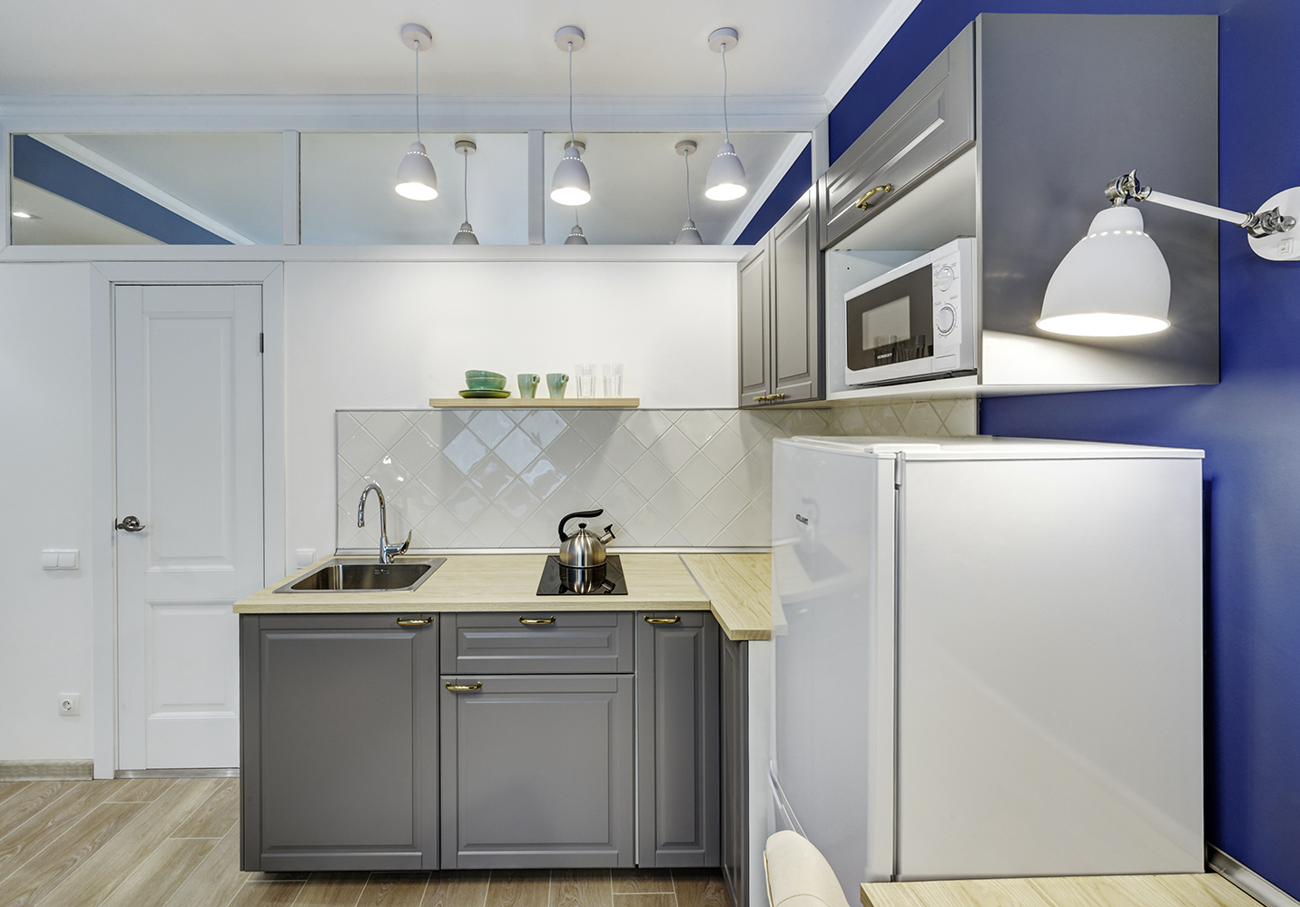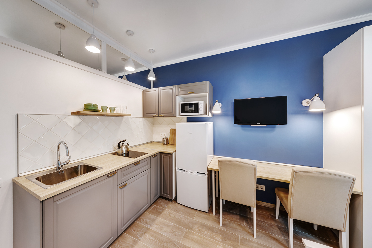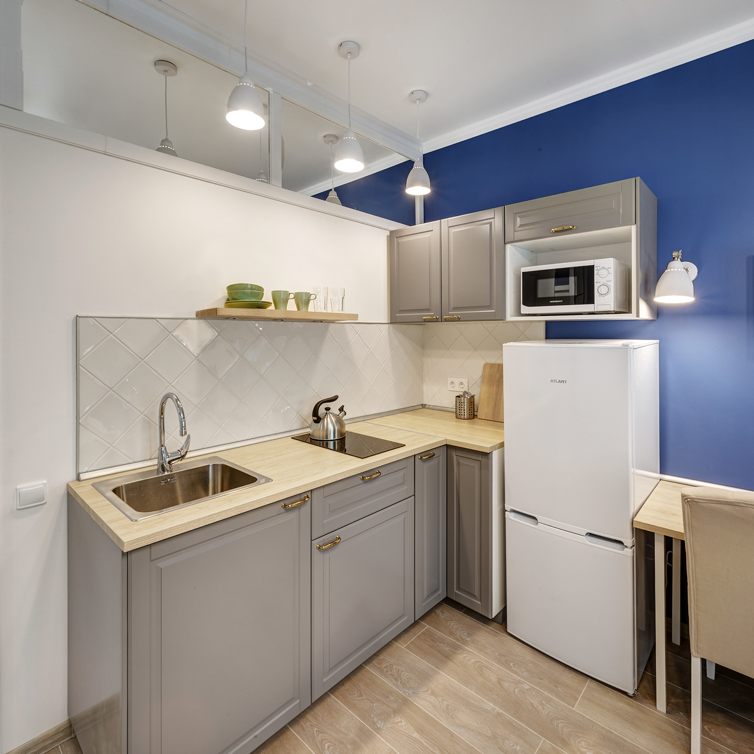 Третья студия оформлена в оттенках синего с использованием неоклассических приемов. Зеркала и проемы обрамлены молдингами, которые не только придают им завершенный вид, но и выполняют защитную функцию на углах.